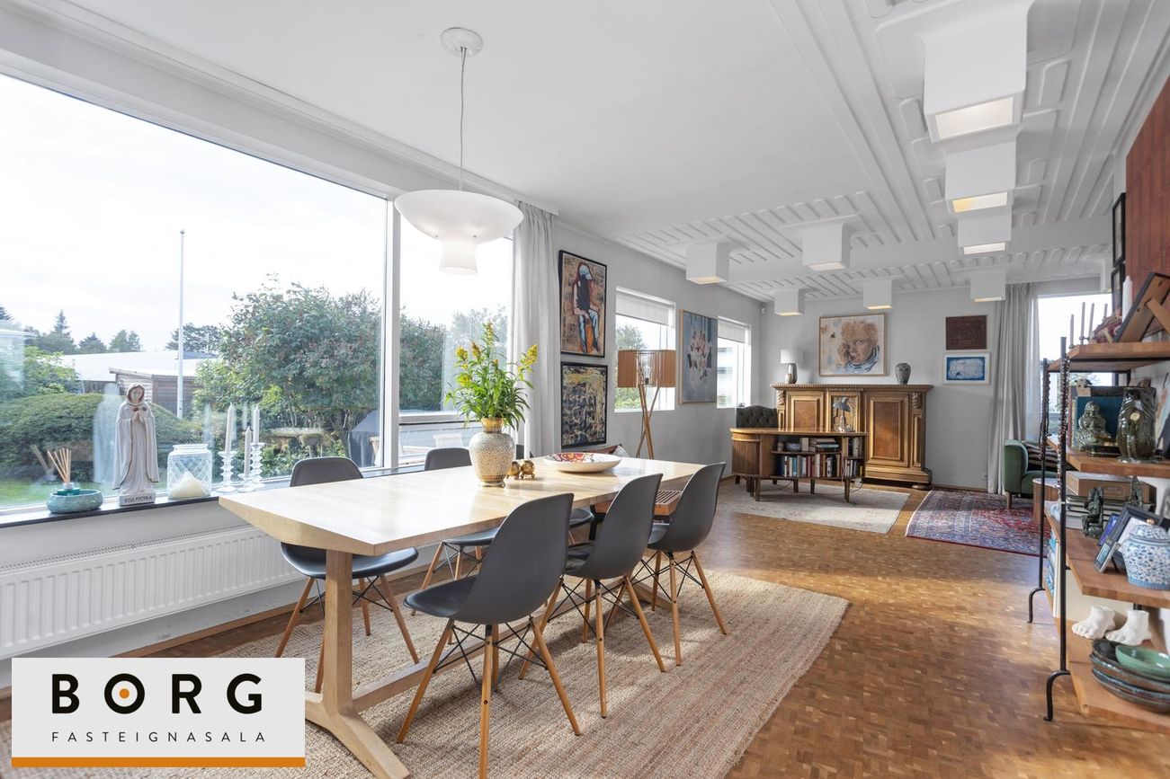 Borðstofan og stofan “sérhannaður seventís skúltúr” í loftinu, sem gerir þessi rými einstök. Stórir gluggar í suður og vestur.