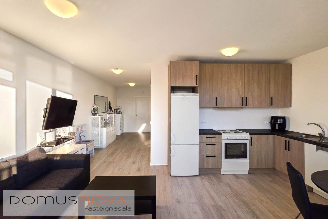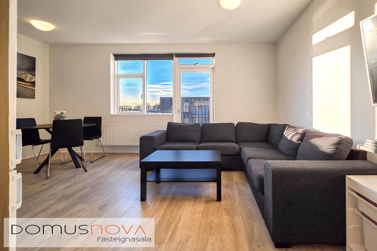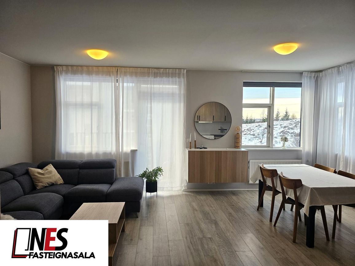 Eldhús/stofa: Eldhús, stofa og borðstofa mynda rúmgott og bjart alrými. L-laga eldhúsinnrétting úr eik, með dökkri borðplötu og svörtum höldum, með efri og neðri skápum, tengi fyrir uppþvottavél. Útgengt út á svalir með fallegu útsýni. Parket á gólfi.