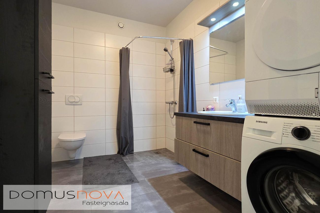Baðherbergi: Snyrtilegt baðherbergi með eikar innréttingu og dökkri borðplötu. Upphengt salerni. Sturta sem gengið er beint inn. Sturtuhengi. Tengi fyrir þvottavél og þurrkara. Hvítar veggflísar á tveimur hliðum, hinar málaðar. Dökkar flísar á gólfi.