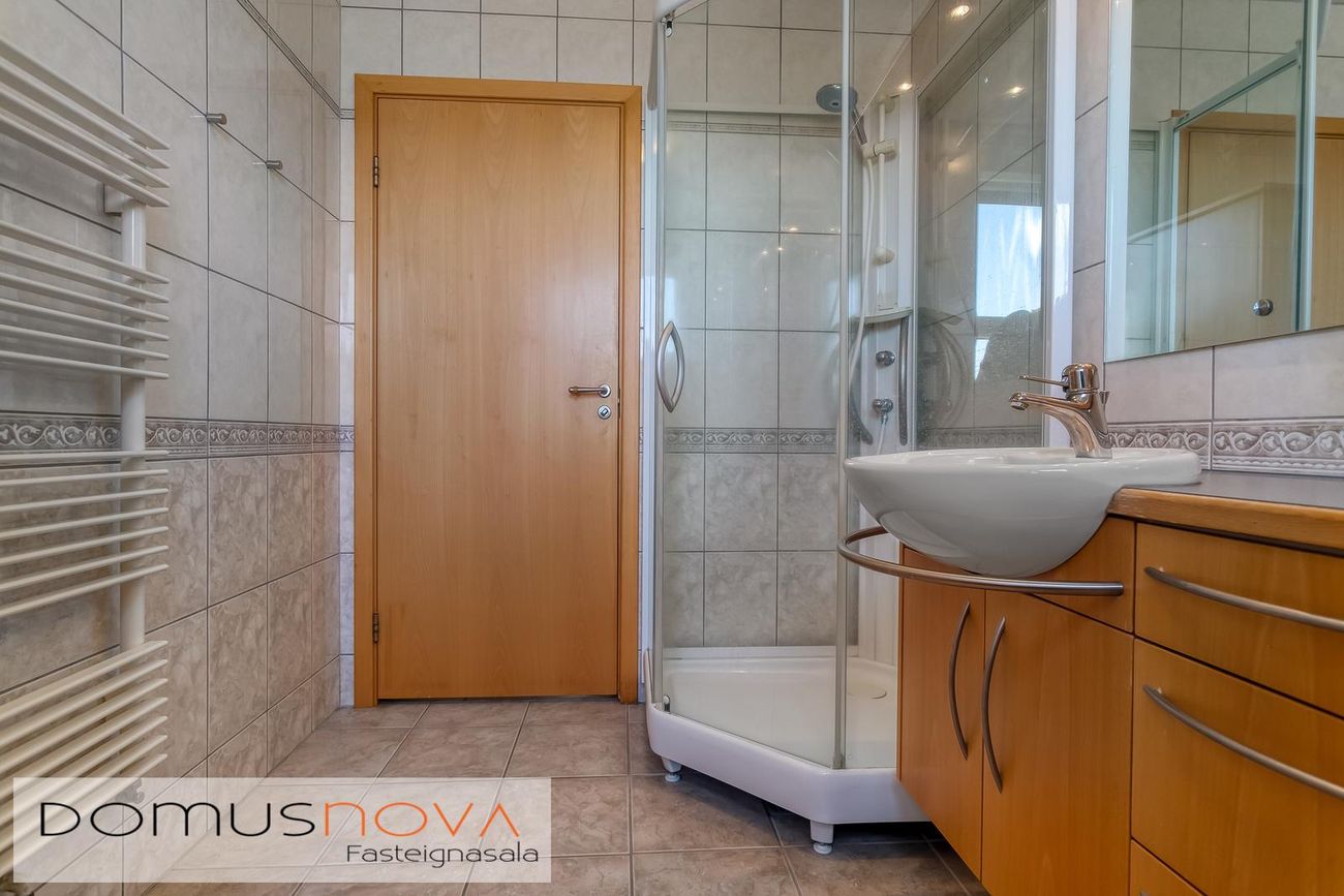 Baðherbergi, flísar á gólfi og veggjum, ljós viðarinnrétting, sturta, handklæðaofn. Gólfhitalögn.