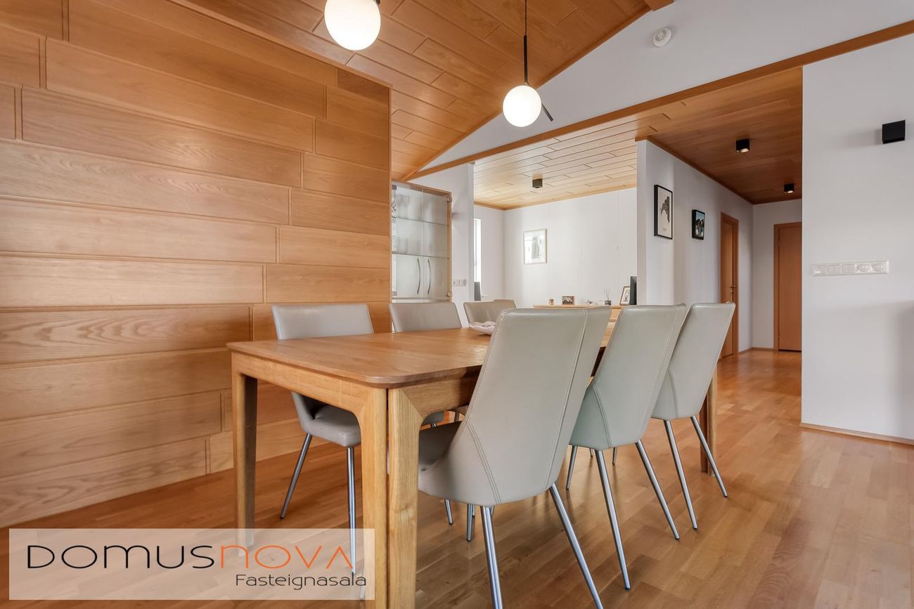 parketi á gólflum. Eldhús, innrétting úr beiki, keramik helluborð, veggofn, háfur, innfelld uppþvottavél og ísskápur (helluborð, ofn og uppþvottavél endurn. 2023.)