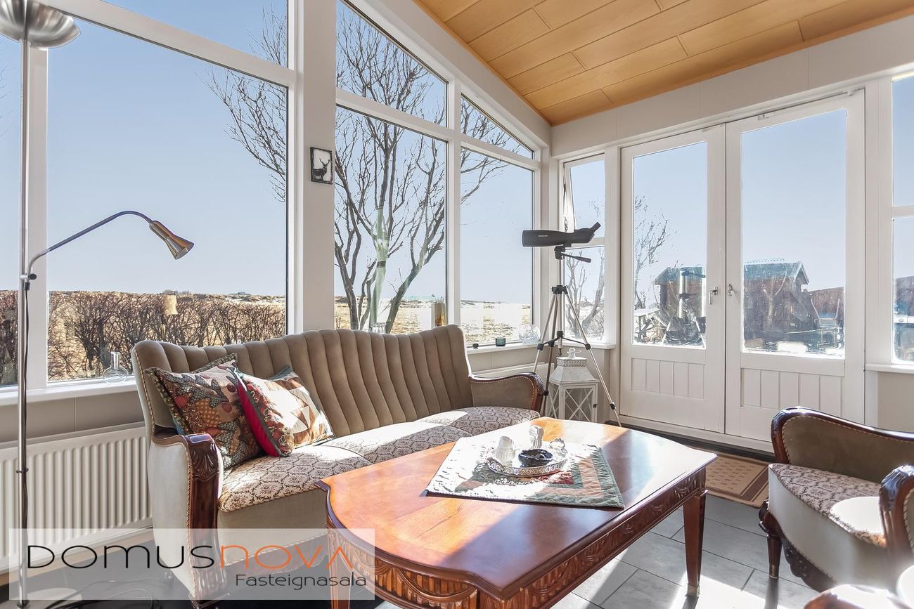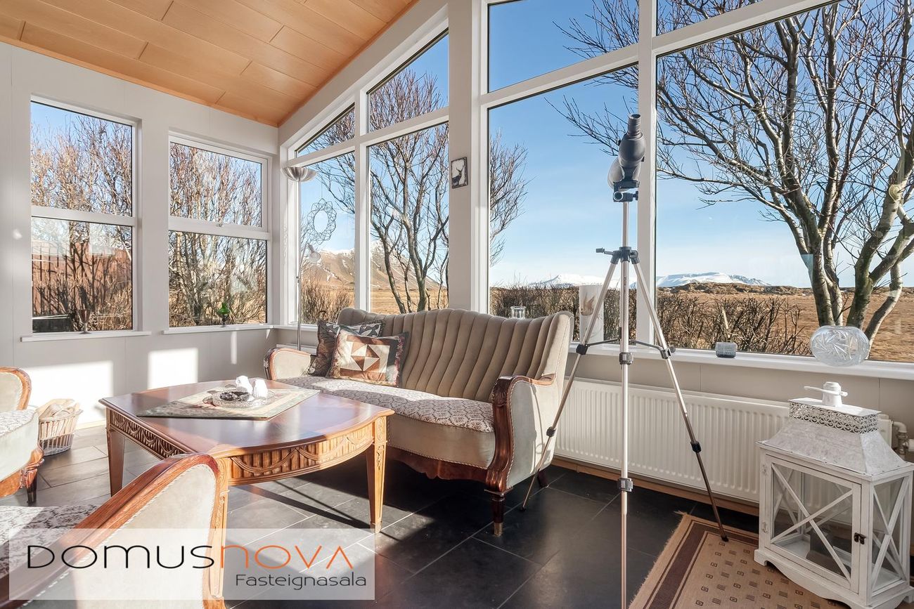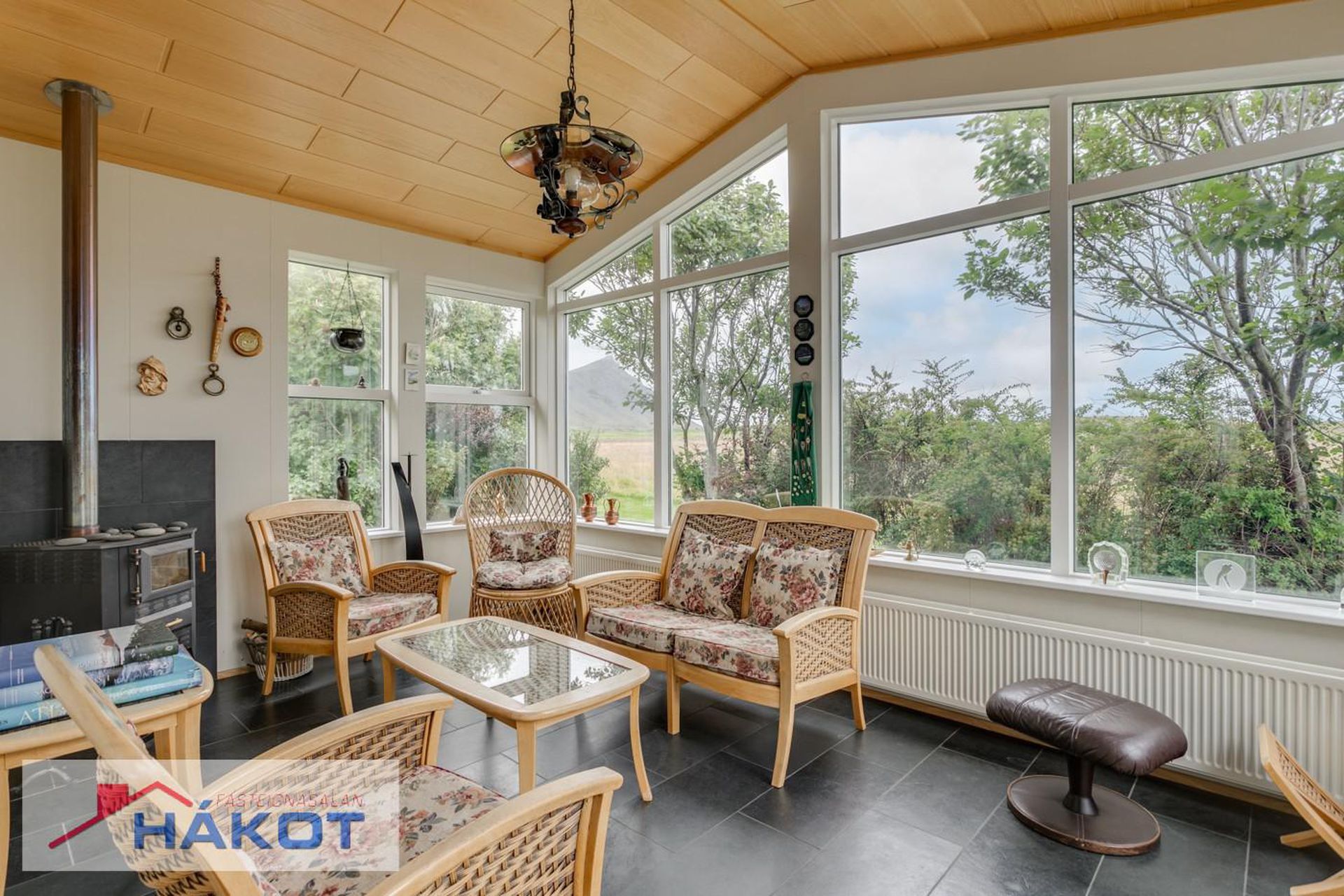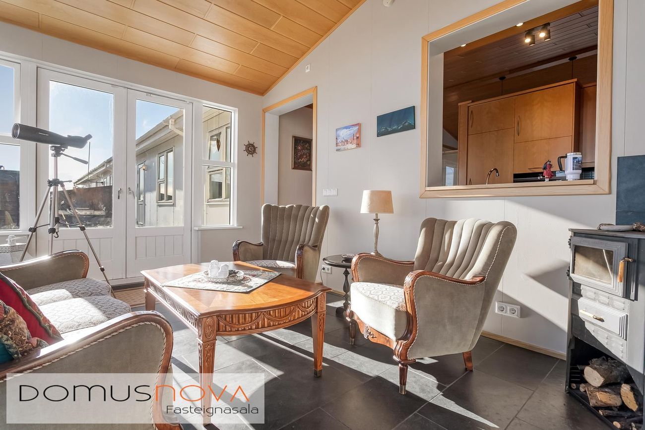 Sólstofa með kamínu og skjár.