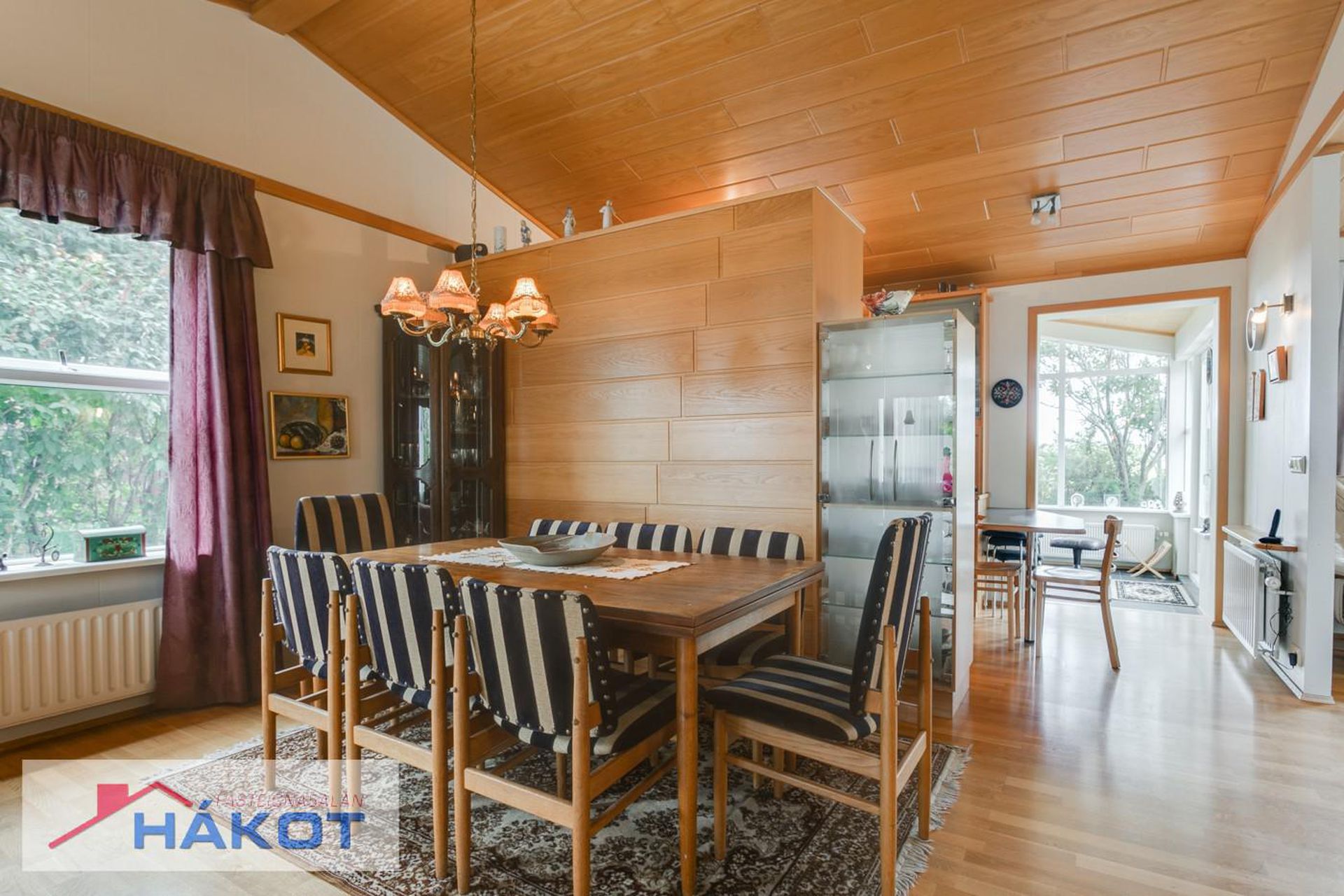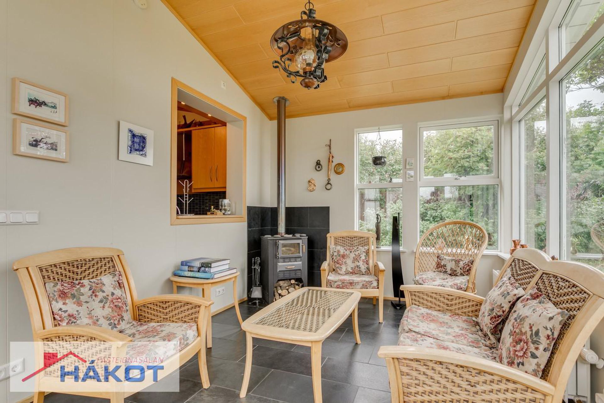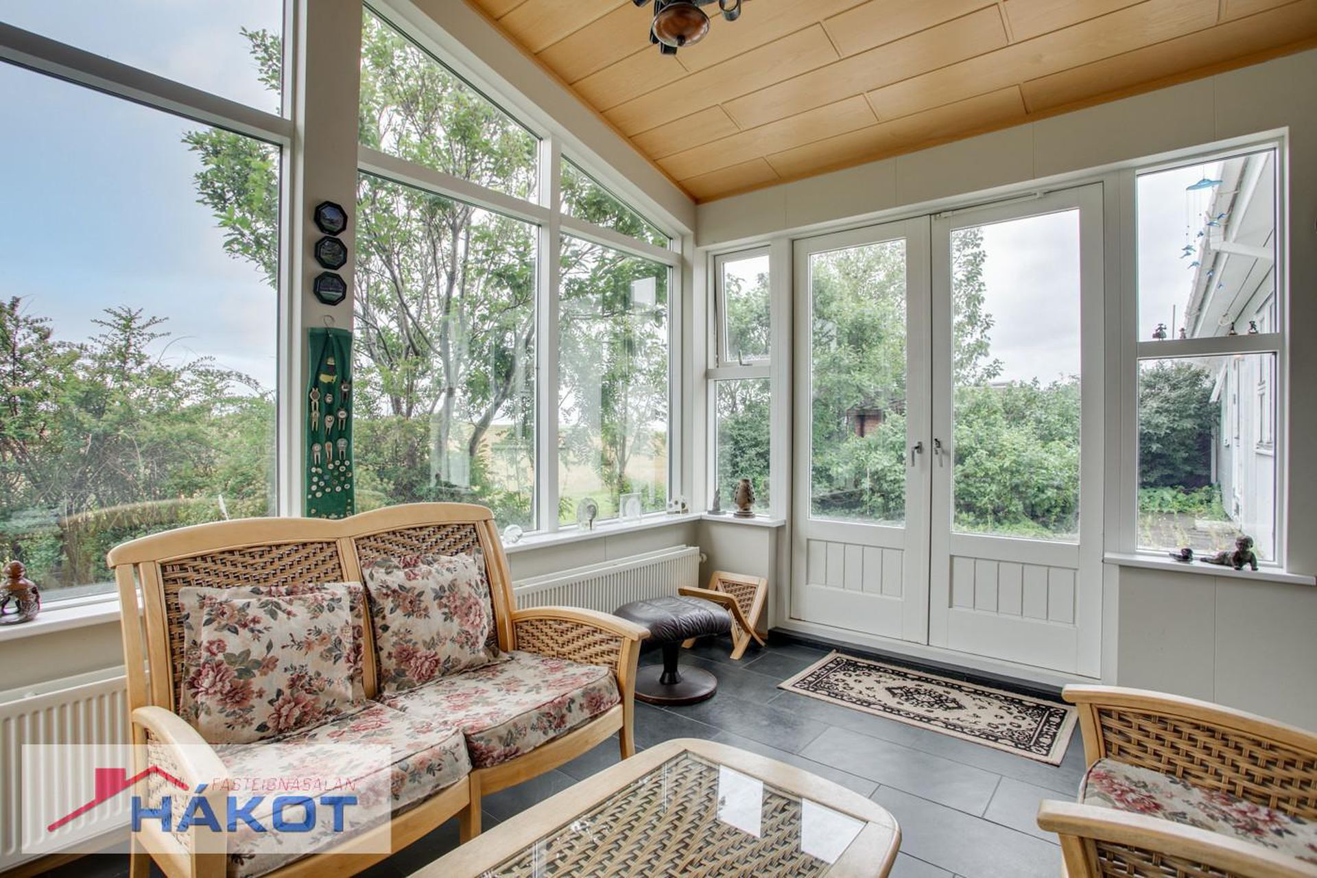 Sólstofa með kamínu og skjár.