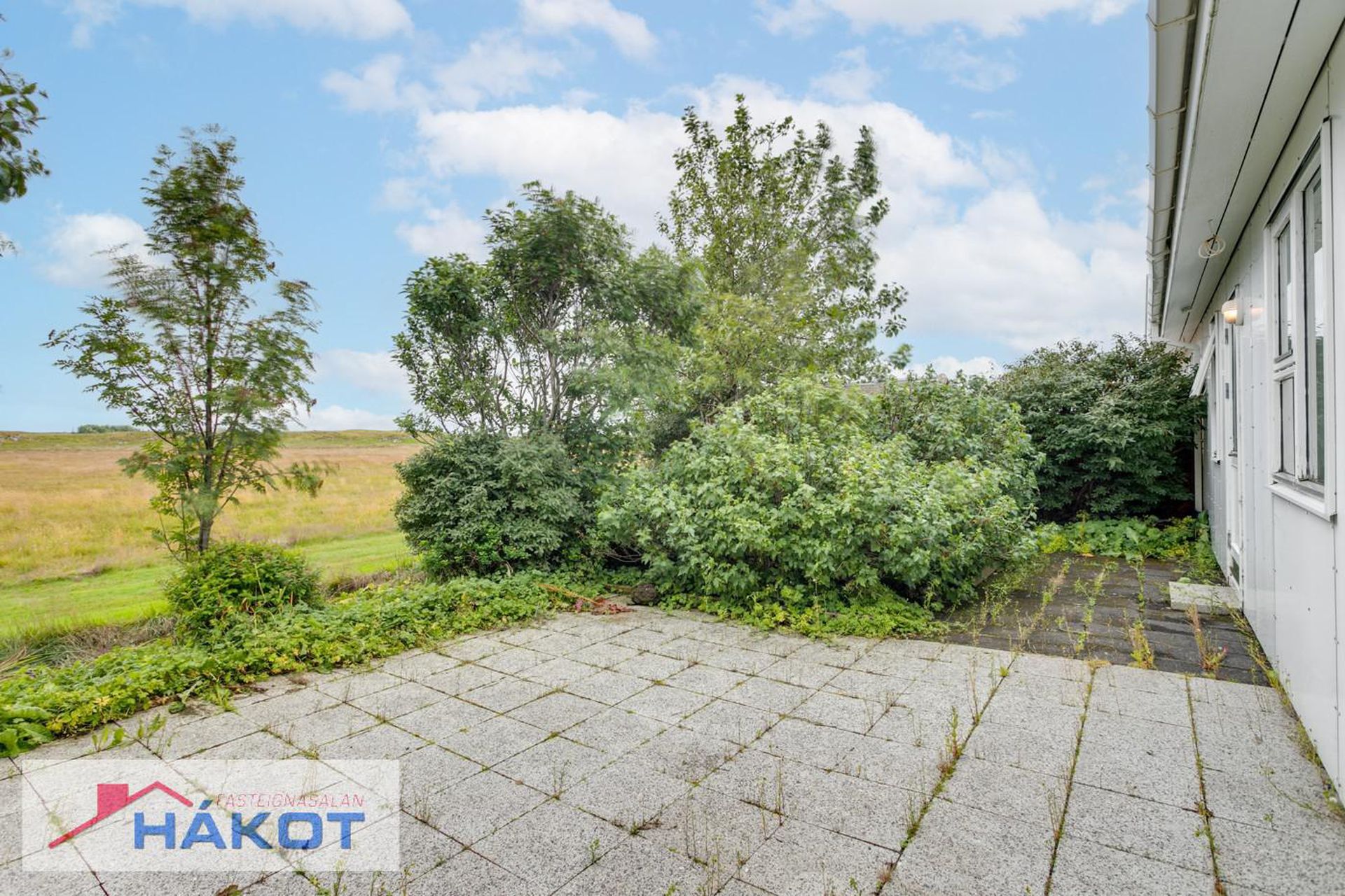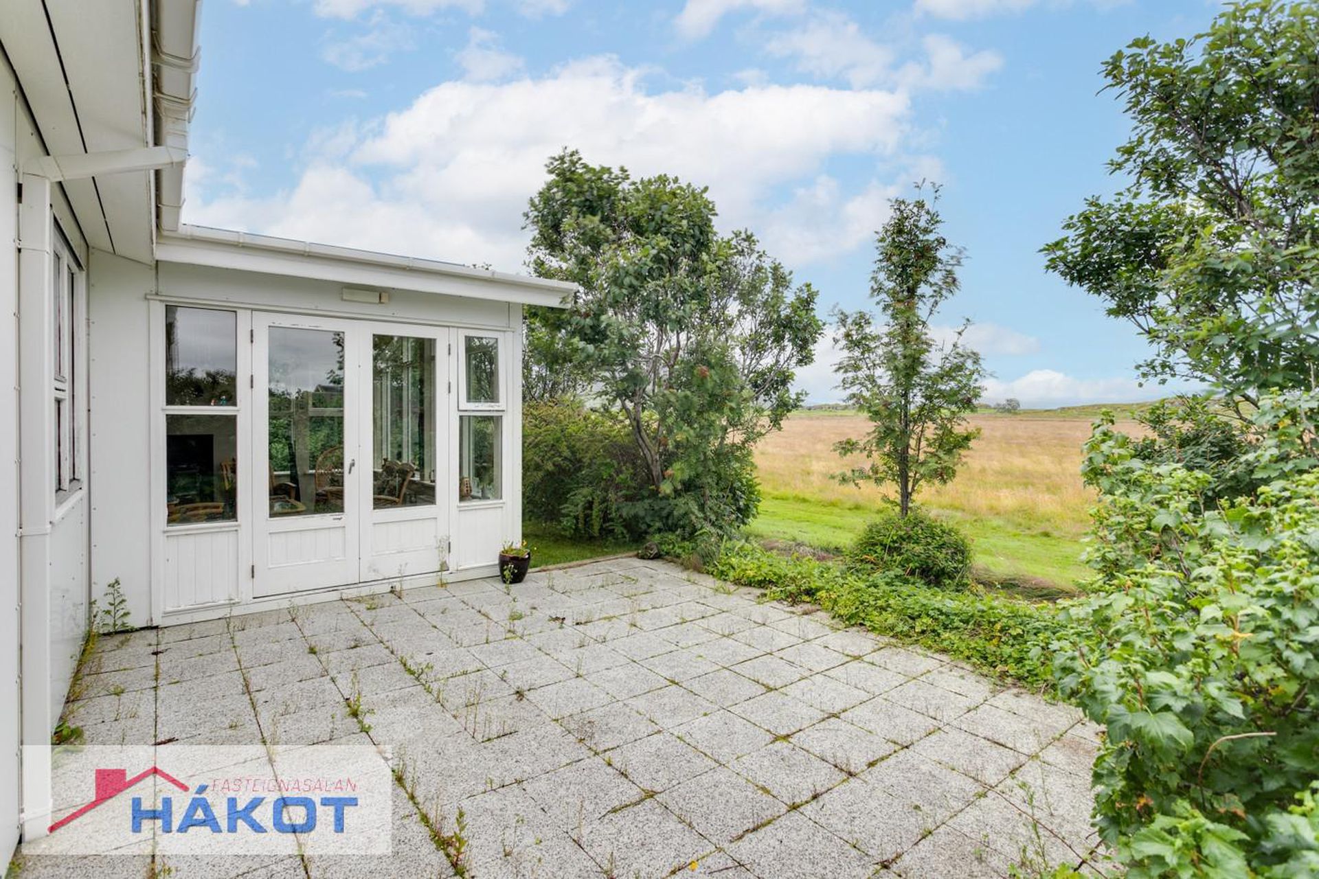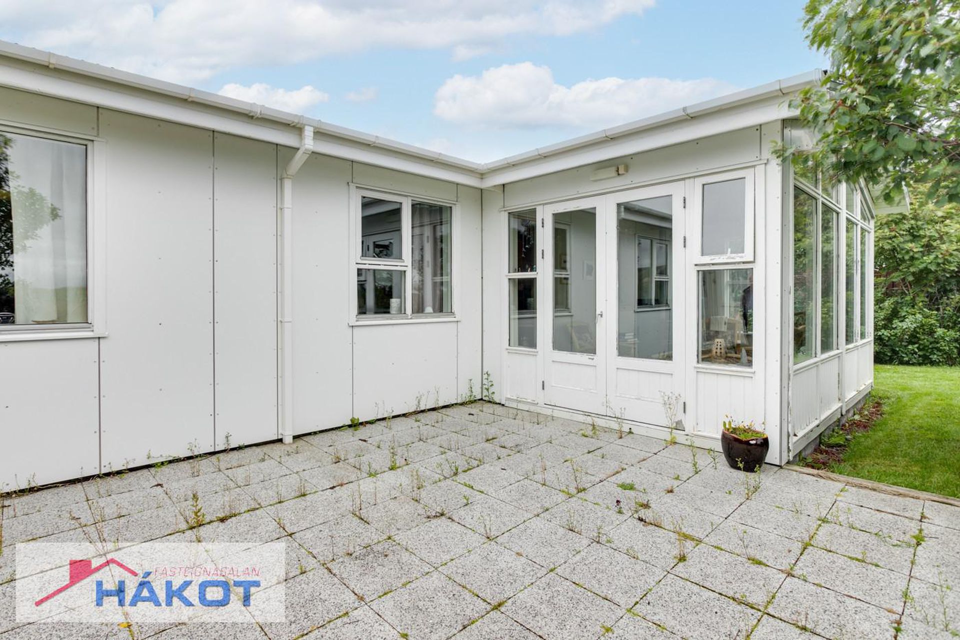 Hellulagð verönd úr sólstofu.
