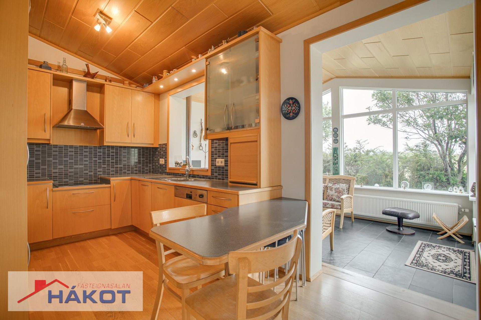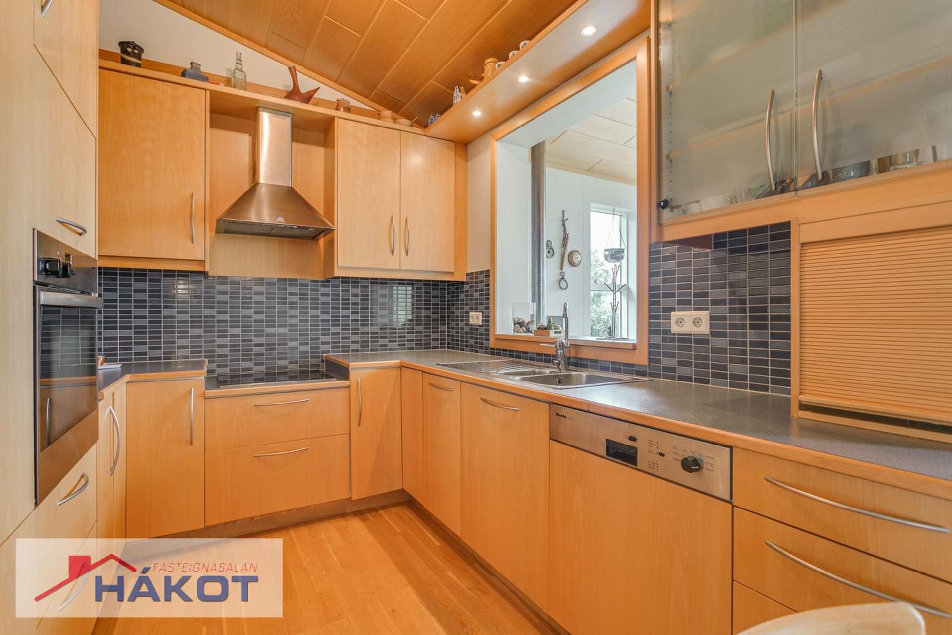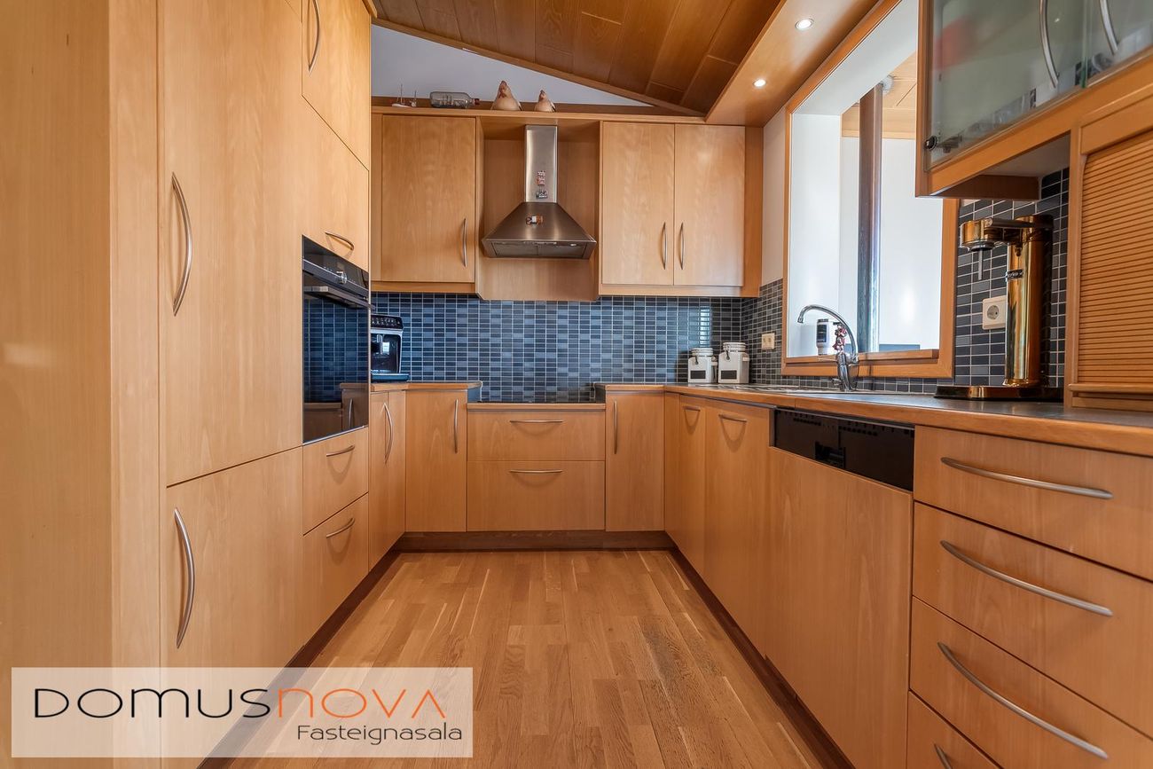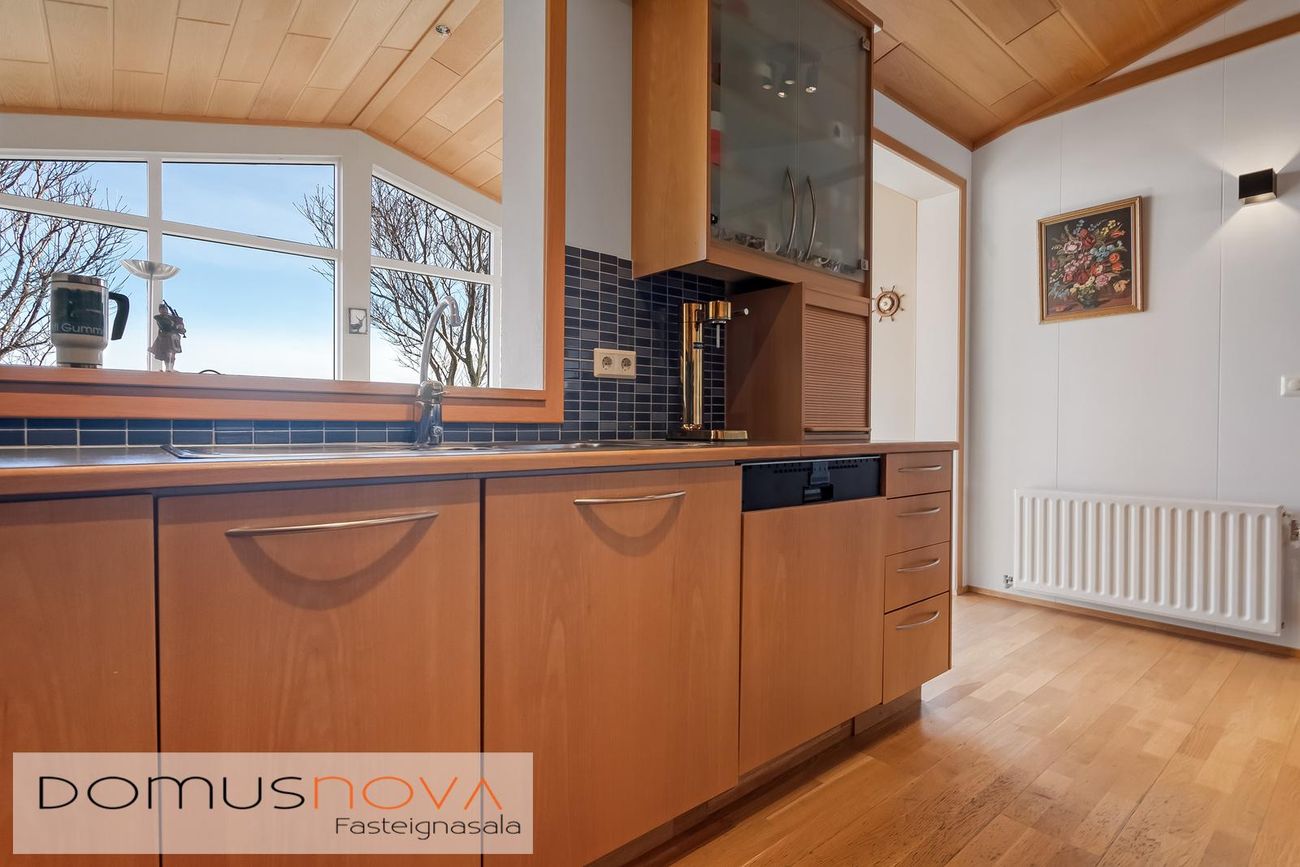 Eldhús með innréttingum úr beiki, keramik helluborð, veggofn, háfuri, innfelldri uppþvottavél og ísskápi. Kjötið, ofn og uppþvottavél endurnýjað árið 2023.