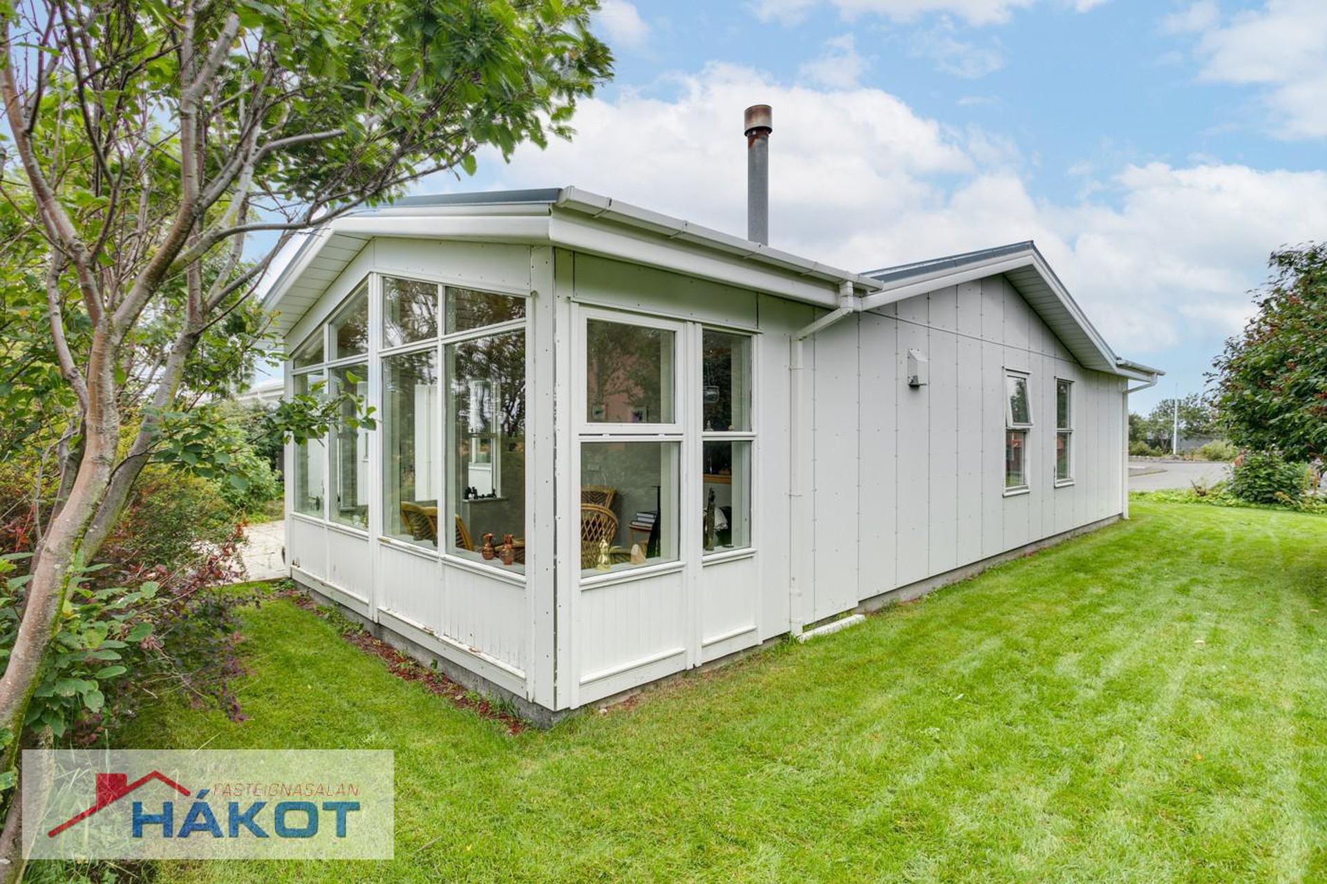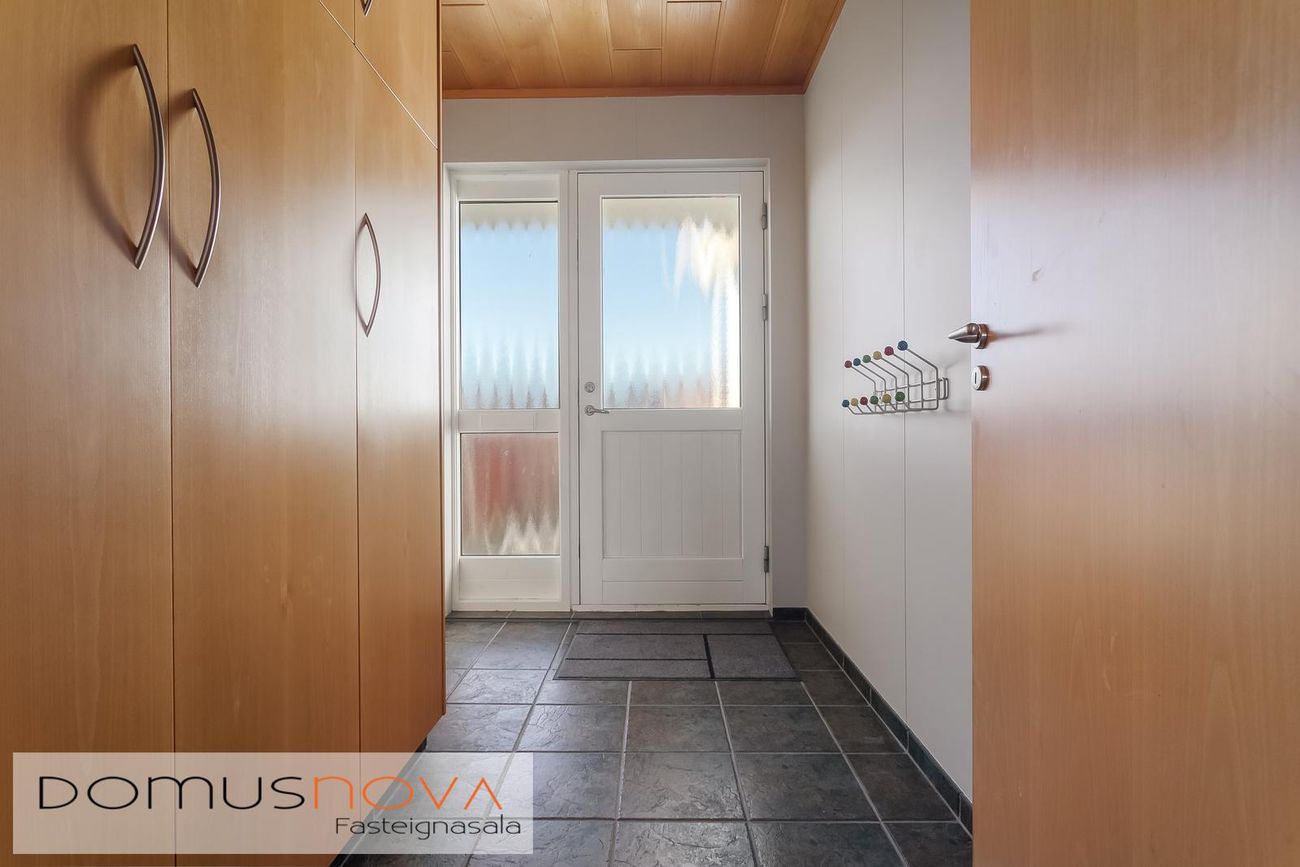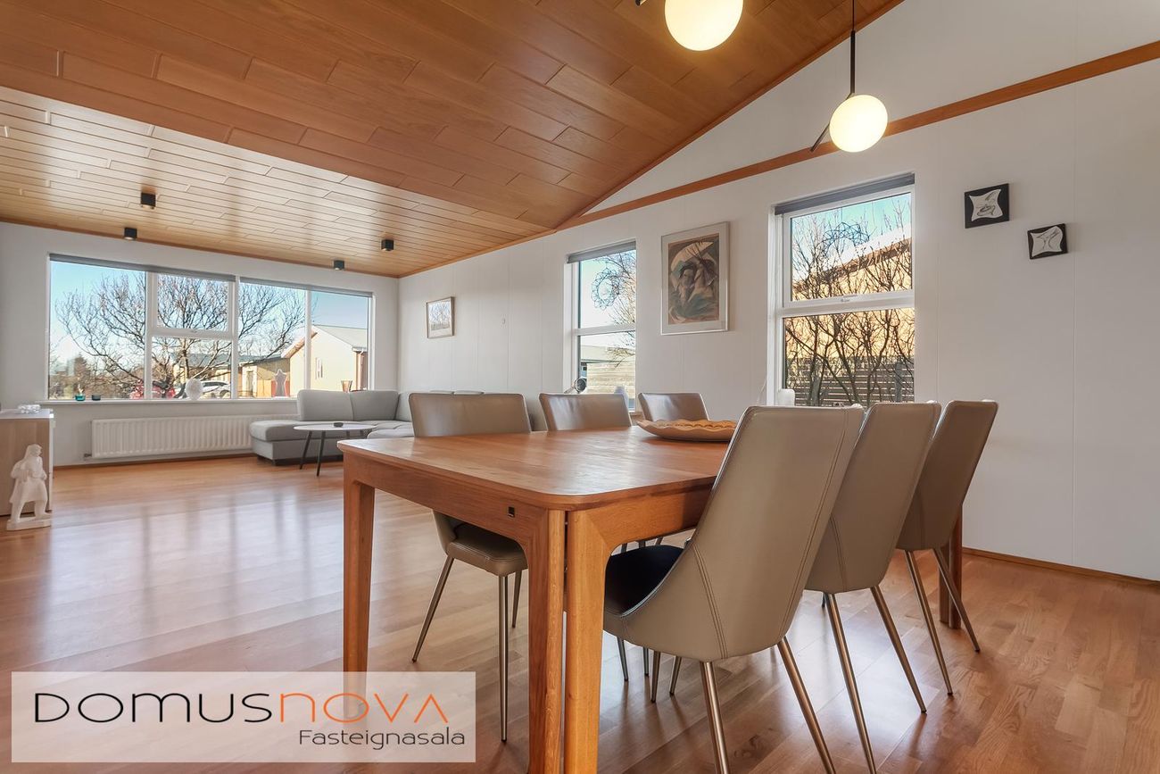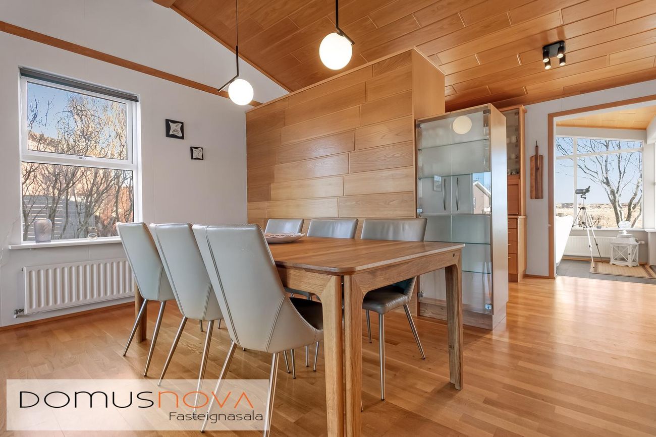 Endaraðhús á einni hæð með forstofu, hol, stofu, eldhúsi, sólstofu, sjónvarpsholi, 2 svefnherbergjum, baðherbergi, tengigangi, þvottahúsi og bílgeymslu.