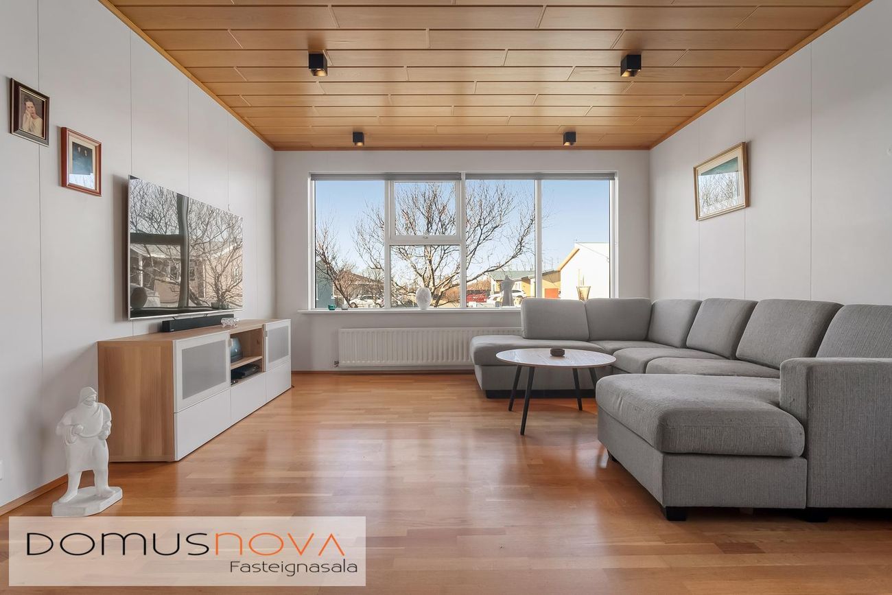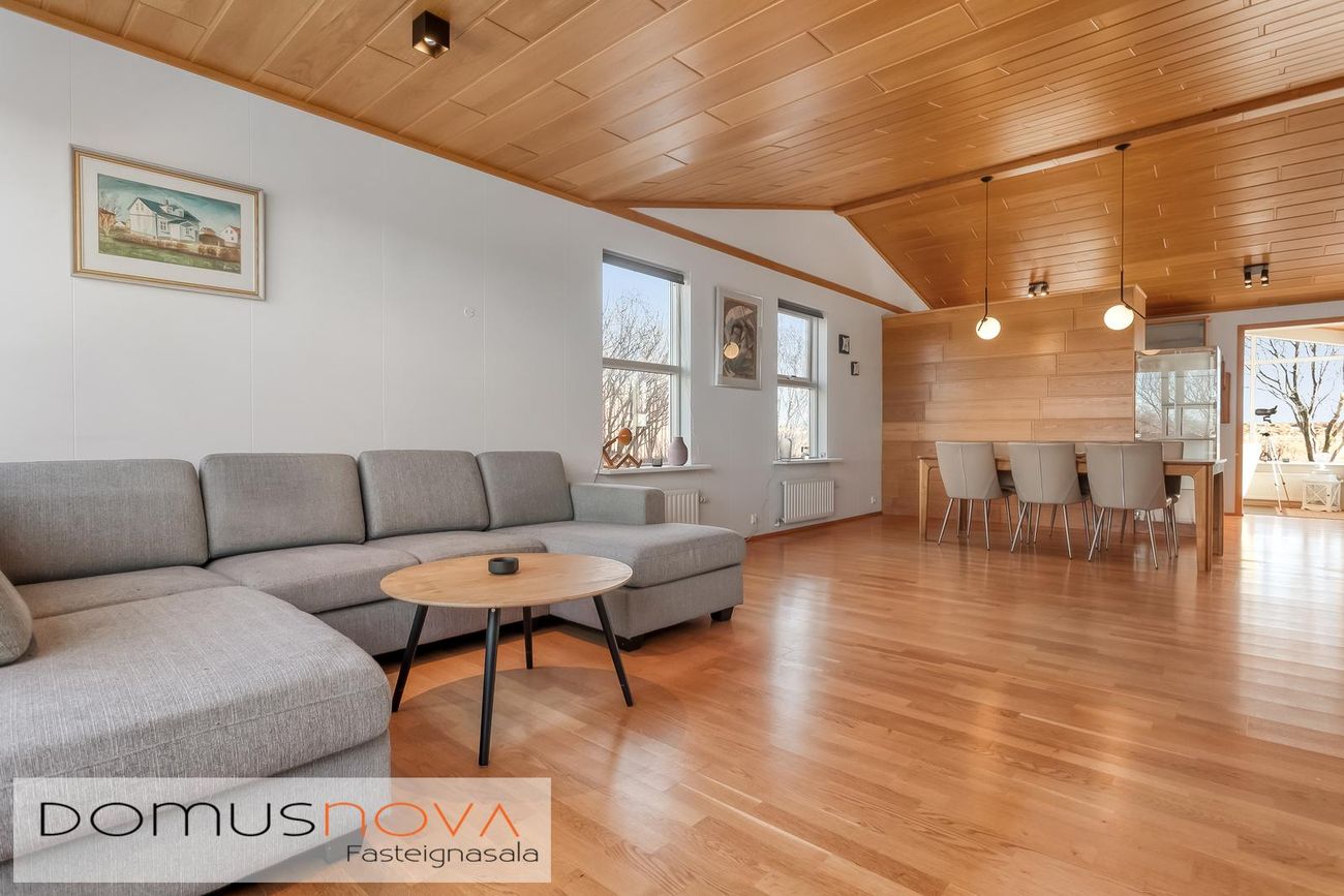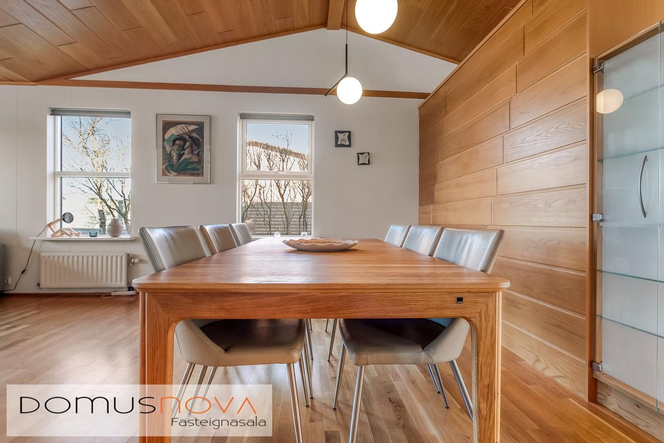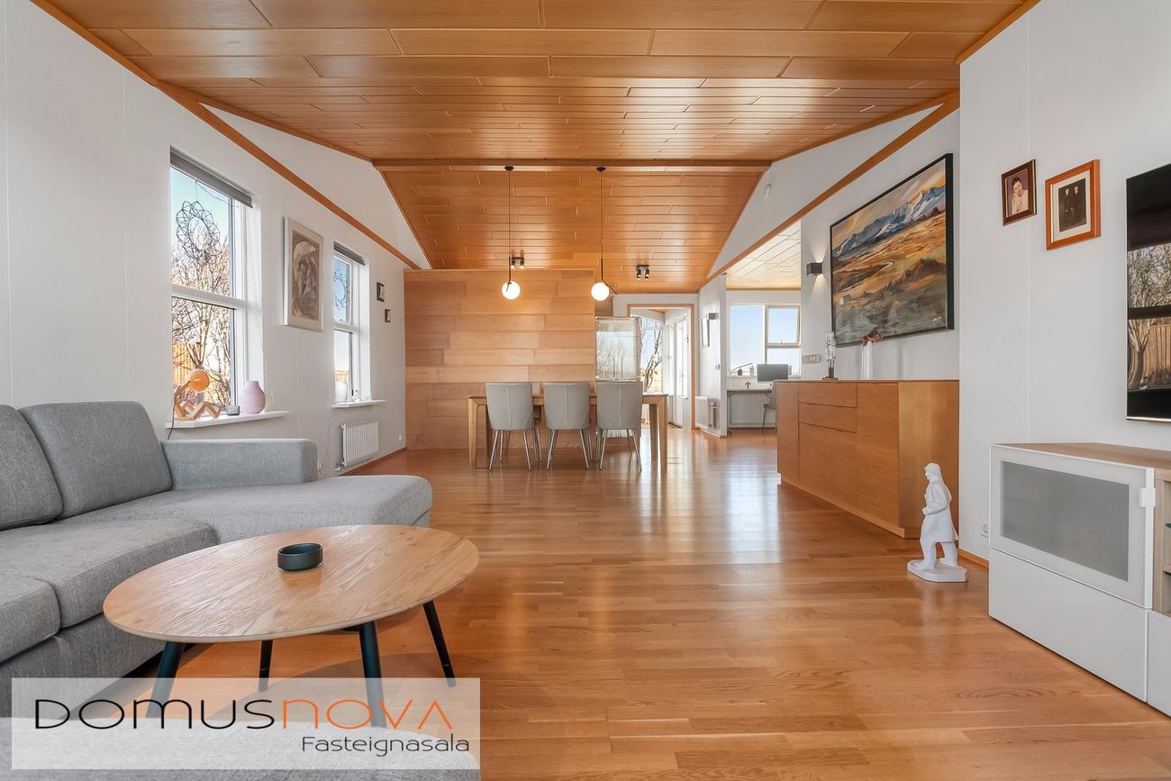 Flísar á gólfi í sumum herbergjum, parket á öðrum, húsið klætt að utan með sléttu áli.