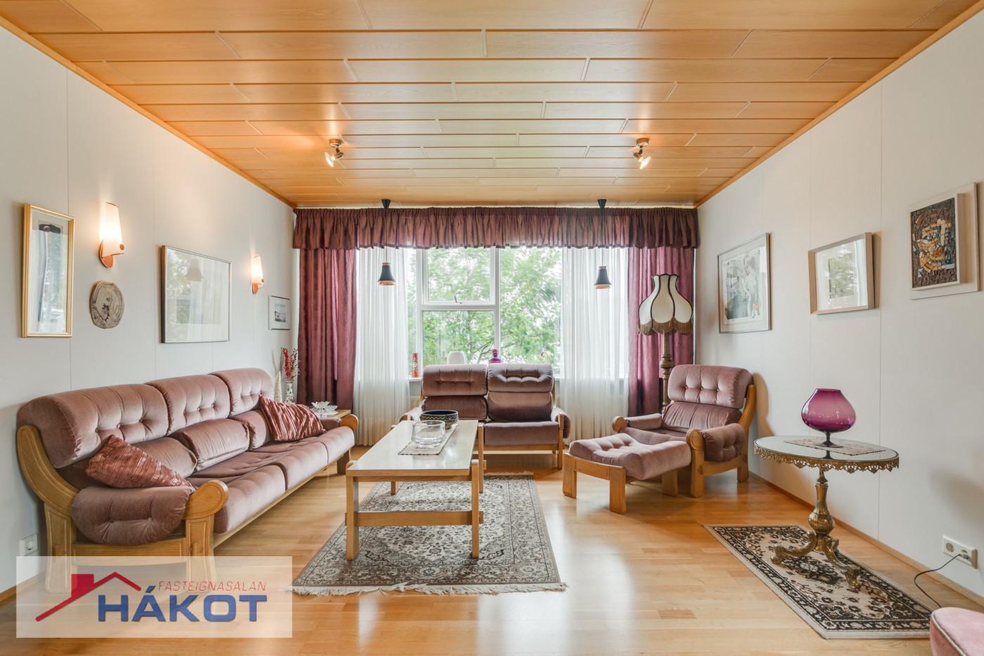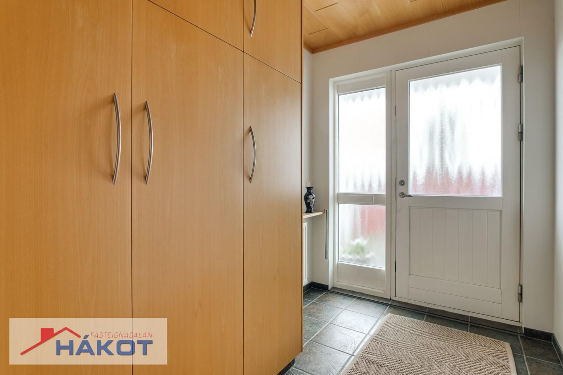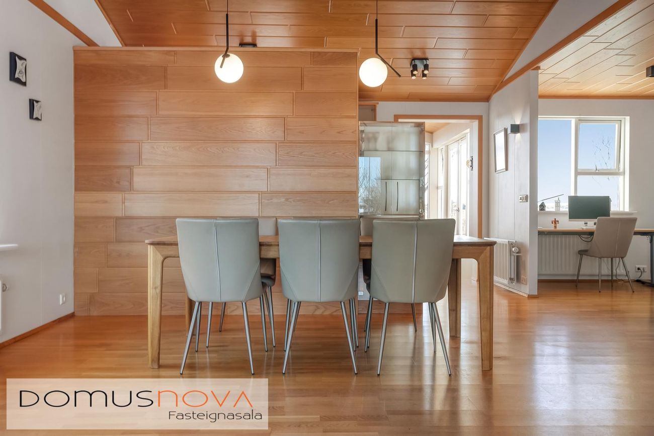 Flísar á gólfi í sumum herbergjum, parket á öðrum, húsið klætt að utan með sléttu áli.