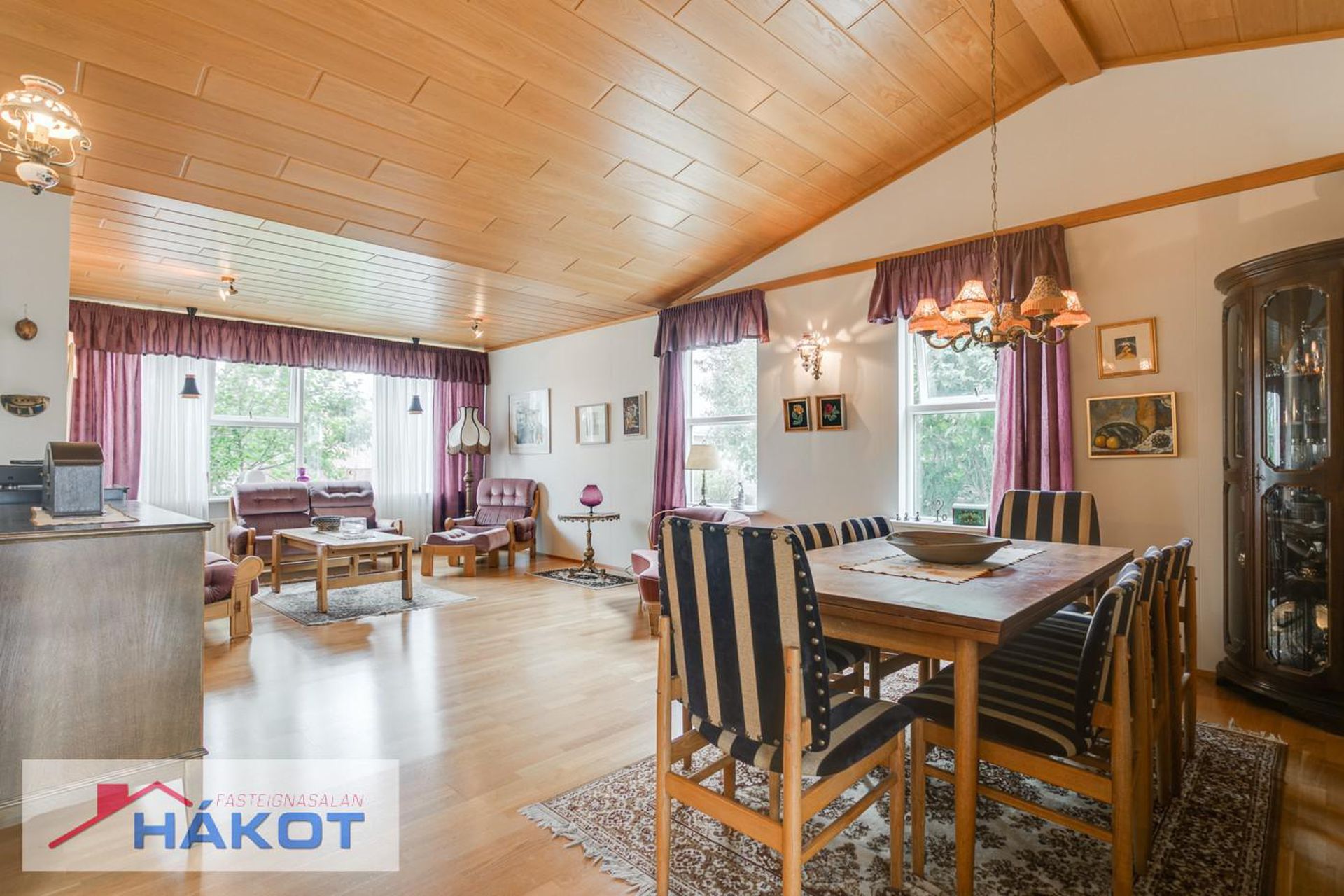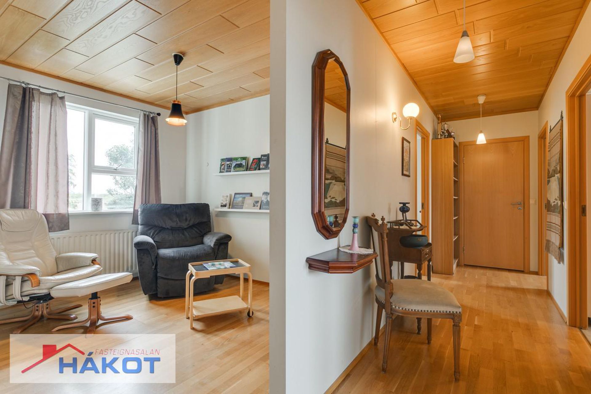 Hol og stofa með parketi á gólfi.