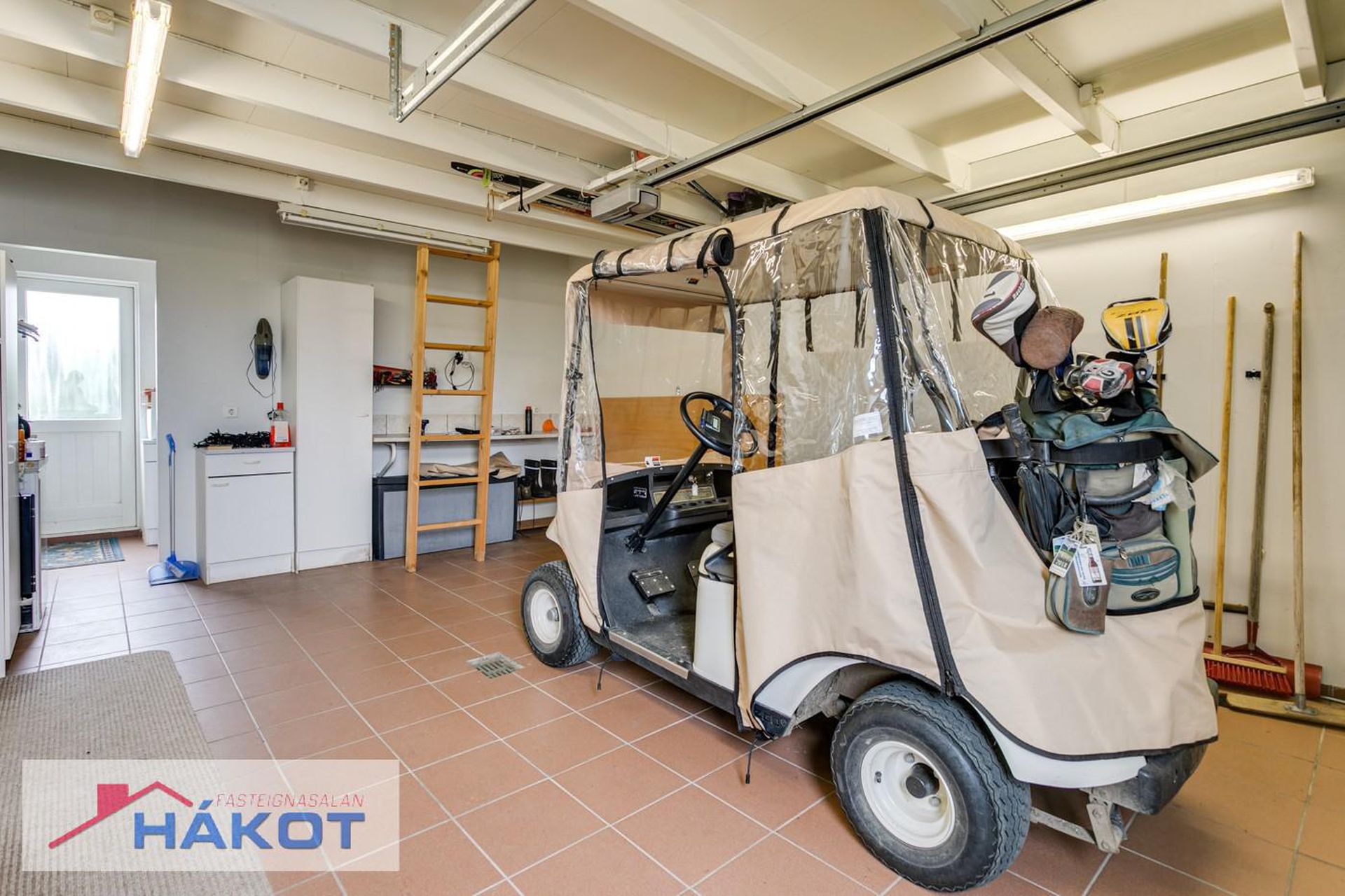 Bílgeymsla með flísum á gólfi, geymslulofti og fjarstýrðum opnara.