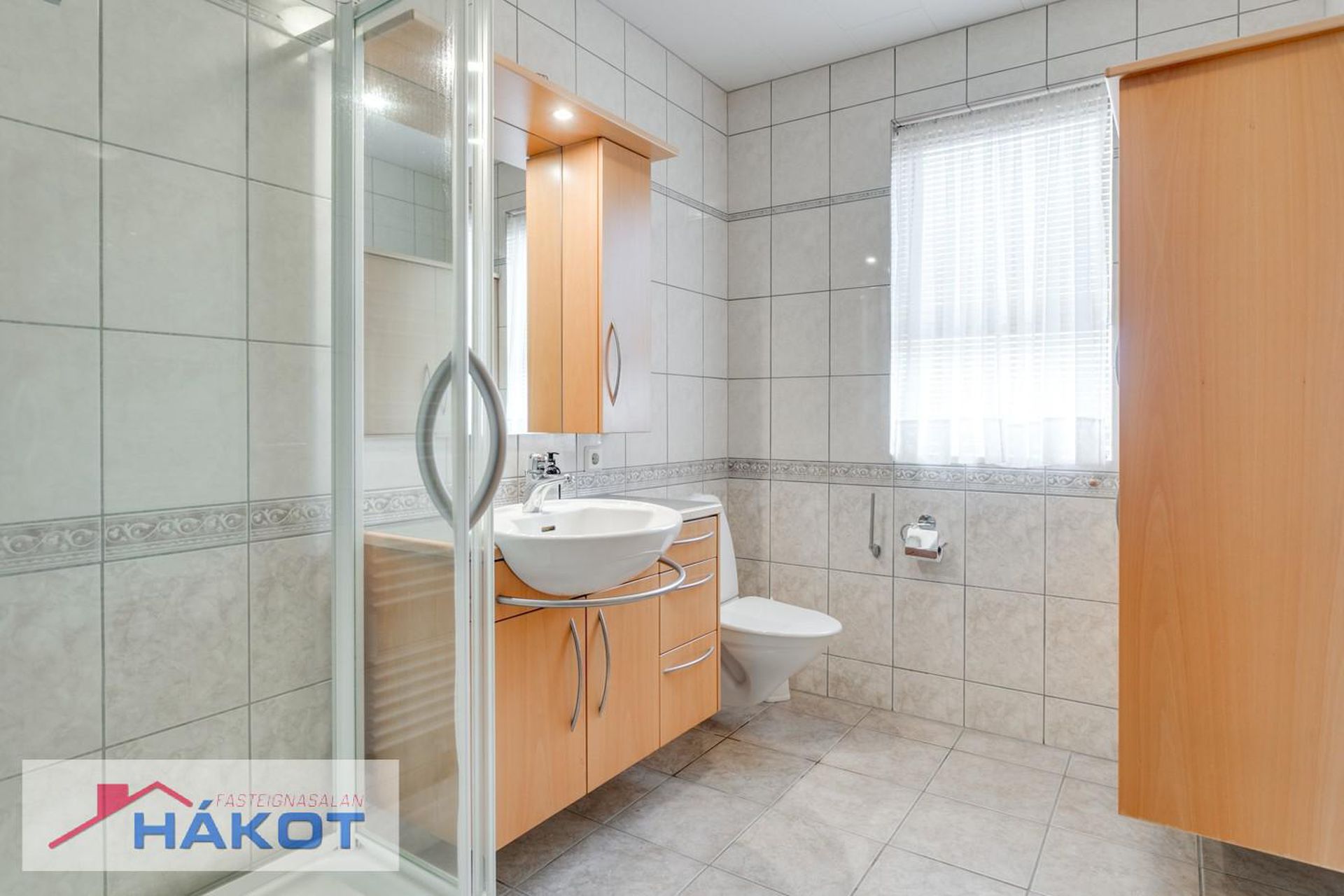 Baðherbergi með flísum á gólfi og veggjum, ljós viðarinnrétting, sturtu og handklæðaofni.