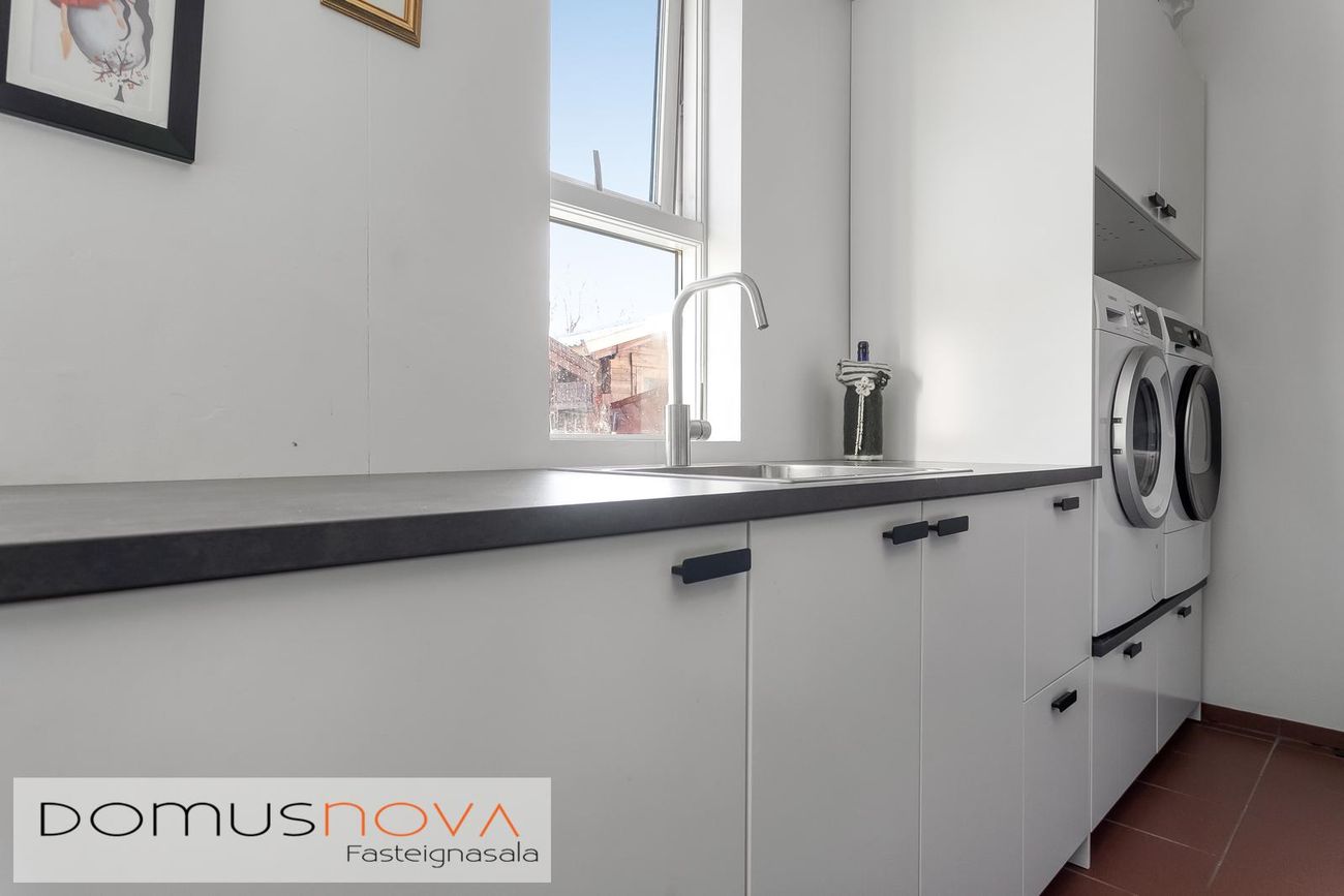 Þvottahús í bílgeymsluendi með flísum, hvítri innrétting og dyr út á lóð.