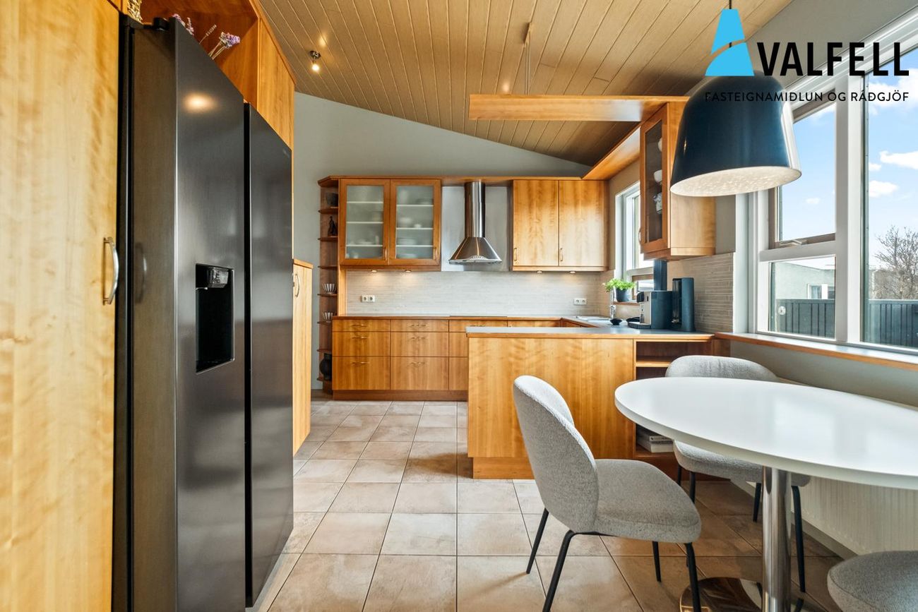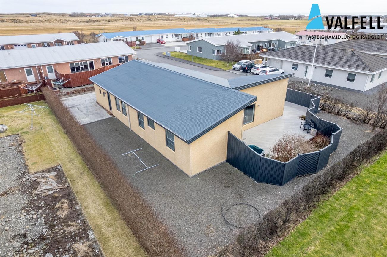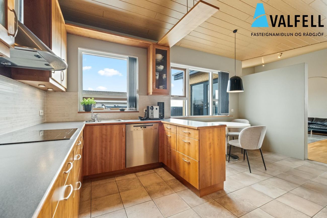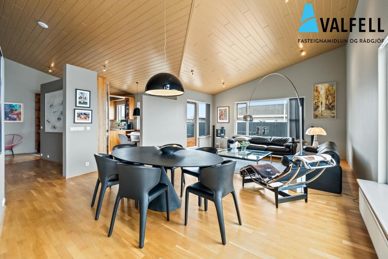 Einbýlishús á einni hæð með opnu loftrými. Eikarparket á flestum gólfum, flísalög gólf í forstofu, eldhúsi og þvottahúsi með gólfhita.