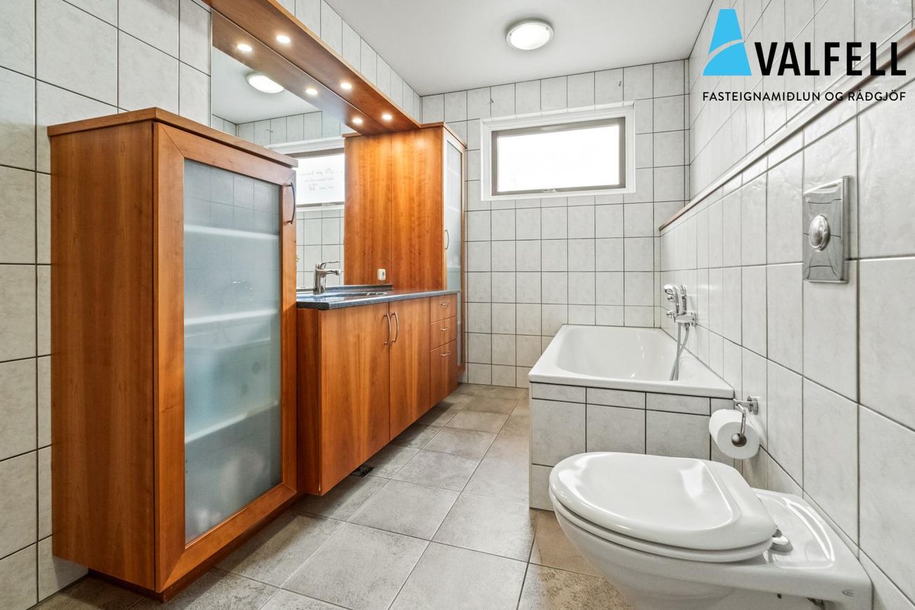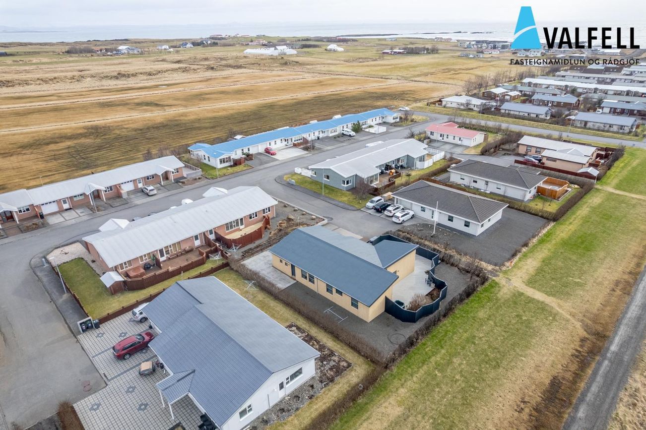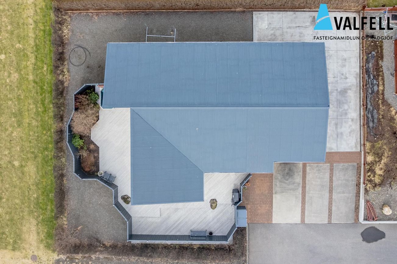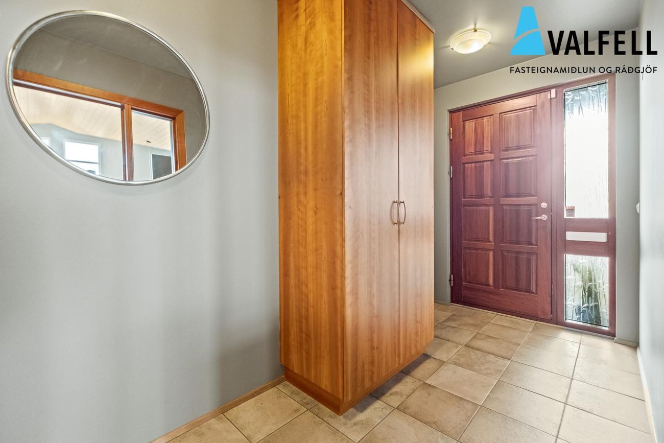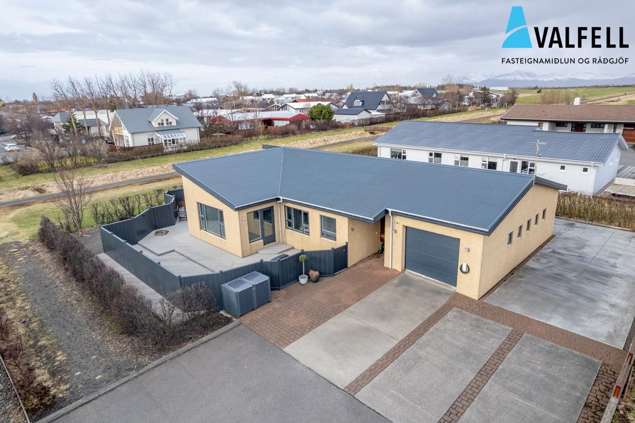 Einbýlishús á einni hæð með opnu loftrými. Eikarparket á flestum gólfum, flísalög gólf í forstofu, eldhúsi og þvottahúsi með gólfhita.