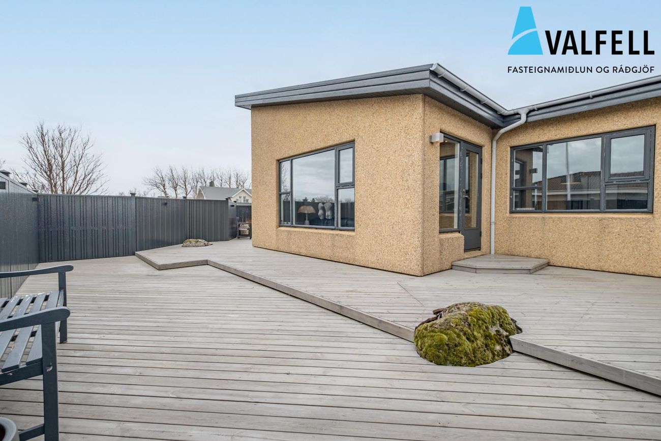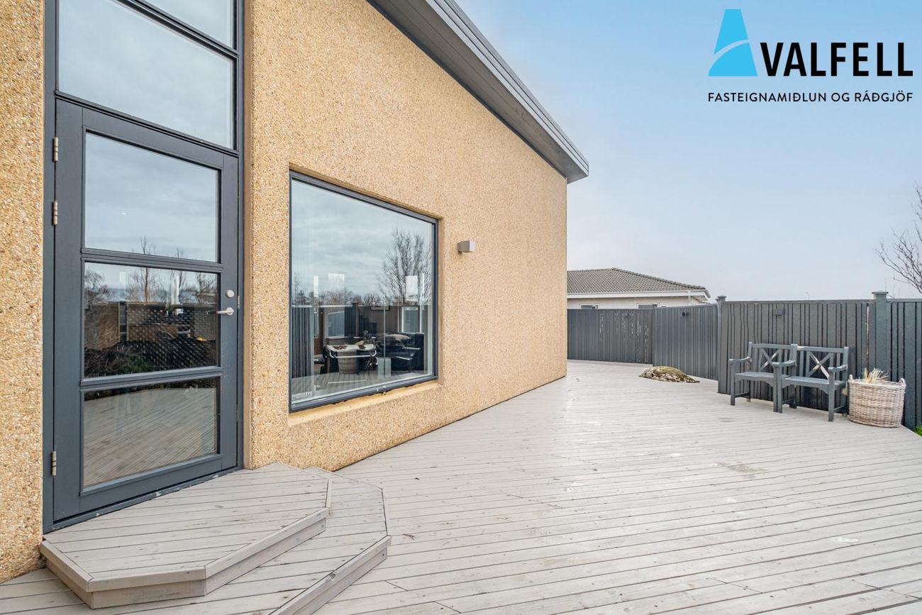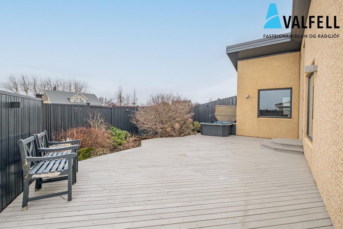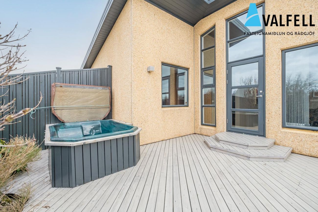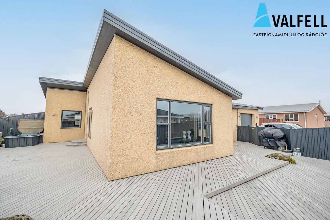 200,4 fm einbýlishús með innbyggðum 31,4 fm bílskúr. Fjögur svefnherbergi, opið loftrými með eikarklæðningu, sólpallar og heitur pottur.