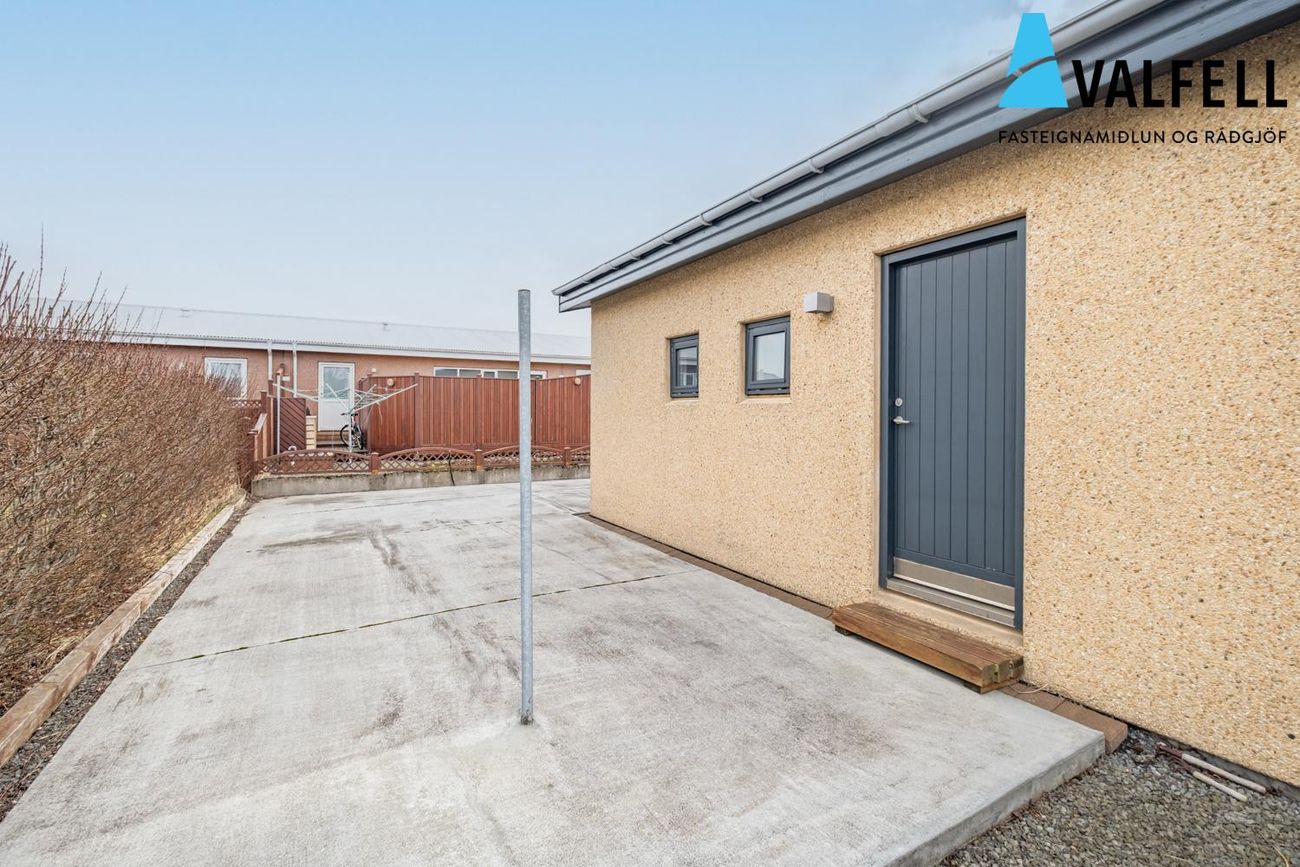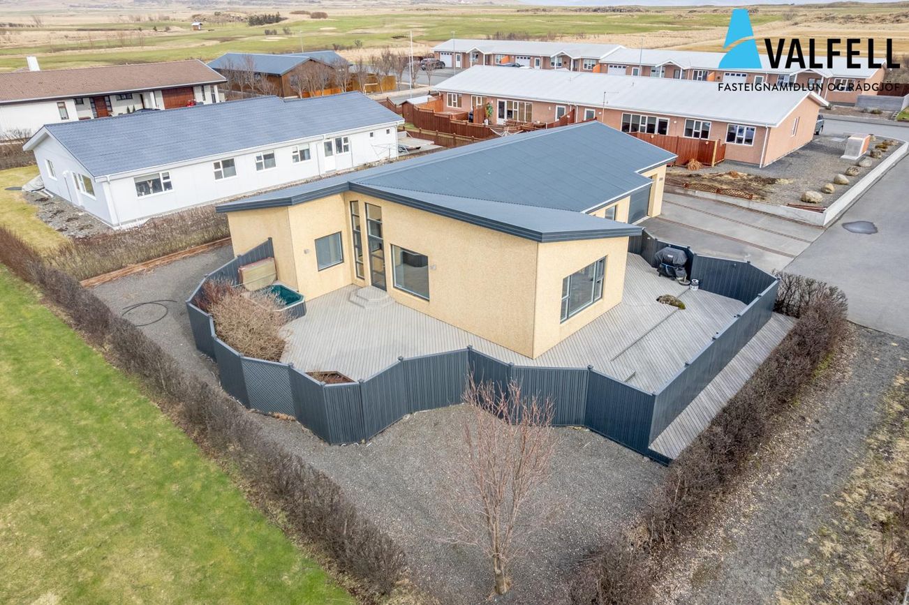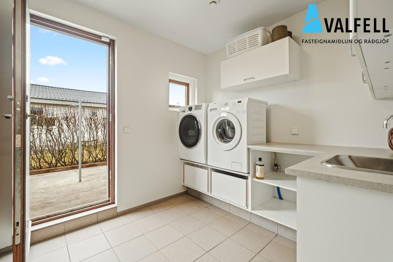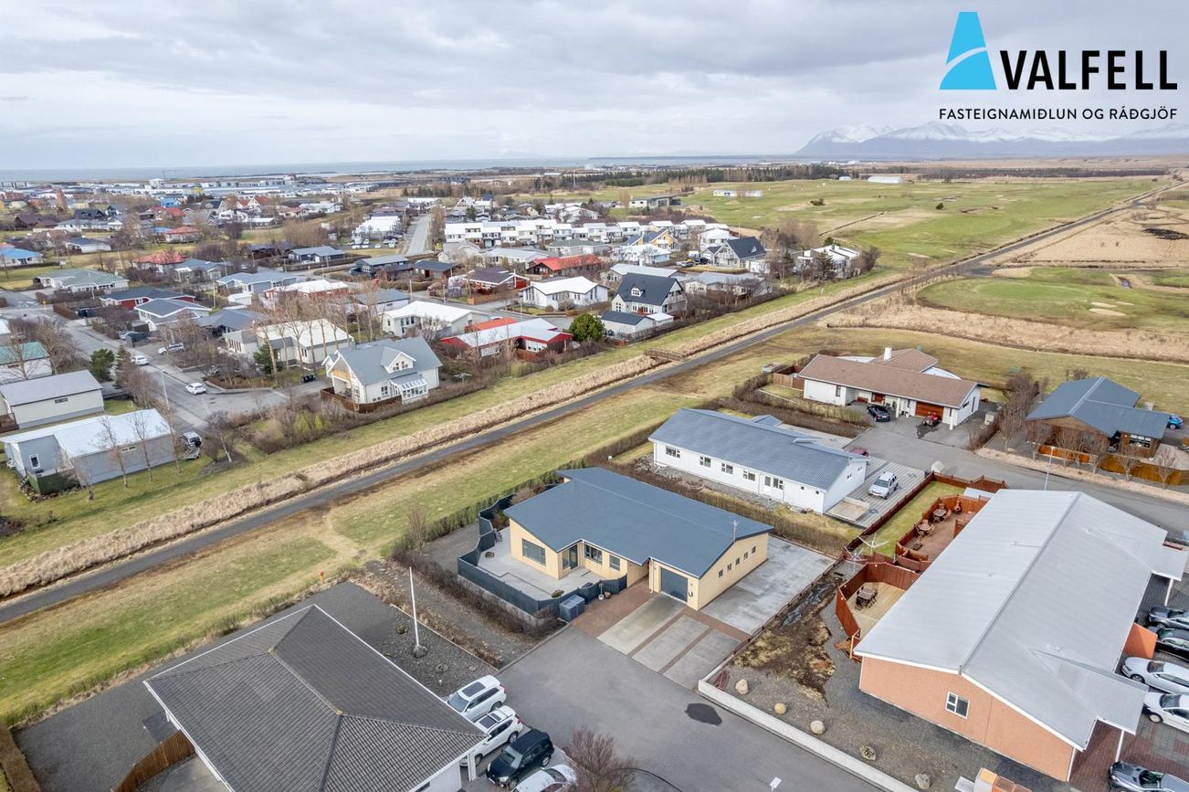 Einbýlishús á einni hæð með opnu loftrými. Eikarparket á flestum gólfum, flísalög gólf í forstofu, eldhúsi og þvottahúsi með gólfhita.