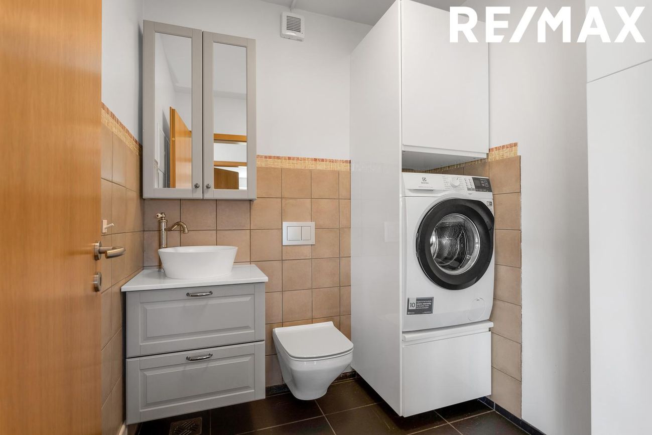 Gestasalerni & Þvottaherbergi: Tengi fyrir þvottavél og þurrkara, vinnuvaskur og flísar á gólfi, upphengt WC.