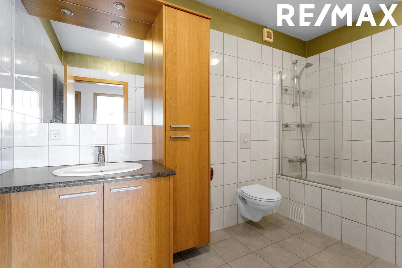 Baðherbergi: Falleg viðar innrétting, upphengt wc, , sturta og baðkar. Flísar í hólf og gólf.