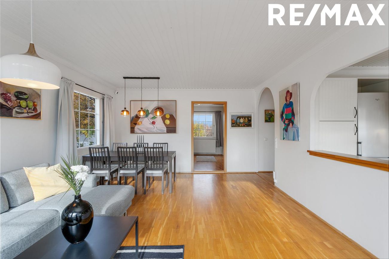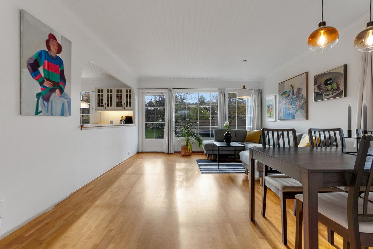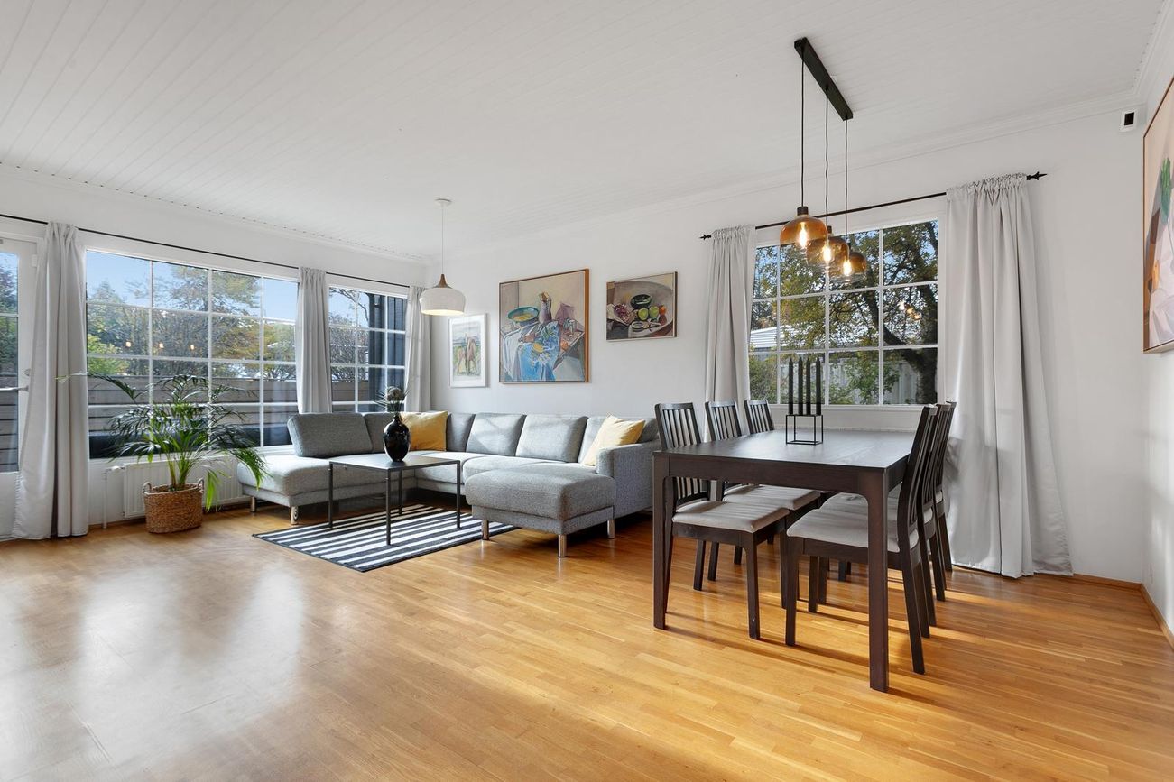 Borðstofa og stofa er í björtu og opnu rými með útgengt út á ca.