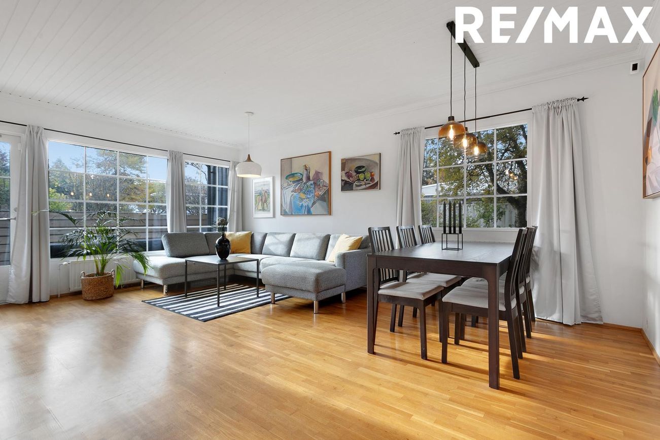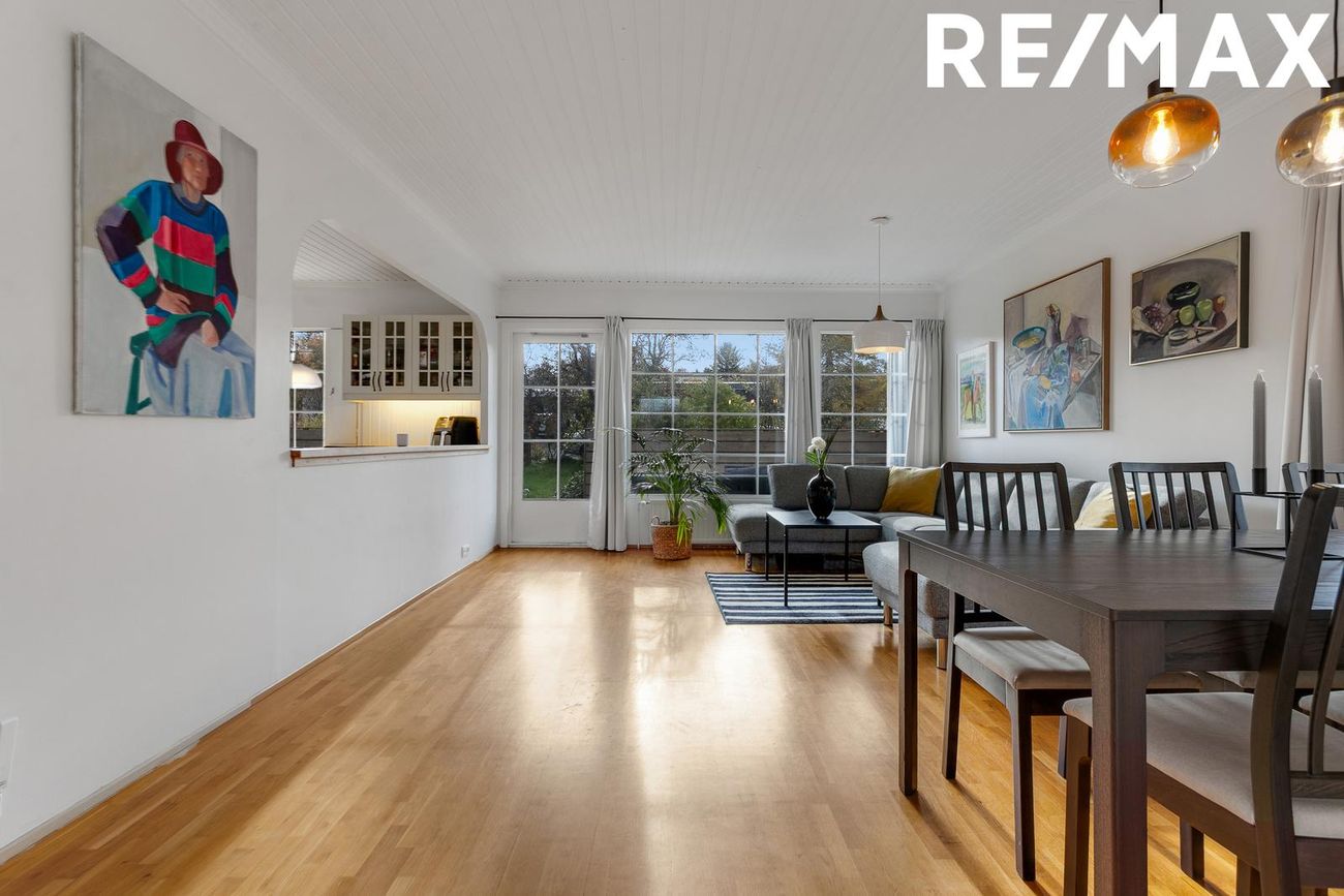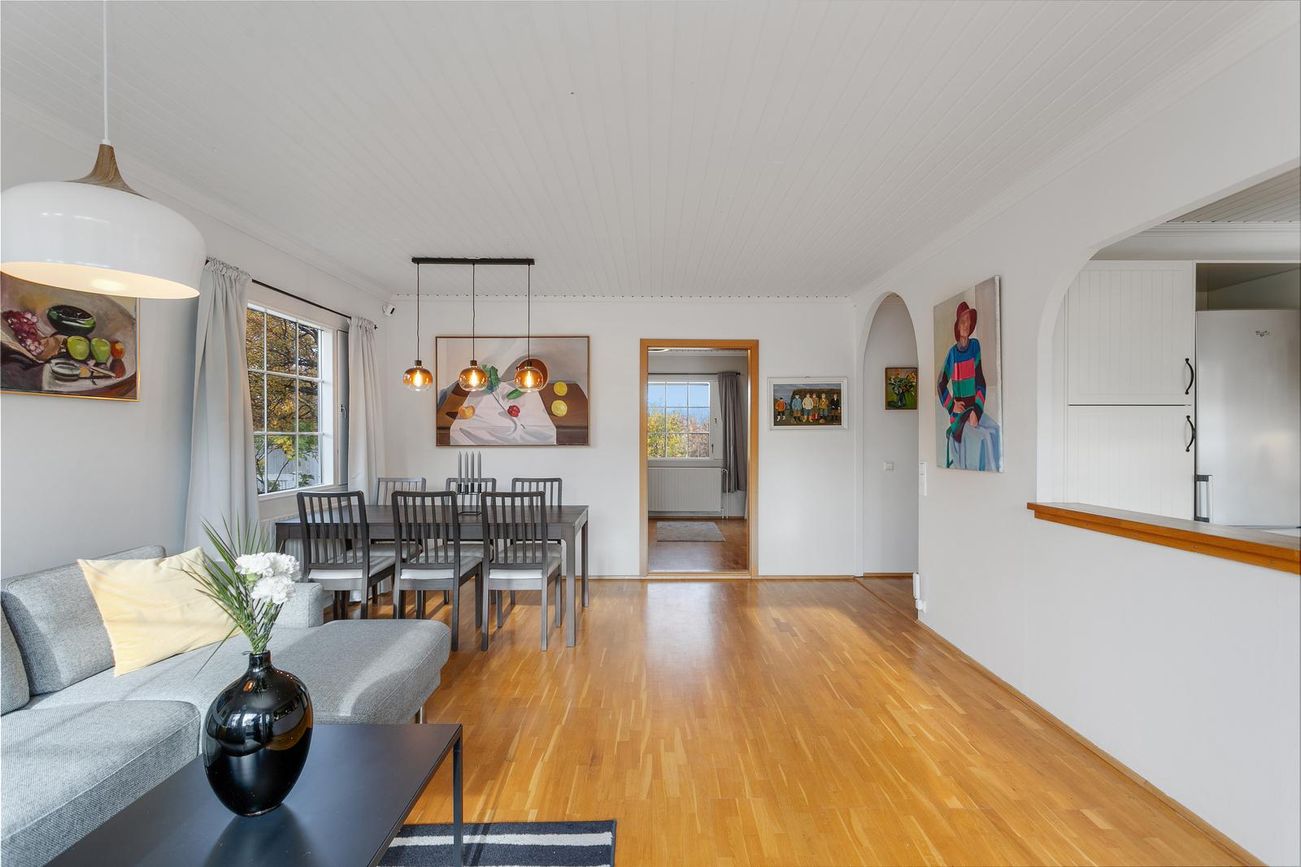 Borðstofa og stofa er í björtu og opnu rými með útgengt út á ca.