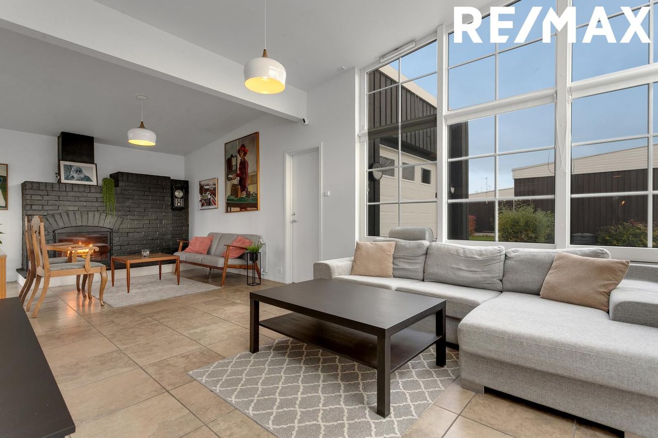 Arinstofan er mjög glæsileg, björt og há til lofts. Flísar eru á gólfum með gólfhita. Fallegur hlaðinn
