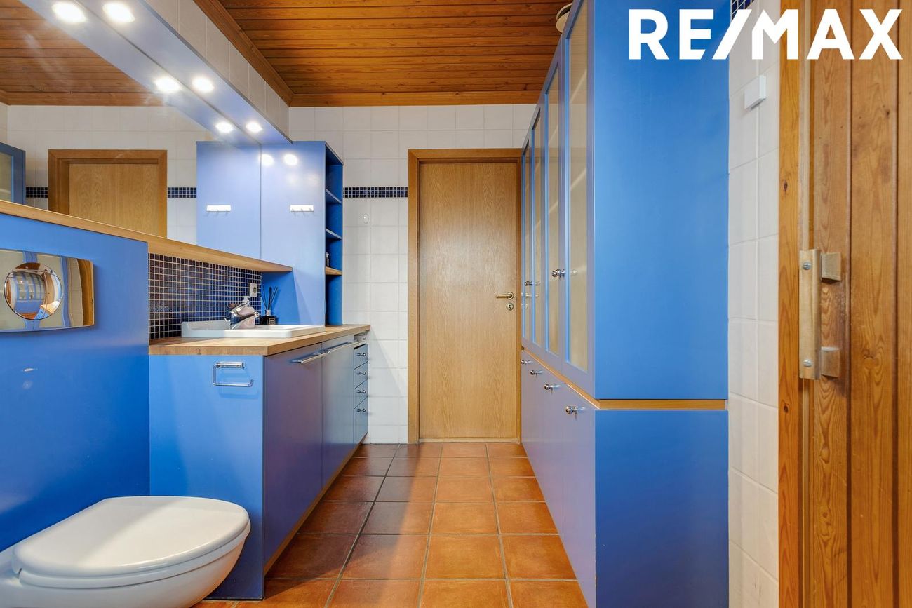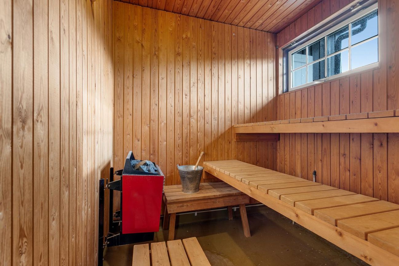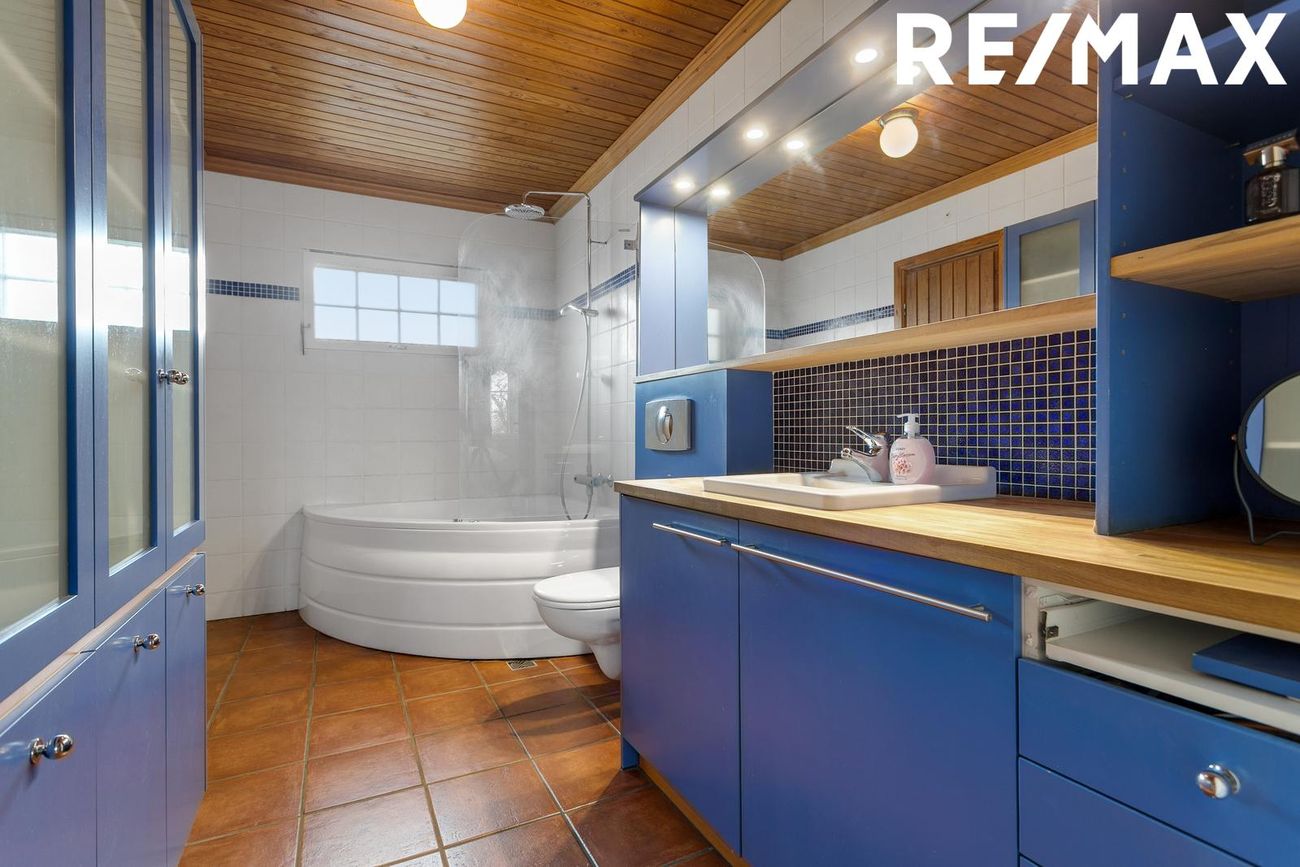 hornbaðkari með sturtu. Flísalagt er í hólf og gólf, jafnframt er góður opnanlegur gluggi. Inn af baðherbergi er viðarklædd