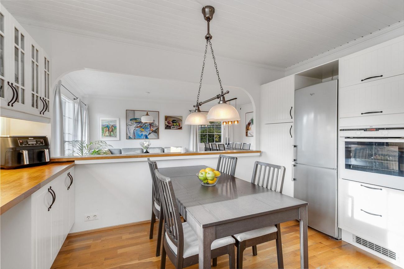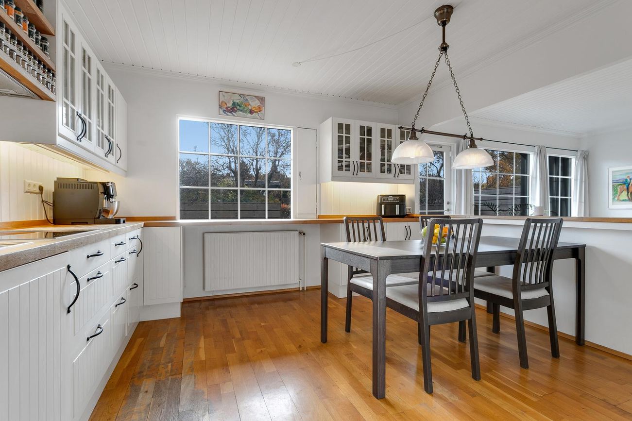 Eldhús er með fallegri hvítri innréttingu með góðu skápaplássi. Helluborð og vifta, bökunarofn og uppþvottavél í vinnuhæð. Parket á gólfum. Stór og bjartur gluggi hleypir fallegri birtu inn.