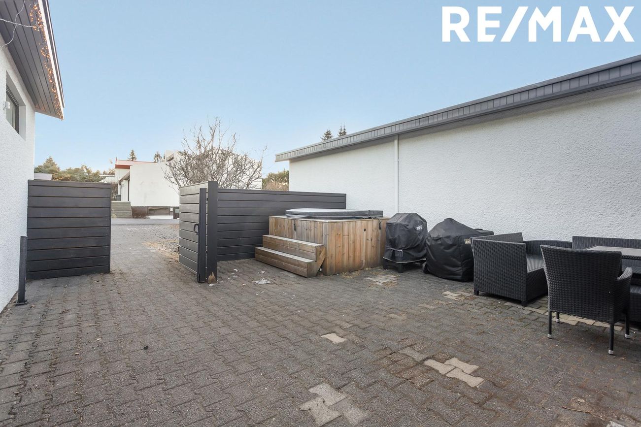 Hellulagt og upphitað er frá bílastæði að anddyri hússins, skjólveggur og nýlegur heitur pottur á lóð.