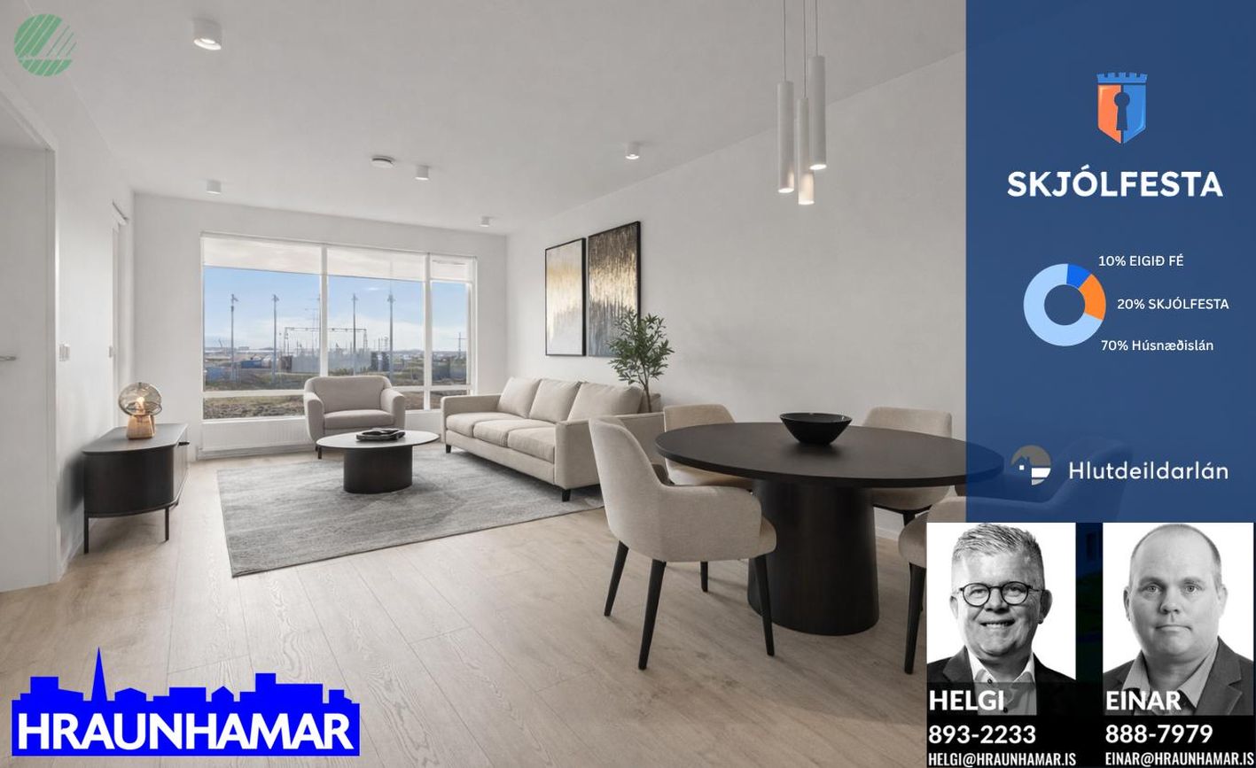 Fasteignasalan TORG kynnir: Nýbygging við Áshamar 20-22, Hafnarfirði. Eignin er íbúð á fjórðu hæð og er fjögurra herbergja og 109,2 fm, þar af 8,1 fm geymsla í sameign. Ísskápur og innbyggð uppþvottavél fylgir. Sameiginlegur inngangur og 9,4 fm svalir út frá stofu. Íbúðinni fylgir stæði (B054) í lokuðum bílakjallara. Stutt er í alla helstu þjónustu. Afhending er við kaupsamning. Íbúðir skilast fullbúin samkvæmt byggingastigi 7, parket á gólfum nema í votrýmum, sem verða flísalögð. BÓKIÐ SKOÐUN – MATTHILDUR LGFS SÍMI 690 4966 - EMAIL MATTHILDUR@FSTORG.IS. SÆKJA SÖLUYFIRLIT HÉR.