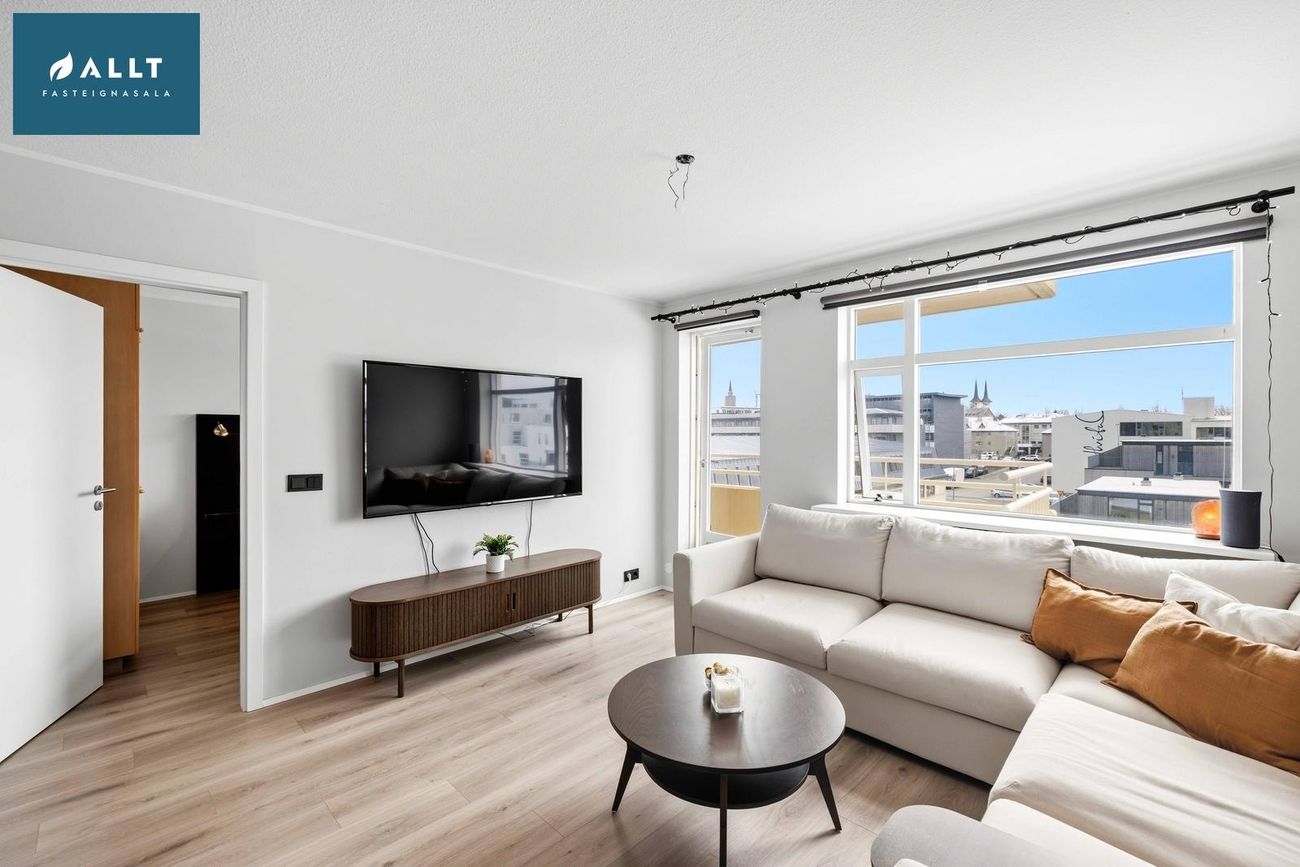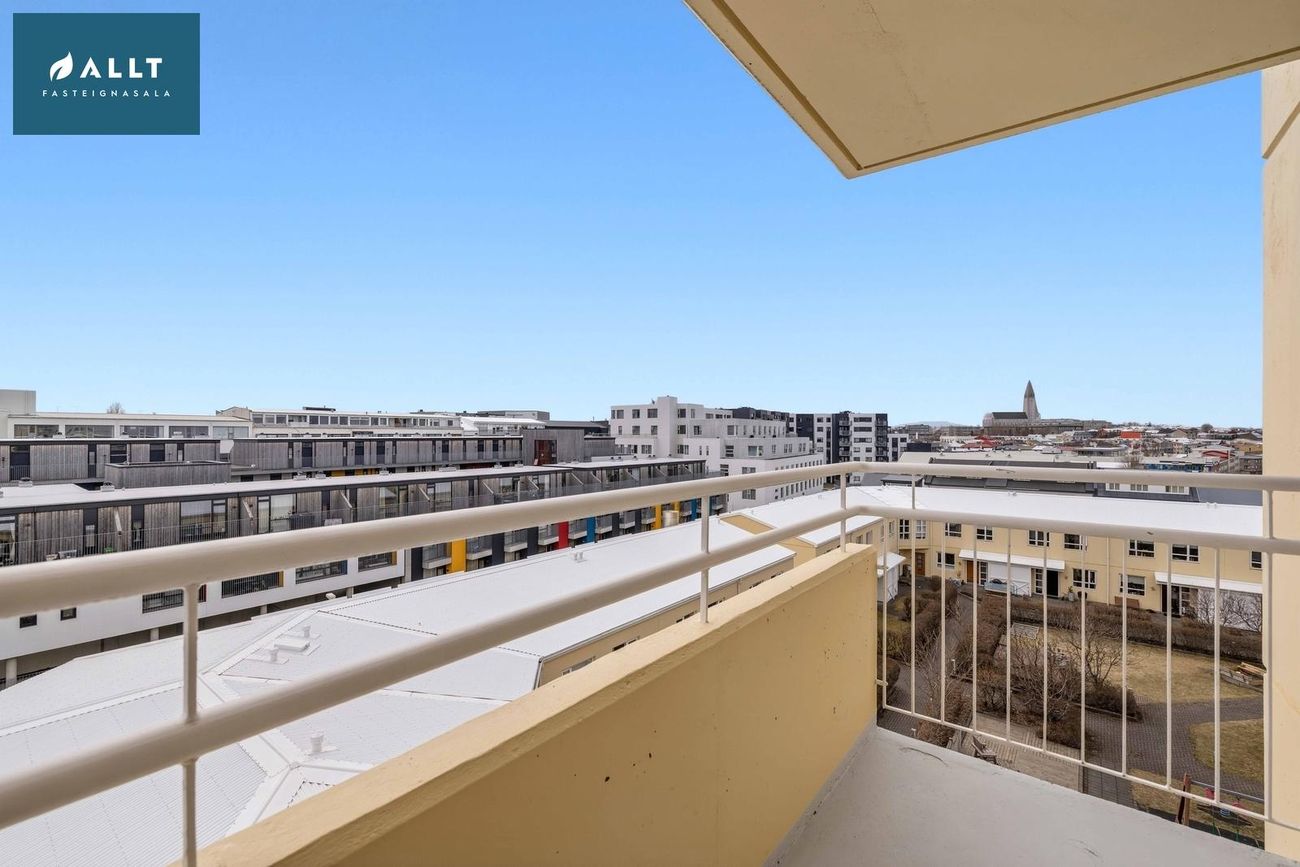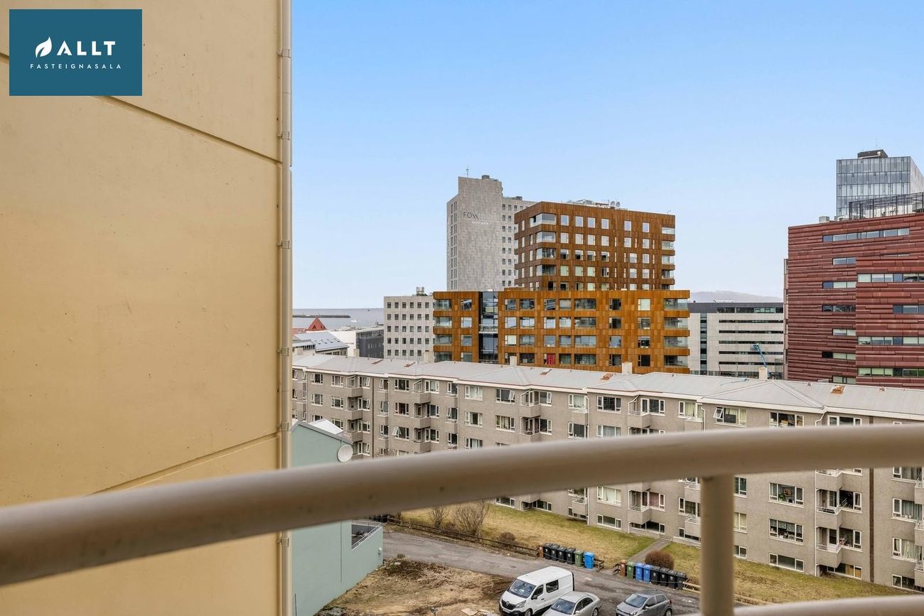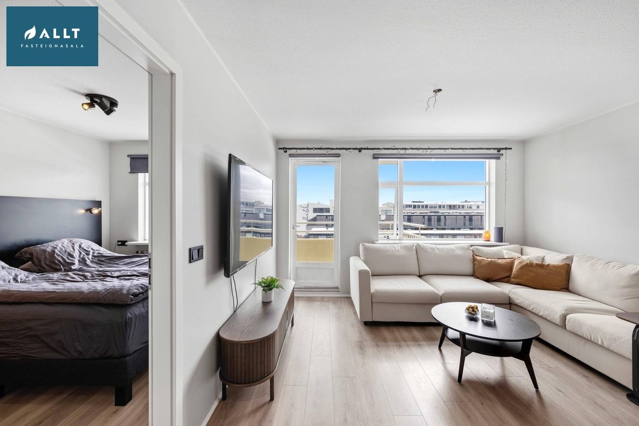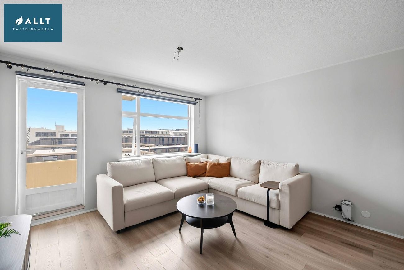 ** Þakjárn endurnýjað 2025Íbúðin er staðsett á 6. hæð í íbúðarkjarna við rætur miðbæjarins. Sameiginlegur og vel gróinn garður fyrir allar íbúðir kjarnans sem er rólegur og aðeins aðgengilegur íbúum. Leiksvæði, verönd og bekkir eru til staðar í garðinum. Húsvörður er í húsinu, vel rekið húsfélag og öll sameign og samskipti milli nágranna til fyrirmyndar.