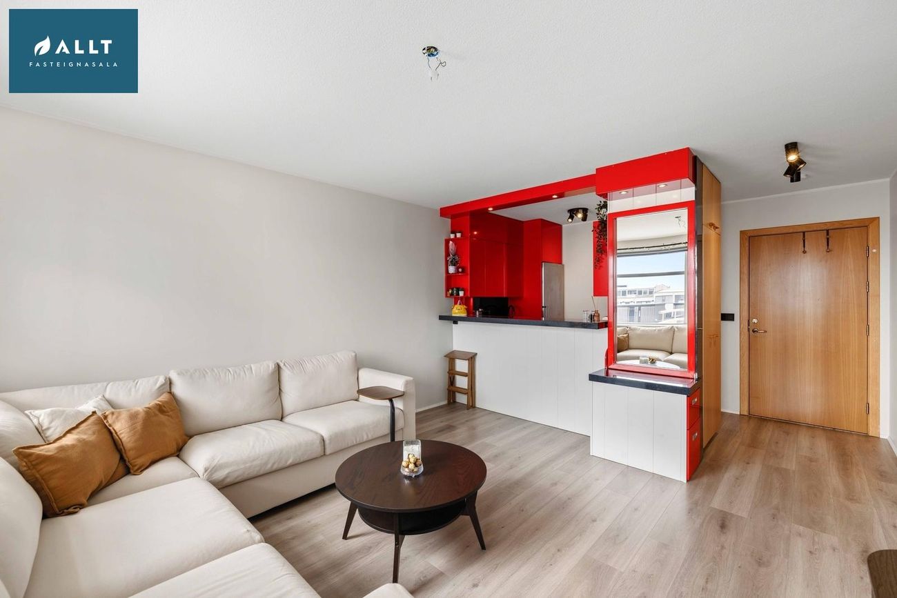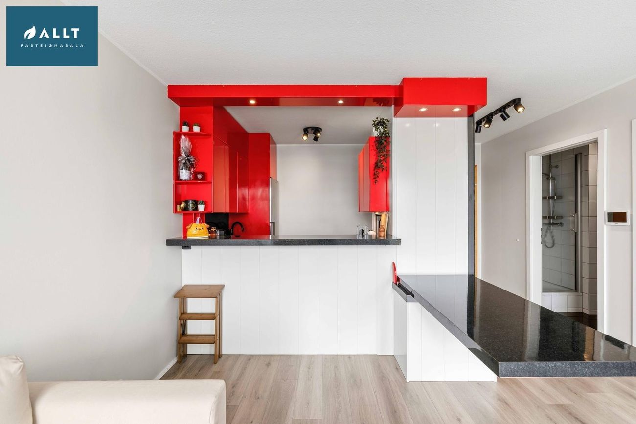 Páll Þorbjörnsson Löggiltur fasteignasali, í síma 560-5501, tölvupóstur pall@allt.is.Nánari lýsing á eigninni.Komið er inn í hol með forstofuskáp. Í eldhúsi rauð háglans innrétting með góðu skápaplássi, borðplata er gráyrjótt og svart gler er á milli skápa og tengi fyrir borðuppþvottavél. Björt og rúmgóð stofa með útgengi á suðursvalir með fallegu útsýni. Spegill í stofu er einnig niðurfellanlegt borð. Baðherbergið er flísalagt í hólf og gólf, innrétting með handlaug, tengi fyrir þvottavél, upphengt salerni og sturtuklefi. Svefnherbergi með góðu skápaplássi og rúmgafl með náttborðum og ljósum. Harðparket er á stofu,eldhúsi, holi og svefnherbergi.