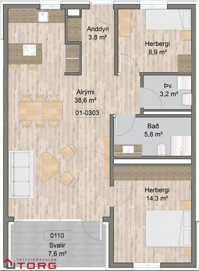 Elínborg Ósk Jensdóttir löggiltur fasteignasali, í síma 823-1334 eða elinborg@allt.isNánari lýsing á íbúð 303:Eldhús/borðstofa og stofa: Eldhúsinnréttingar eru sérsmíðaðar frá GKS. Eldhúsvaskur og blöndunartæki fylgja frá GKS. Bora helluborð með innbyggðu sogi, ofn með blæstri, örbylgjuofn, innbyggð uppþvottavél og innbyggður kæliskápur frá Siemens. Virkilega bjart og fallegt rými með innbyggðri lýsingu í loftum, með dimmerum. Áætluð afhending er í júlí 2026.