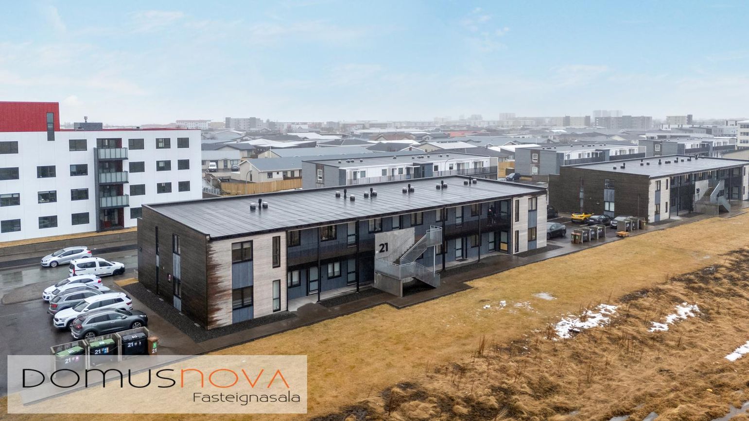 Almenn lýsing:Asparskógar 21 er fjölbýlishús á tveimur hæðum með 12 íbúðum. Sameiginleg geymsla fyrir hjól og vagna ásamt inntaksrými er á jarðhæð, ásamt geymslum fyrir hluta íbúða, aðrar geymslur eru inni í viðkomandi íbúðum. Svalagangur tengir íbúðir á efri hæð. Húsið er timburhús unnið úr einingum klædd að utan með Cembrit klæðningu og brunavarinni timburklæðningu.
