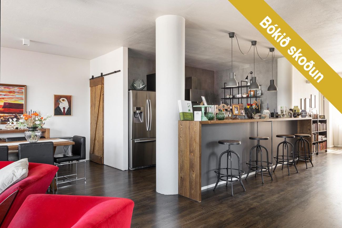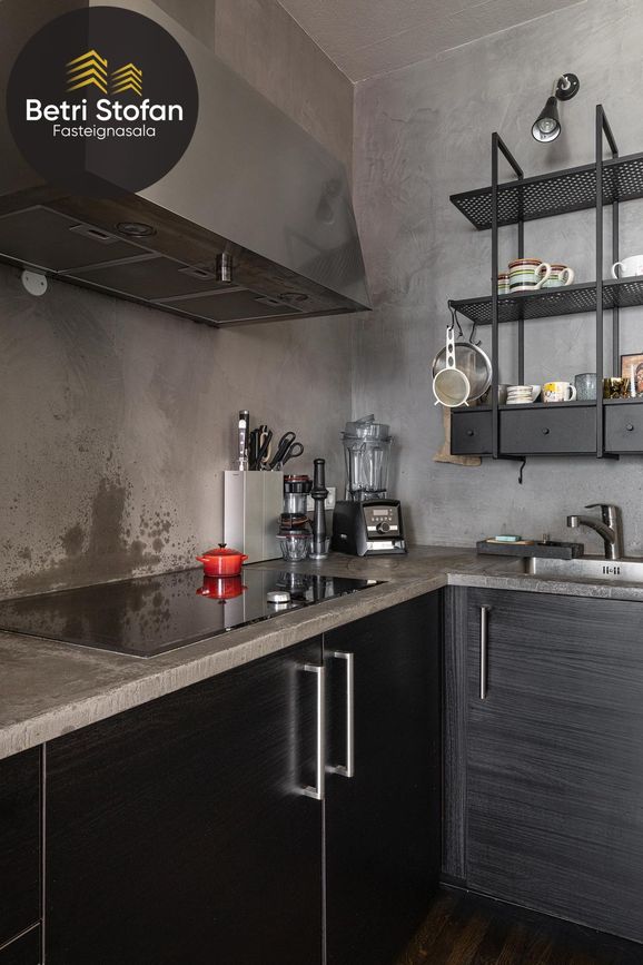 Sett upp 2017. Opið með skemmtilegu barborði. Innrétting frá Ikea. Ný tækji úr Ormsson setrinu. Veggir og borðplata úr Mortex. Pláss fyrir tvöfalldan ísskáp (hugsanlega fylgir). Tengi fyrir uppþvottavél. Flott barborð. Rúmgott búr með hillum við hlið með old style barn rennihurð. Barborð, borðstofuborð og rennihurð í búr í sama viðarefni.