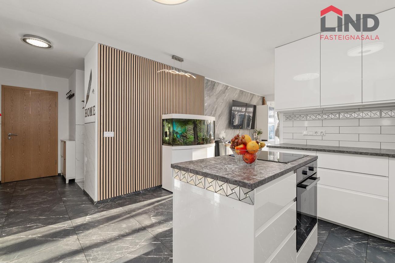 hvítri innréttingu sem nær upp í loft og eldunareyju. Samliggjandi bjartar stofur með fallegu