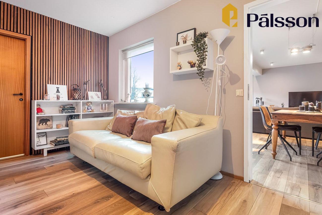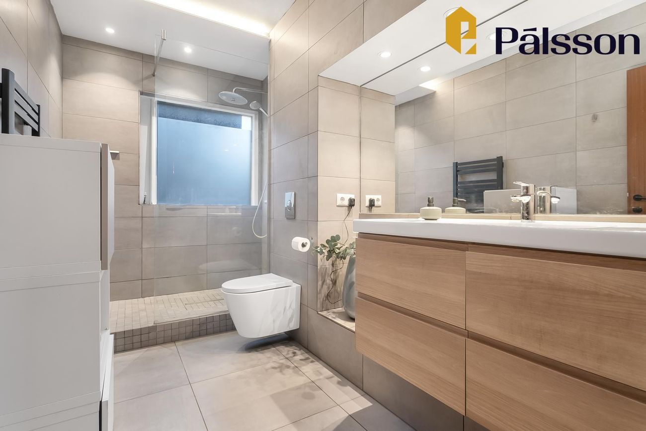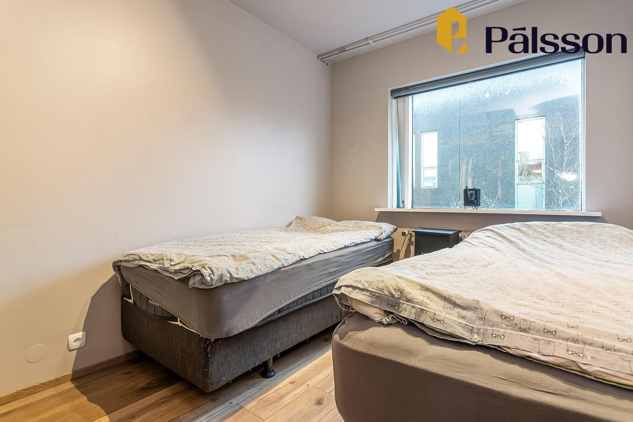 Sér þvottahús innan íbúðar með plássi fyrir þvottavél/þurrkara og geymslu.