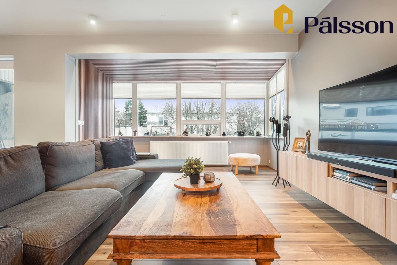 157,8 fm, 6 herbergja íbúð með 4 svefnherbergjum, 2 stofum, baðherbergi og innbyggðu þvottahúsi.