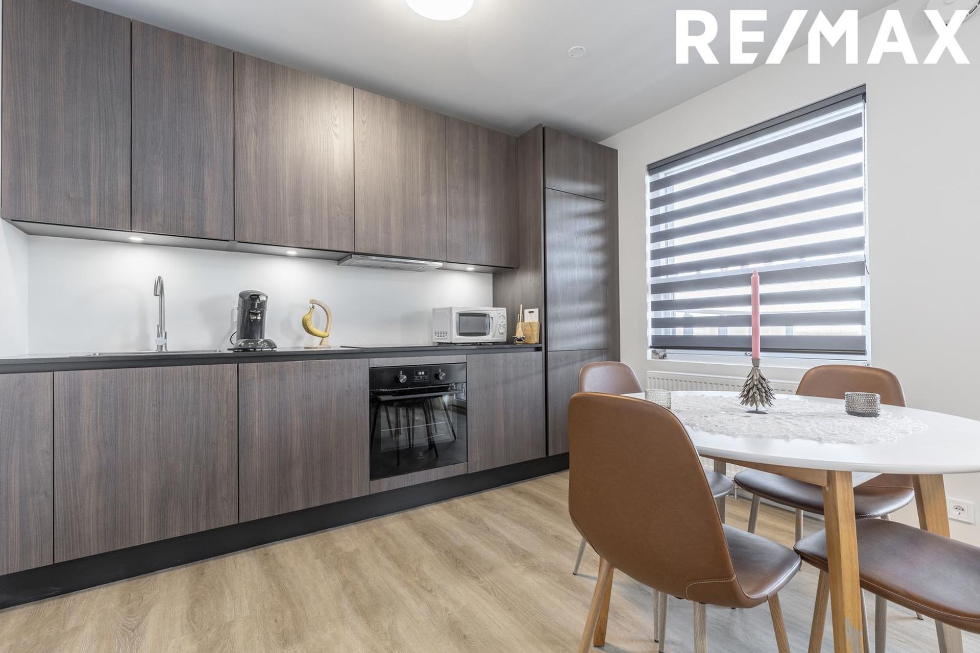 Eldhús og stofa eru í opnu björtu rými. Innrétting með innbyggðri uppþvottavél, innbyggðum ísskáp, ofn, helluborð og vifta, steinn á borðum. Útgengt á flísalagðar sólríkar 8,4fm svalir.