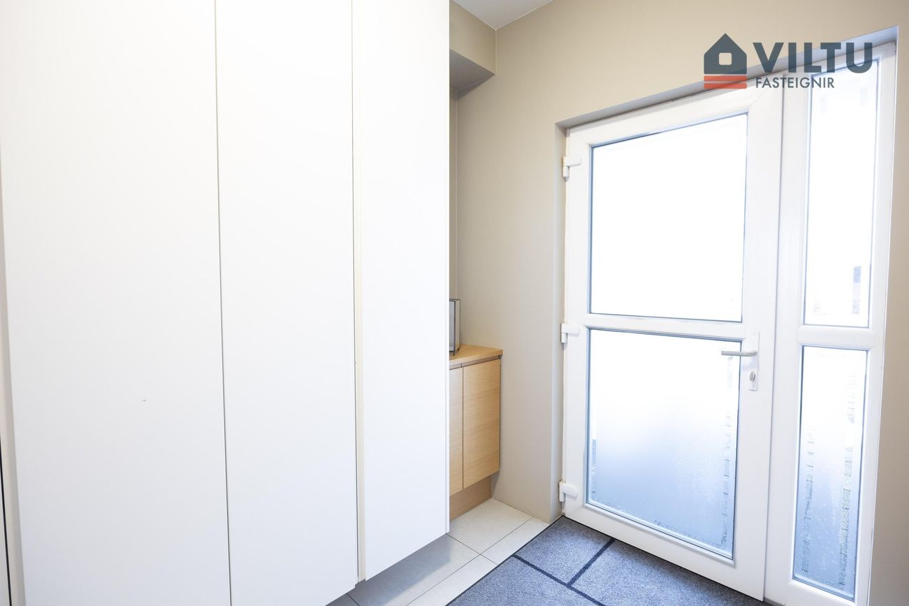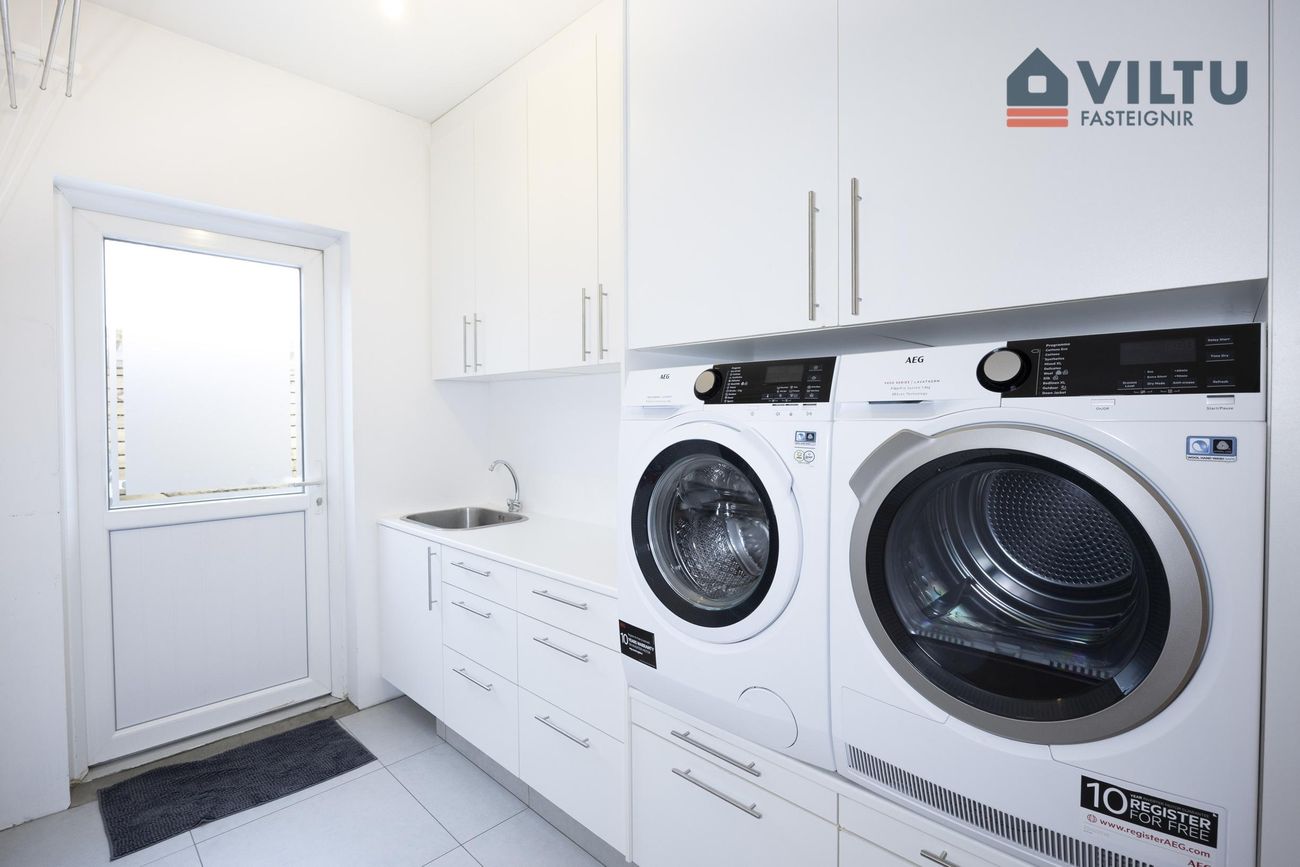 Þvottahús með flísgólfi og útgangi á verönd og 15fm upphituðri útigeymslu.