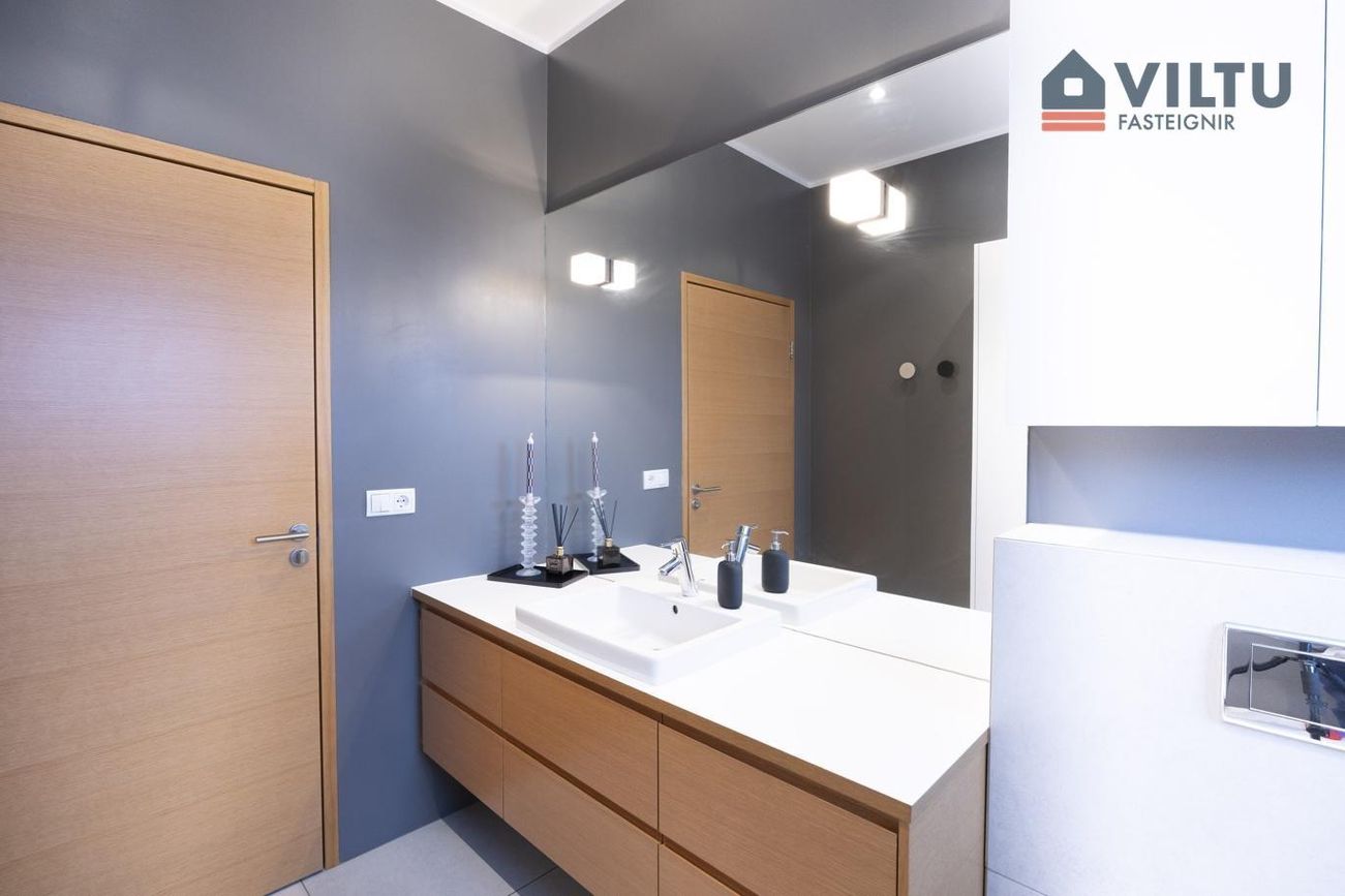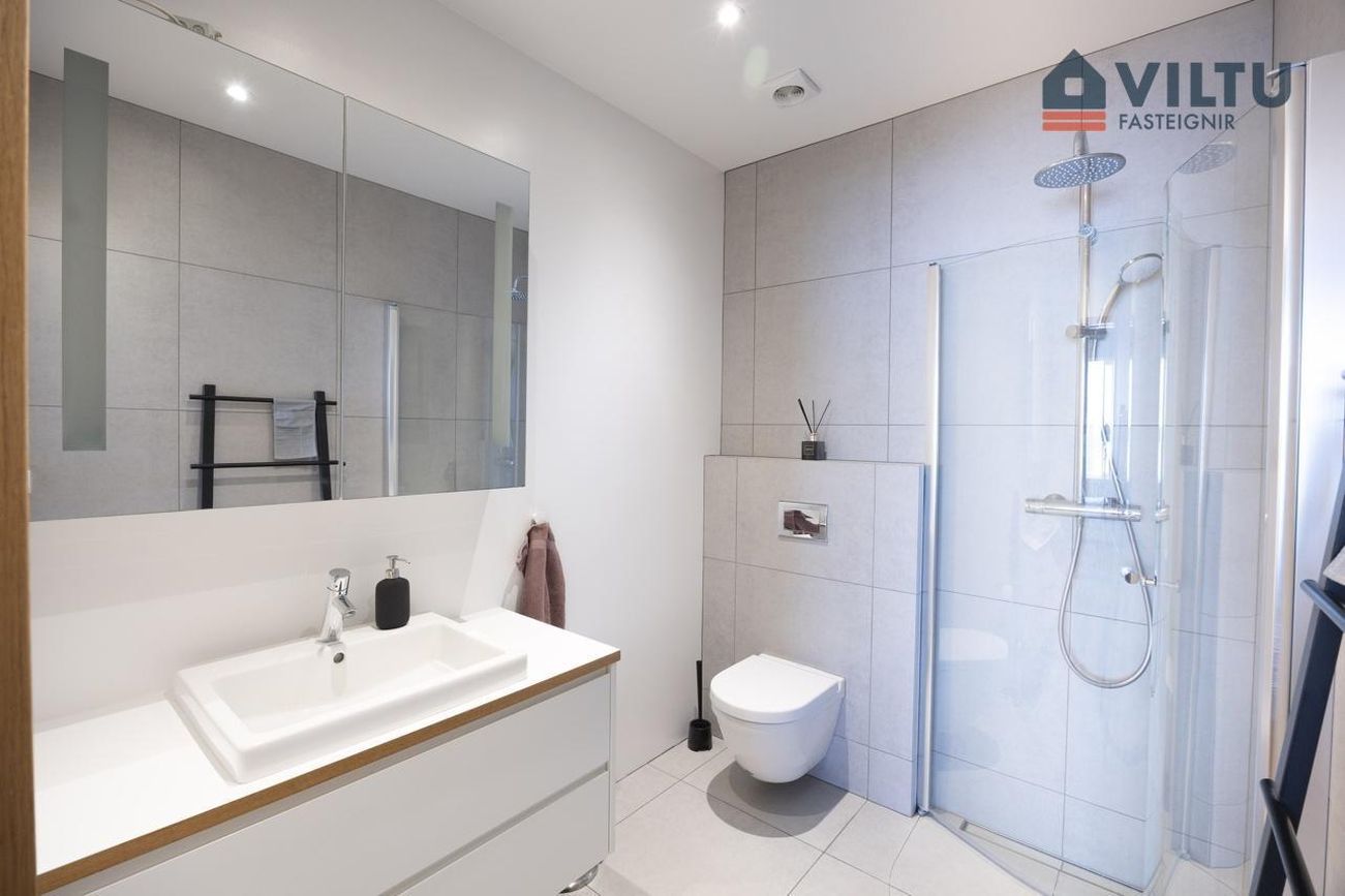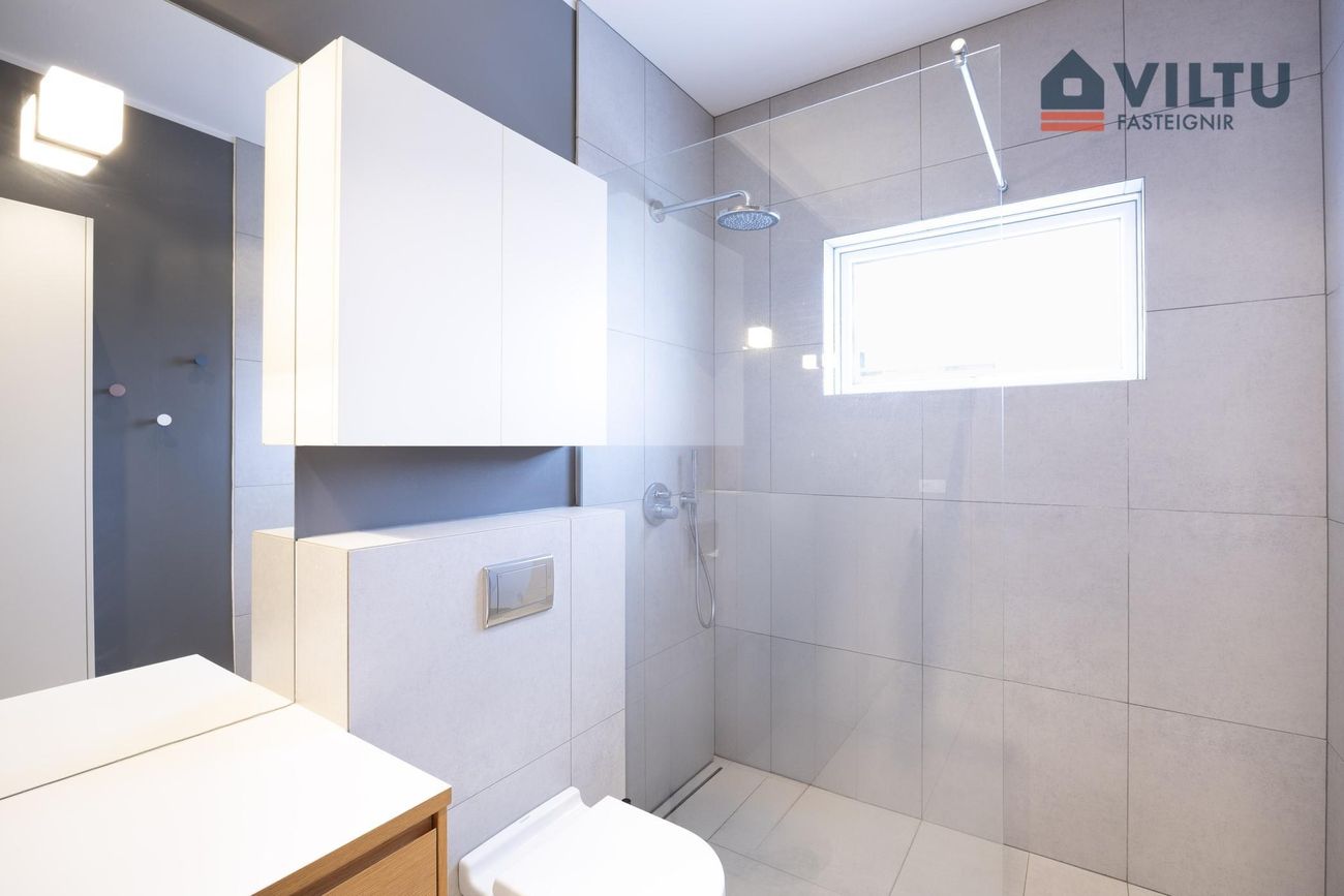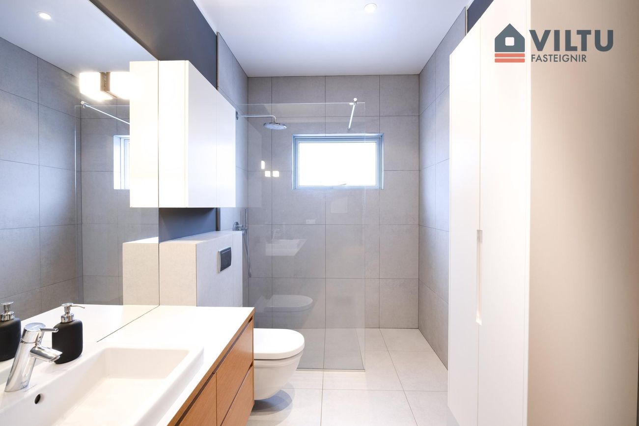 Tvö baðherbergi, eitt með walk-in sturtu, upphengdu salerni og flísum á gólfi og veggjum.