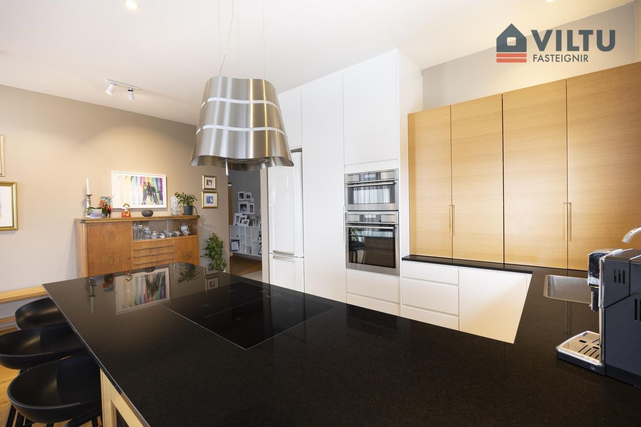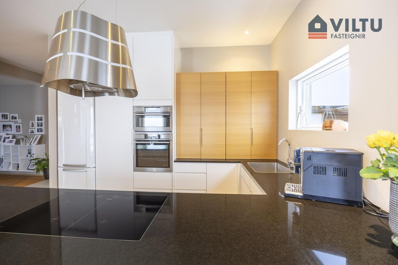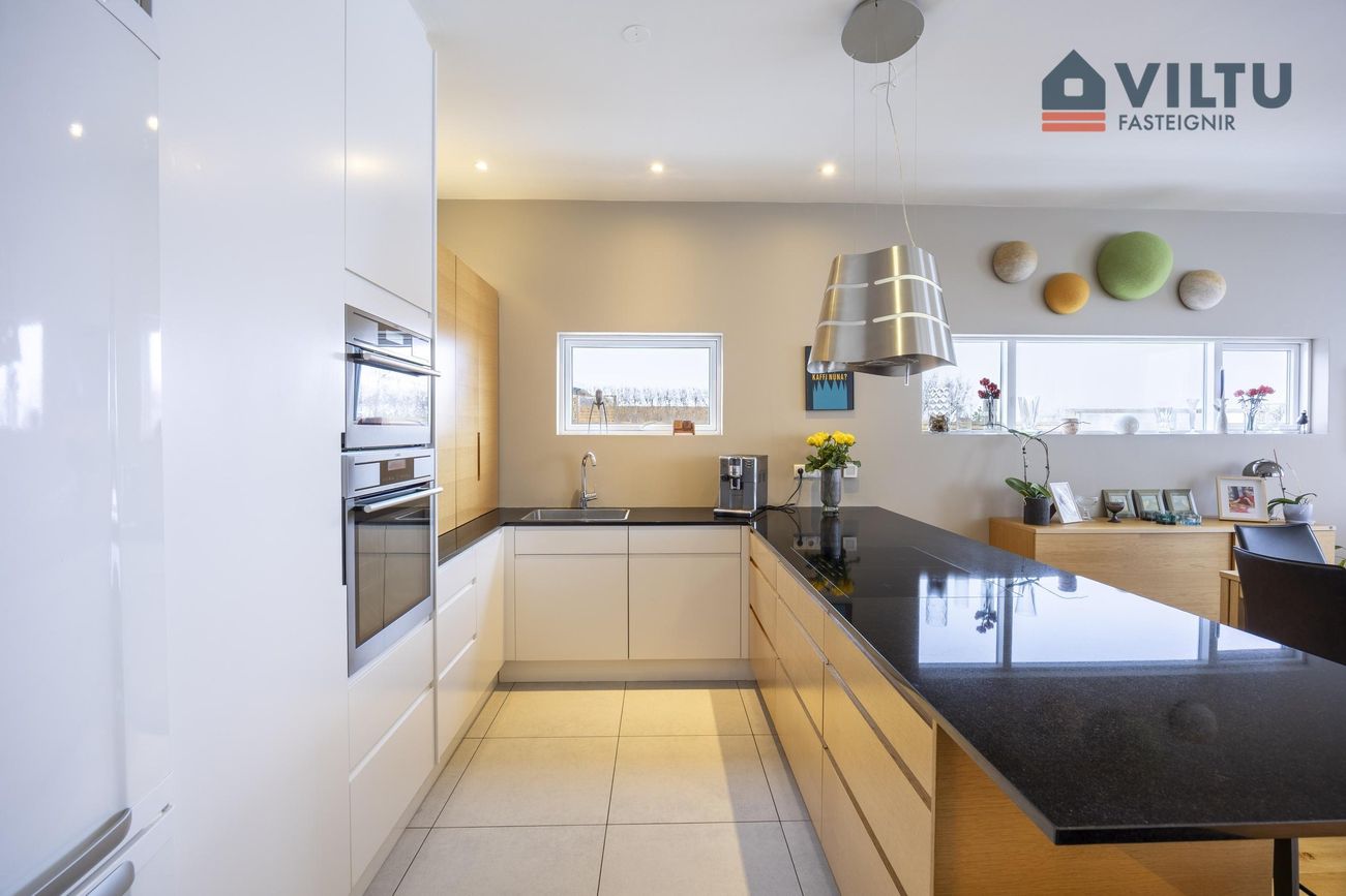 Fallegt eldhús með steinborðplötu, tveimur bakaraofnum (annar comby-ofn) og góðum tækjaskáp.