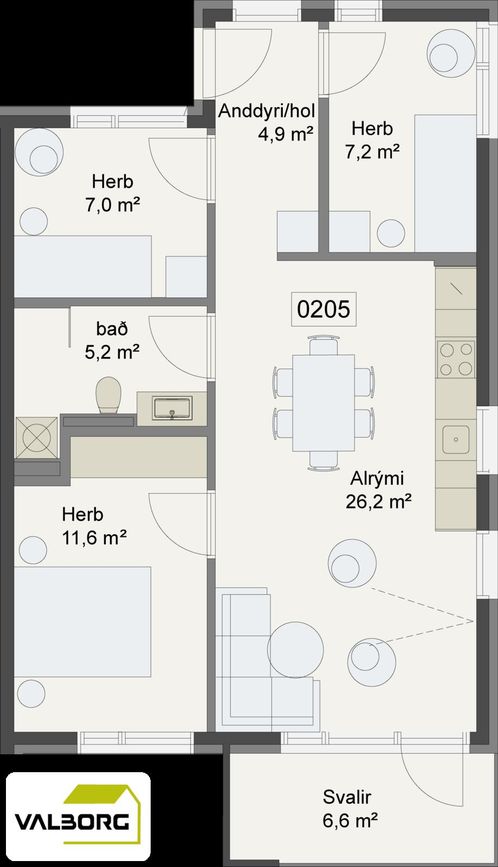 Alrými með stofu og eldhúsi. Útgengt er úr alrými á suðursvalir.