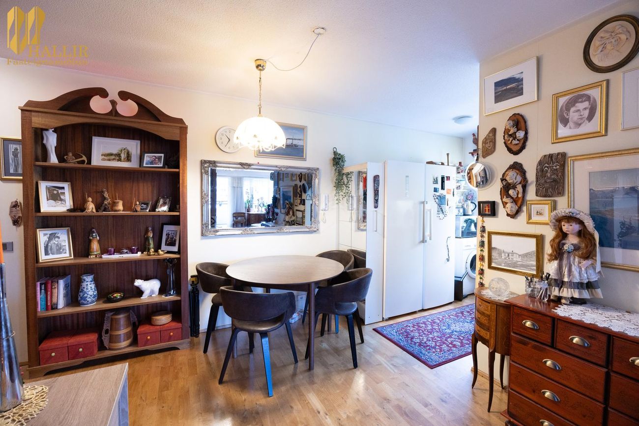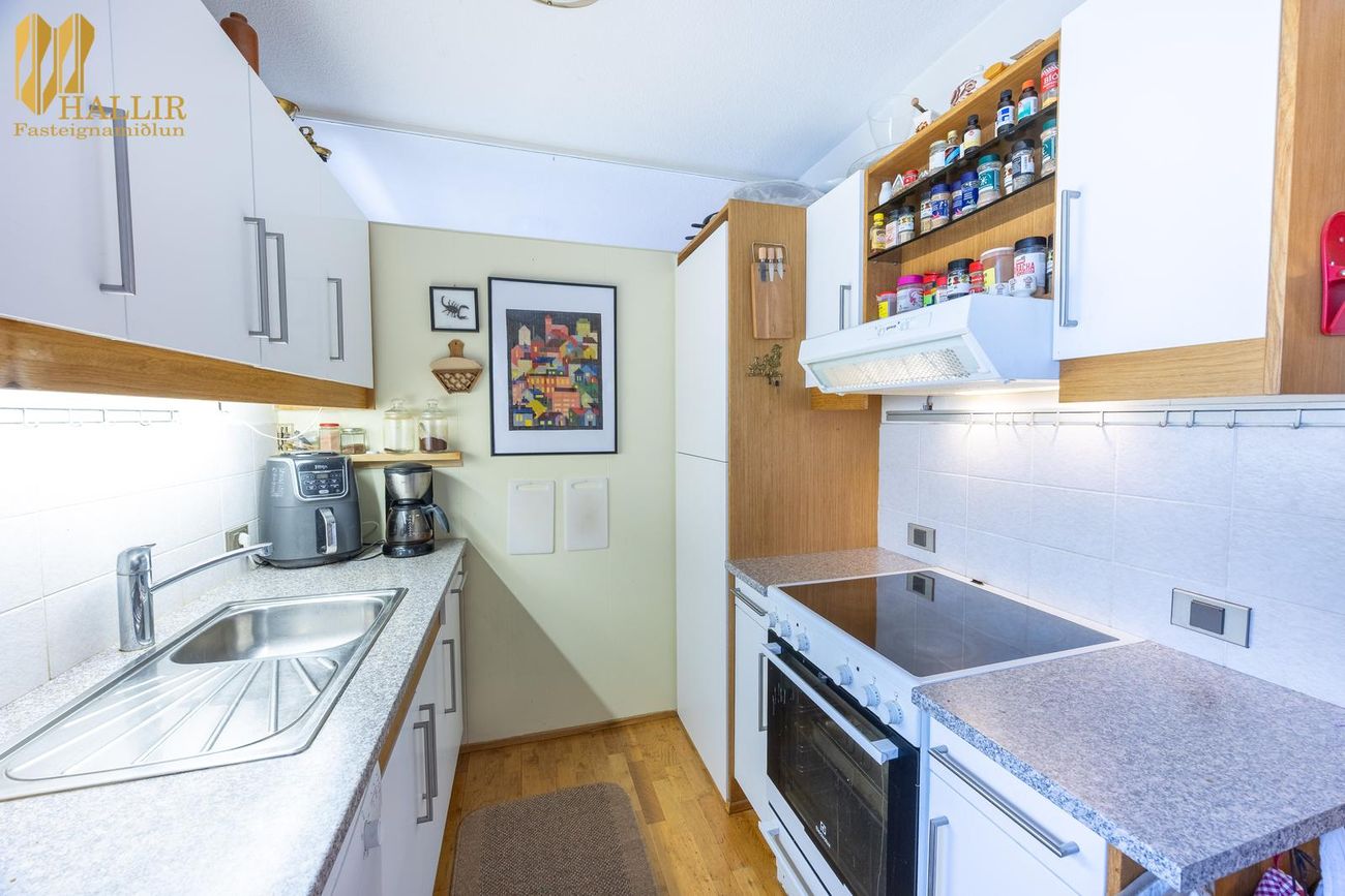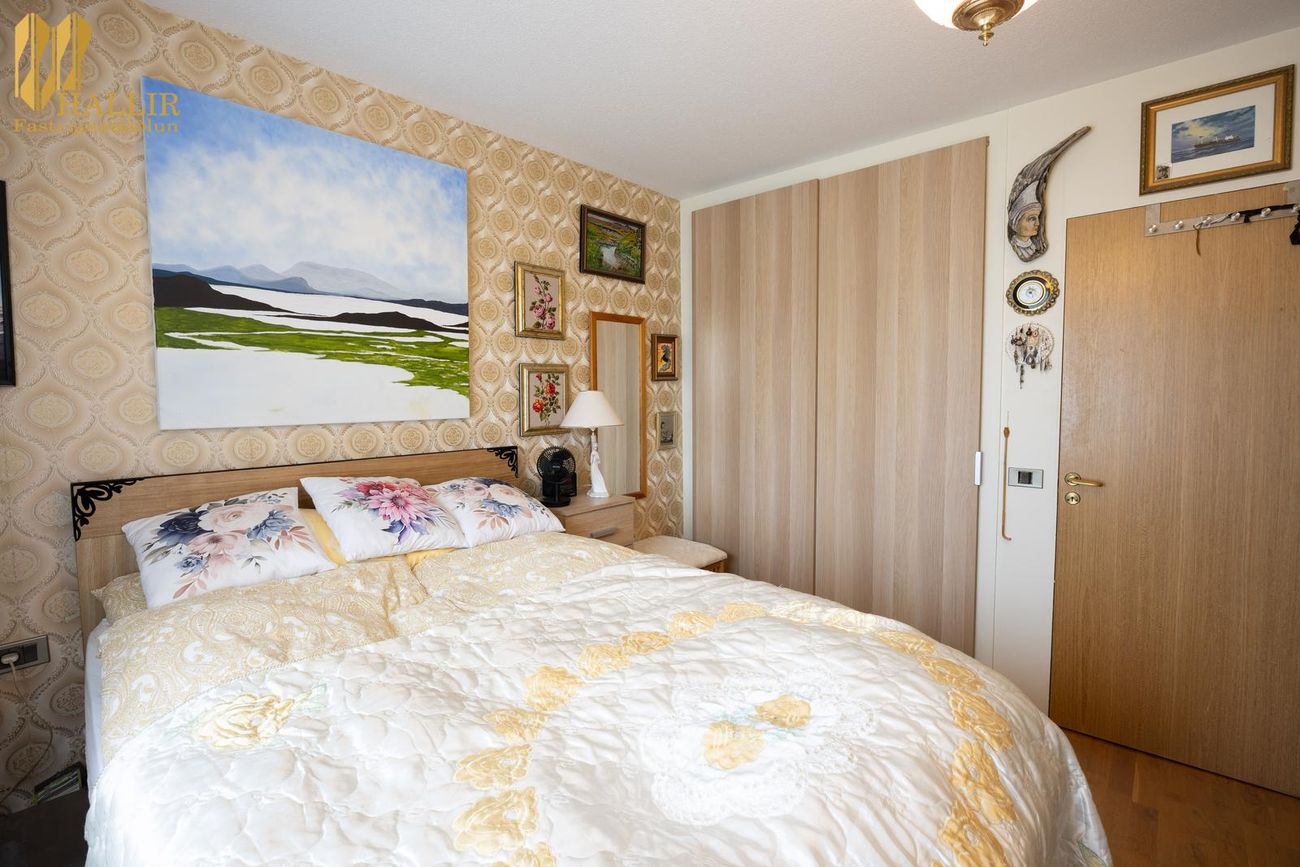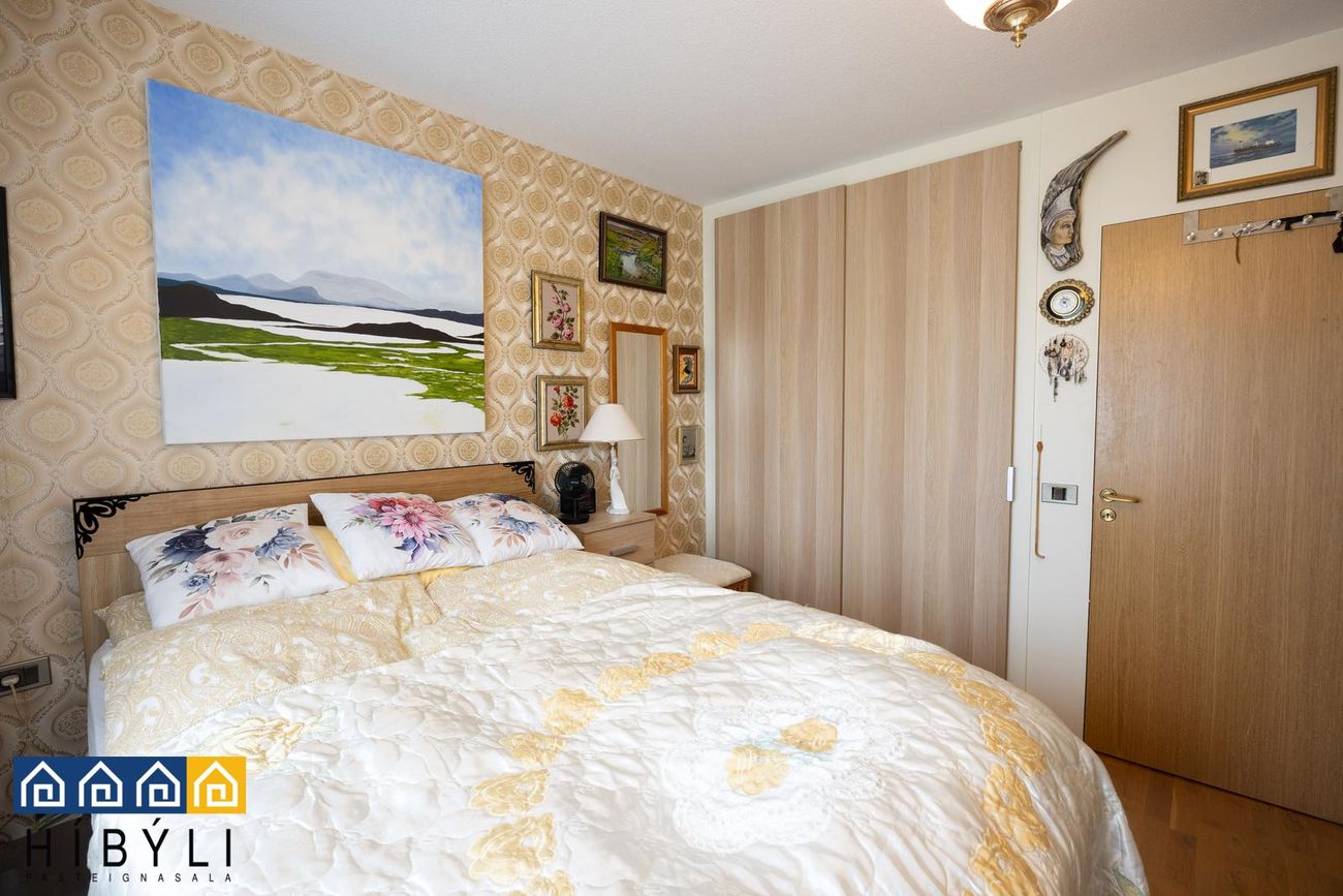 Komið er inn í forstofu með fataskáp. Eldhús er með hvítri innréttingu og góðu skápa- og vinnuplássi. Möguleiki er að færa eldhús inn í stofu og bæta við herbergi. Svefnherbergi er rúmgott með fataskáp. Stofan er björt og rúmgóð með útgengi á suð-vestur svalir. Baðherbergi er með hvítri innréttingu undir vaski og hornsturtuklefa. GÓLFEFNI parket er á öllum gólfum nema á baðherbergi en þar eru flísar.