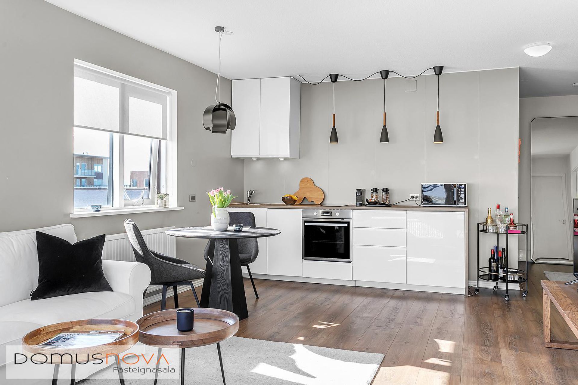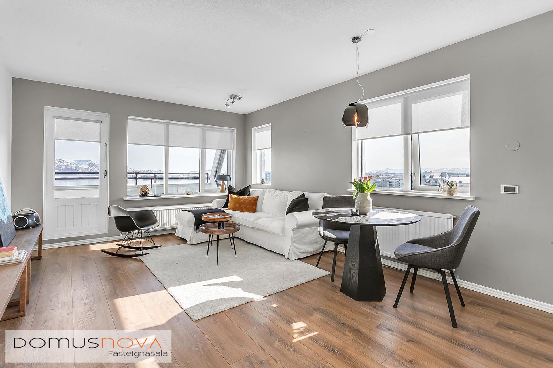 Björgvin Þór Rúnarsson löggiltur fasteignasali og Domusnova fasteignasala kynna gullfallega og vel skipulagða þriggja herbergja íbúð á 7. hæð við Austurströnd 8, Seltjarnarnesi.Stæði í bílageymsluhúsi er skráð 26,1 fm brúttó og er þvi heildar samtala eignarinnar 94,3m2.Lyftuhús með sér stæði í upphitaðri bílageymslu.Íbúðin skiptist í forstofu, 2 svefnherbergi, baðherbergi, eldhús og stofu. Svalir snúa í norður og austur er er útsýnið stórkostlegt úr íbúðinni.Íbúðinni fylgir sameiginlegt þvottahús á hæðinni.Sér Stæði í upphitaðri bílageymslu merkt í bílageymslu 03-B021.Nánari lýsing:Andyri er parketlagt með góðum skápum.Bjart eldhús, opið inn í stofu, innrétting er hvít með með fallegum við.Bæði svefnherbergi eru parketi og með fataskápum .Baðherbergi er með fallegri innréttingu, góðum skáp, flísum á gólfi og veggjum, salerni og baðkari með sturtu.. Þvottahús er sameiginlegt með fjórum öðrum íbúðum á hæðinni, með sama nýtanlegri þvottavél og þurrkara. Geymsla á annarri hæð, snyrtileg sameign með lyftu.Allir gluggar voru málaðir að utan árið 2019.Yfirfarnar og lagfærðar rennur og skipt um lausafög árið 2019.Skipt um öll ljós á göngum með hreyfiskynjurum í okt. 2021.Skipt var um allar rafmagns stýringar í lyftu í nóv 2021. Stutt í alla helstu þjónustu. Verslun, skóli, leikskóli og sundlaug í göngufæri. Nánari upplýsingar veita:Skrifstofa / s.527-1717 / Björgvin Þór Rúnarsson löggiltur fasteignasali / s.8551544 / Um skoðunar- og aðgæsluskyldu:Í lögum um fasteignakaup nr. 40/2002 er kveðið á um ríka skoðunarskyldu kaupenda á fasteignum. DOMUSNOVA fasteignasala bendir væntanlegum kaupendum á að kynna sér vel ástand fasteigna við skoðun og fyrir tilboðsgerð og ef þurfa þykir að leita til sérfræðinga um nánari ástandsskoðun.Forsendur söluyfirlits:Söluyfirlit er samið af fasteignasala í samræmi við ákvæði laga nr. 70/2015. Þær upplýsingar sem fram koma í söluyfirliti þessu eru sóttar í opinberar skrár, til seljanda sjálfs og eftir atvikum til húsfélags. Seljandi veitir upplýsingar um eign í samræmi við upplýsingaskyldu laga um fasteignakaup nr. 40/2002, og ábyrgist að þær séu réttar. Fasteignasali sannreynir að þær upplýsingar séu réttar með sjónskoðun á eigninni. Fasteignasali getur ekki fullyrt um ástand og eiginleika þeirra hluta fasteigna sem ekki eru aðgengilegir og sjást ekki berum augum, t.d. lagnir, dren, skólp og þak. Það sama á við um staðhæfingar seljanda eignar um viðhald og einstaka framkvæmdir.Gjöld sem kaupandi þarf að standa straum af vegna kaupanna:Stimpilgjald af kaupsamningi sem er hlutfall af fasteignamati. Stimpilgjald er 0,8% fyrir einstaklinga (0,4% við fyrstu kaup) og 1,6% fyrir lögaðila.Þinglýsingargjald af kaupsamningi, veðskuldabréfum, veðleyfum o.fl. Þinglýsingargjald er kr. 2.500,- fyrir hvert skjal.Lántökugjald lánastofnunar. Um lántökugjald vísast í gjaldskrá viðkomandi lánveitanda.Umsýsluþóknun fasteignasölu skv. gjaldskrá.Nánari upplýsingar veita:Skrifstofa / s.527-1717 / Björgvin Þór Rúnarsson löggiltur fasteignasali / s.8551544 / Um skoðunar- og aðgæsluskyldu:Í lögum um fasteignakaup nr. 40/2002 er kveðið á um ríka skoðunarskyldu kaupenda á fasteignum. DOMUSNOVA fasteignasala bendir væntanlegum kaupendum á að kynna sér vel ástand fasteigna við skoðun og fyrir tilboðsgerð og ef þurfa þykir að leita til sérfræðinga um nánari ástandsskoðun.Forsendur söluyfirlits:Söluyfirlit er samið af fasteignasala í samræmi við ákvæði laga nr. 70/2015. Þær upplýsingar sem fram koma í söluyfirliti þessu eru sóttar í opinberar skrár, til seljanda sjálfs og eftir atvikum til húsfélags. Seljandi veitir upplýsingar um eign í samræmi við upplýsingaskyldu laga um fasteignakaup nr. 40/2002, og ábyrgist að þær séu réttar. Fasteignasali sannreynir að þær upplýsingar séu réttar með sjónskoðun á eigninni. Fasteignasali getur ekki fullyrt um ástand og eiginleika þeirra hluta fasteigna sem ekki eru aðgengilegir og sjást ekki berum augum, t.d. lagnir, dren, skólp og þak. Það sama á við um staðhæfingar seljanda eignar um viðhald og einstaka framkvæmdir.Gjöld sem kaupandi þarf að standa straum af vegna kaupanna:Stimpilgjald af kaupsamningi sem er hlutfall af fasteignamati. Stimpilgjald er 0,8% fyrir einstaklinga (0,4% við fyrstu kaup) og 1,6% fyrir lögaðila.Þinglýsingargjald af kaupsamningi, veðskuldabréfum, veðleyfum o.fl. Þinglýsingargjald er kr. 2.500,- fyrir hvert skjal.Lántökugjald lánastofnunar. Um lántökugjald vísast í gjaldskrá viðkomandi lánveitanda.Umsýsluþóknun fasteignasölu skv. gjaldskrá.Ef um nýbyggingu er að ræða greiðir kaupandi skipulagsgjald, 0,3% af brunabótamáti, þegar það er lagt á.