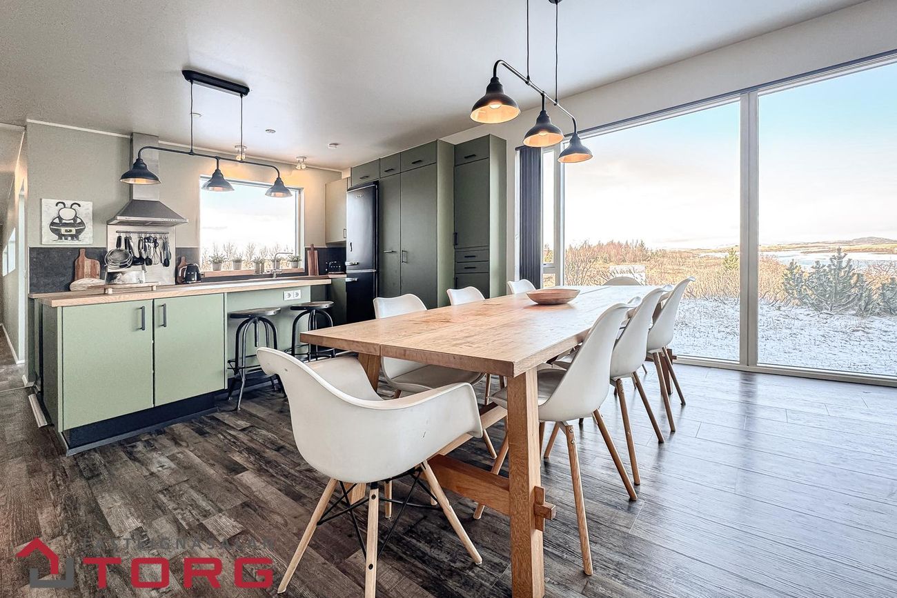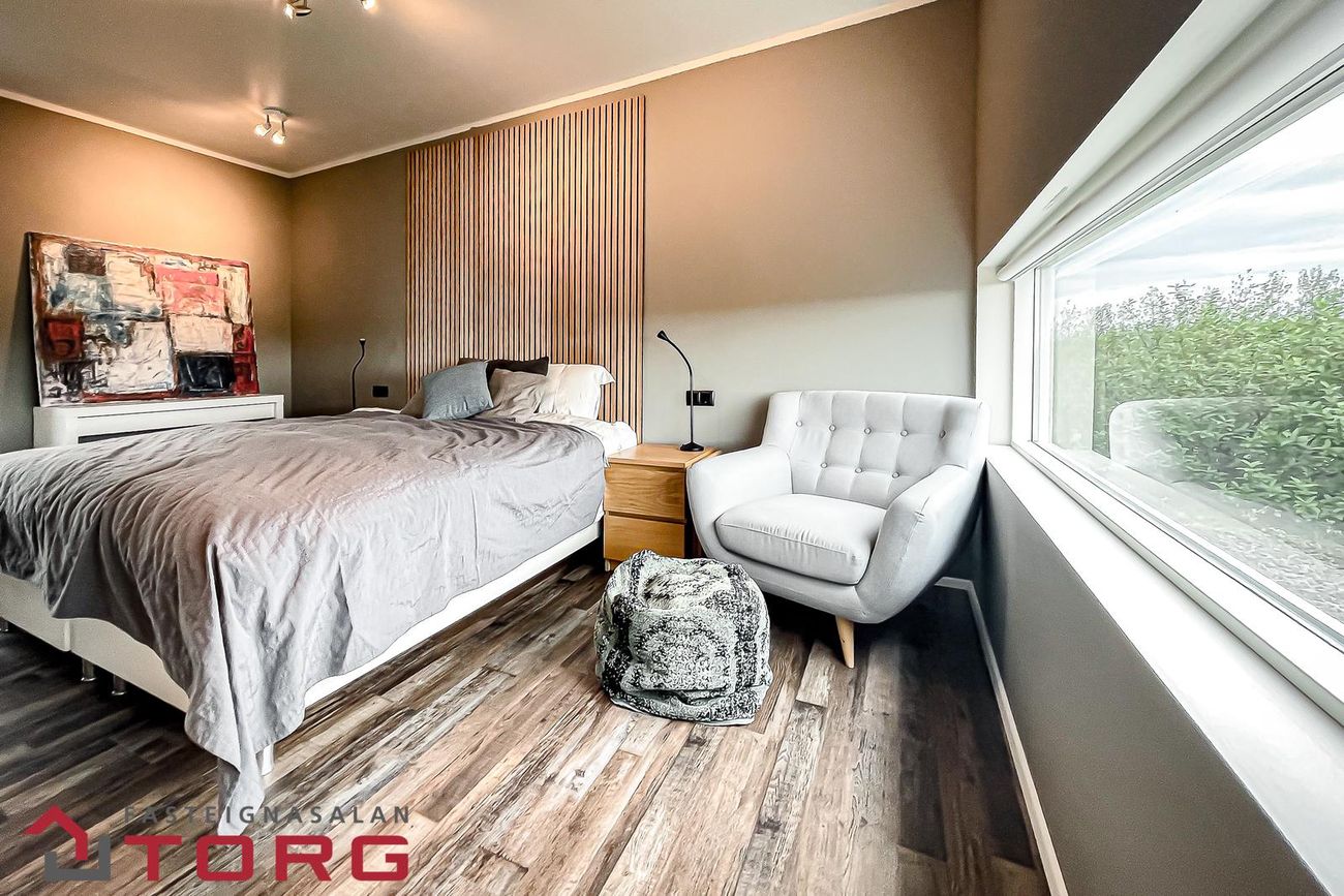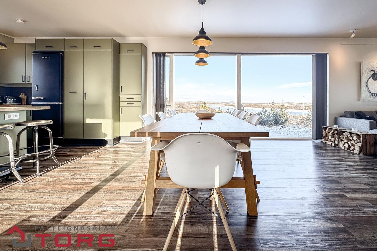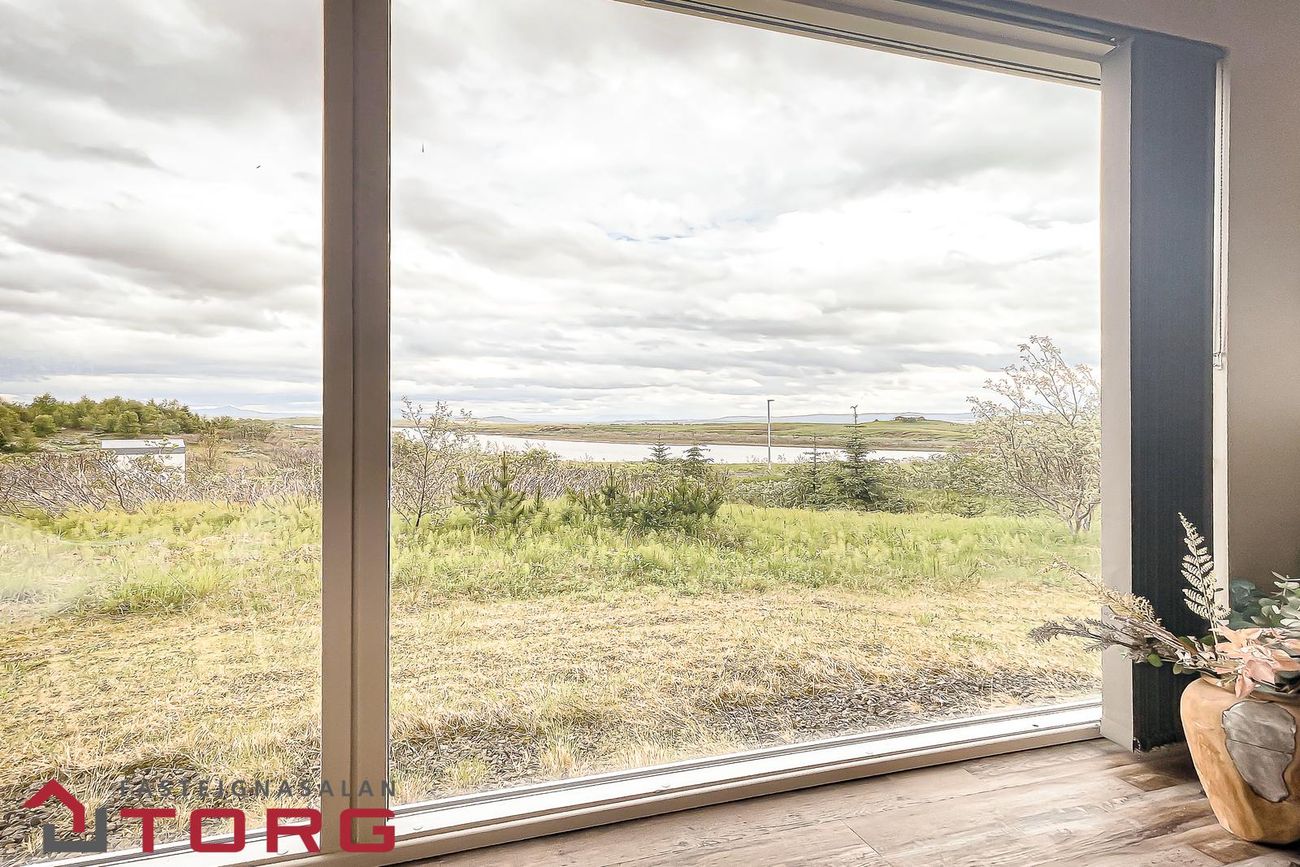 Þrjú rúmgóð svefnherbergi, þar á meðal hjónaherbergi með panorama glugga og útsýni yfir Langjökul.