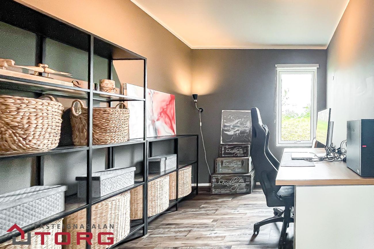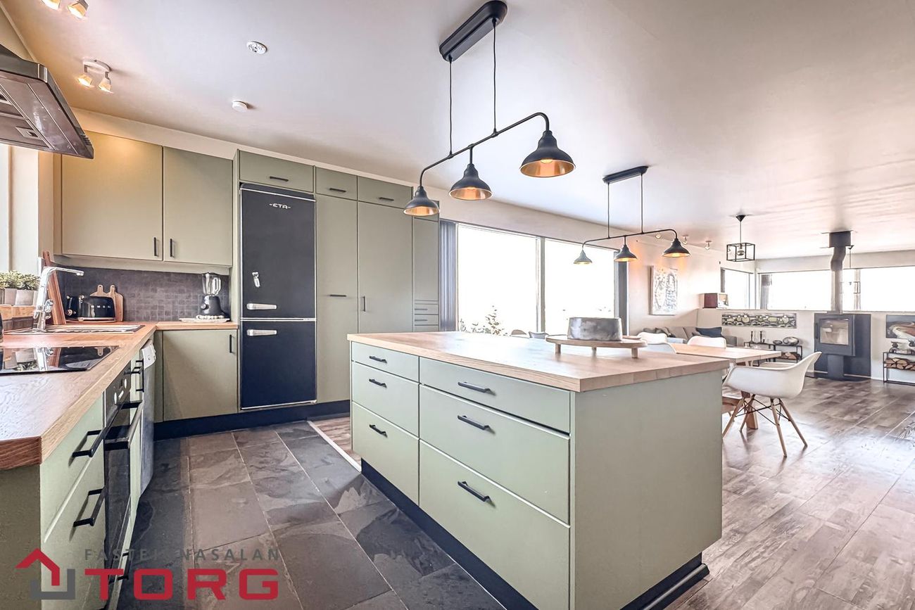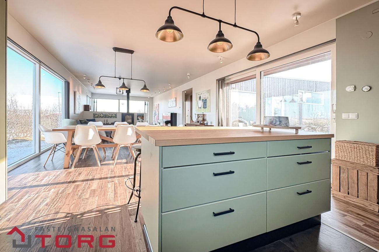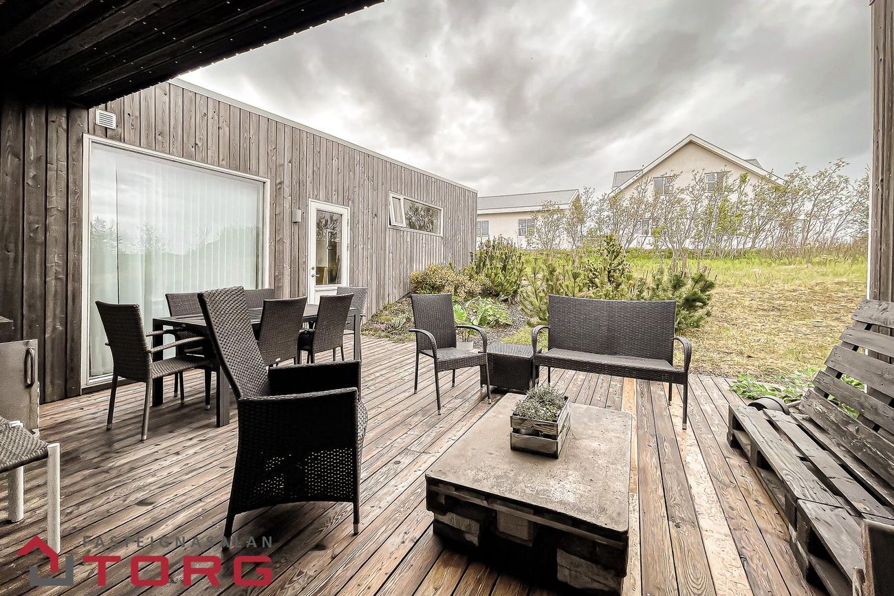 Opið alrými með kamínu, samliggjandi setustofu með aukinni lofthæð og stórum gluggum. Útgengi á timburverönd.