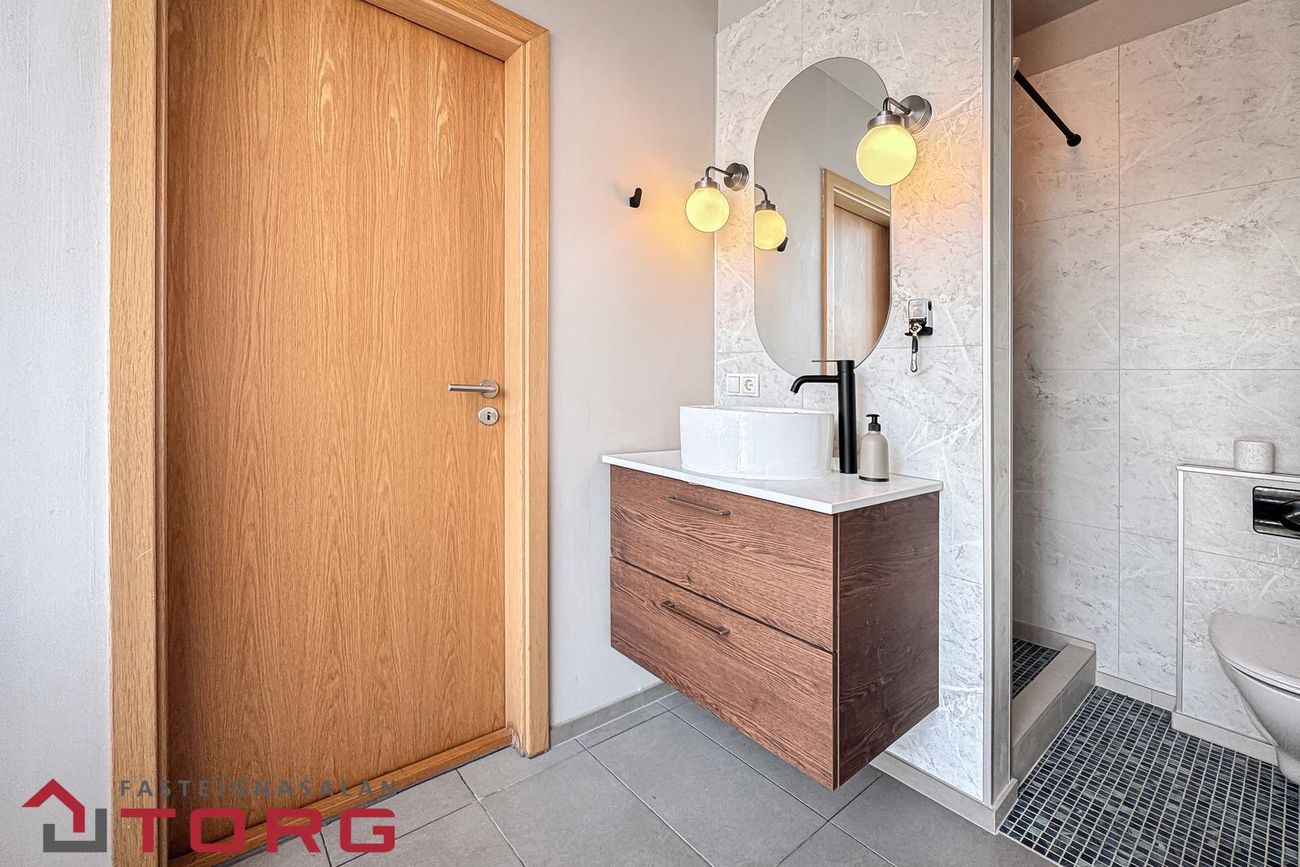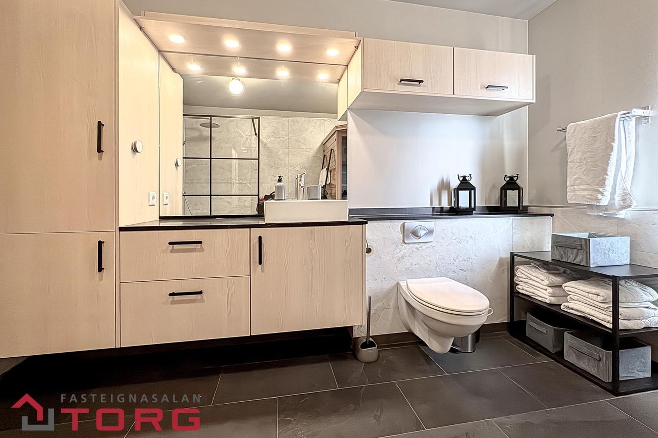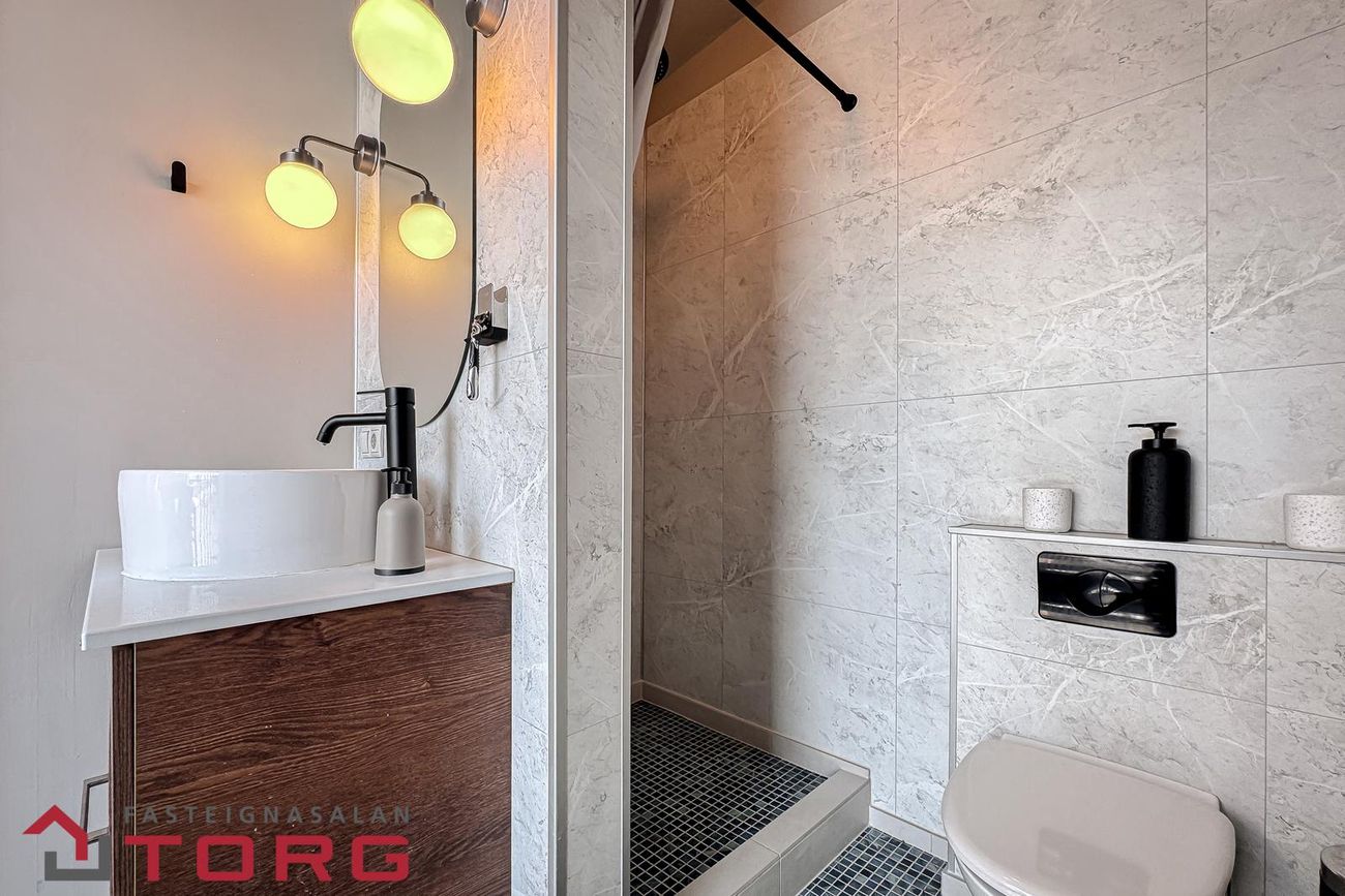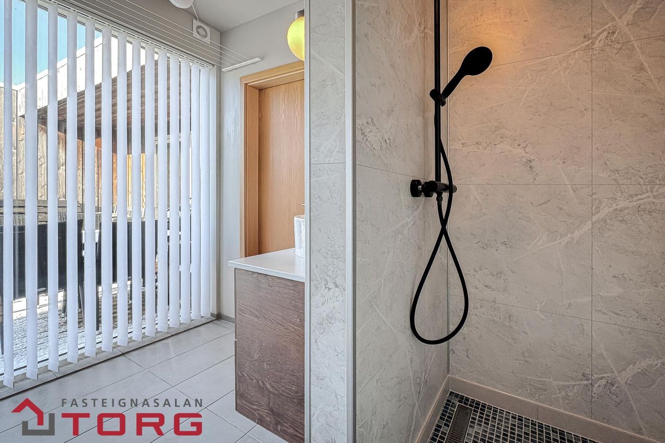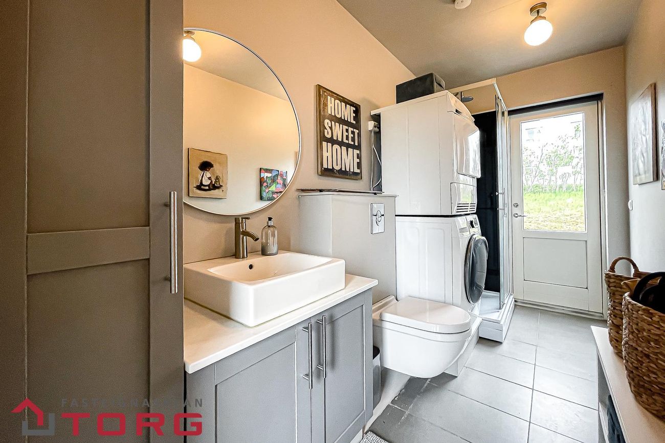 Þvottaherbergi með þvottavél, þurrkara, sturtu og salerni. Útgengi á verönd.