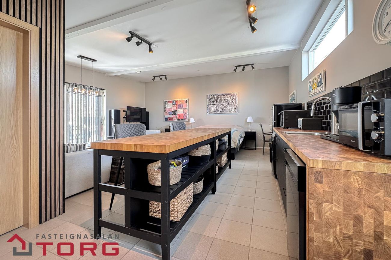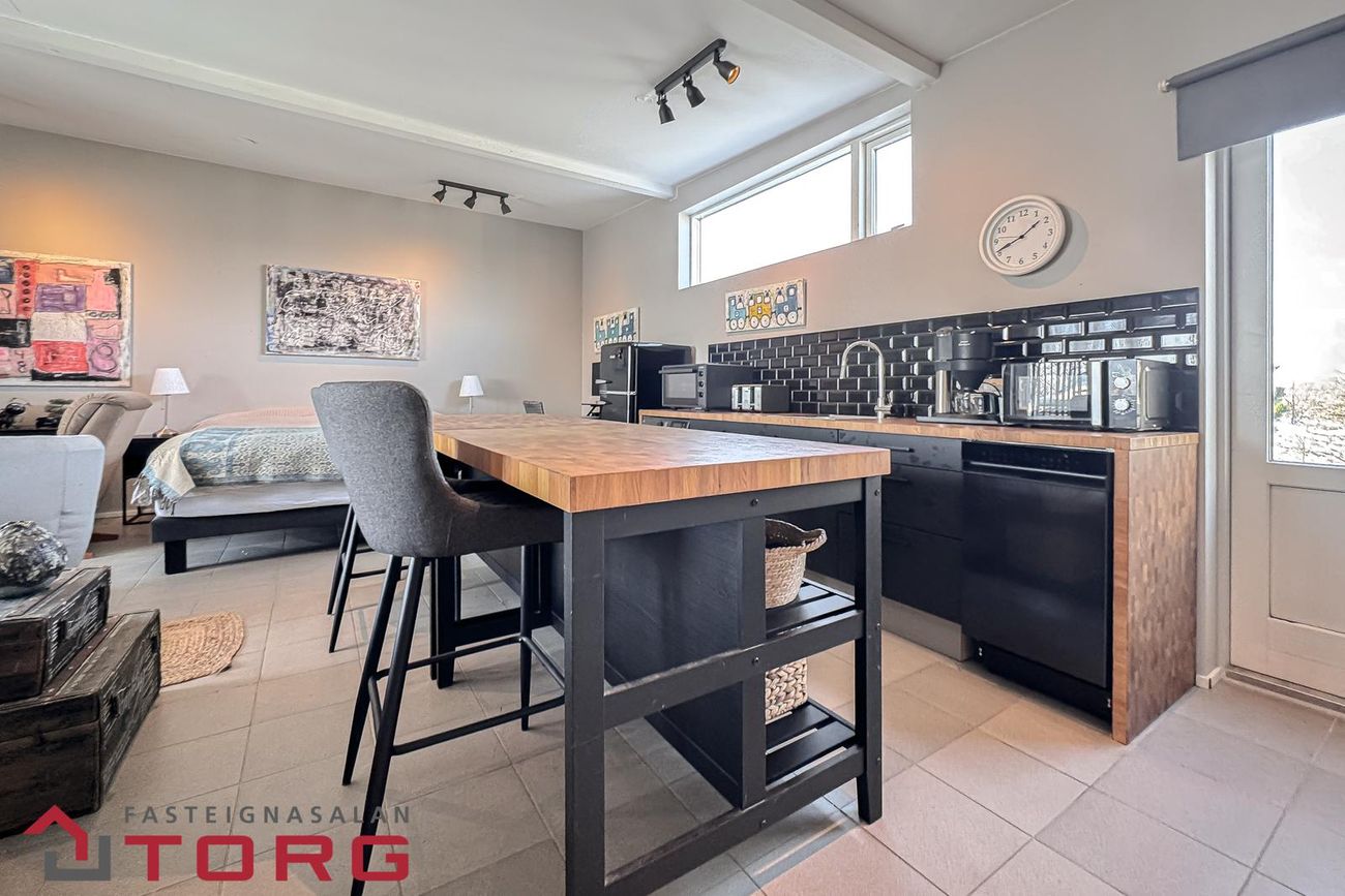 Stúdíóíbúð með sérinngangi, eldhúsinnréttingu og geymslu.