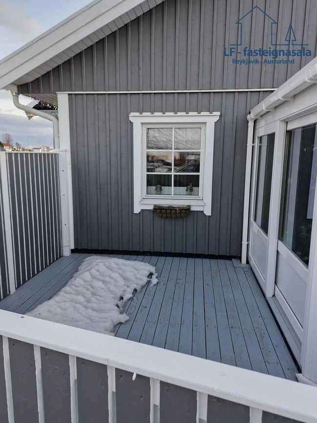 Stór sólstofa hefur verið byggð við húsið að vestanverðu.