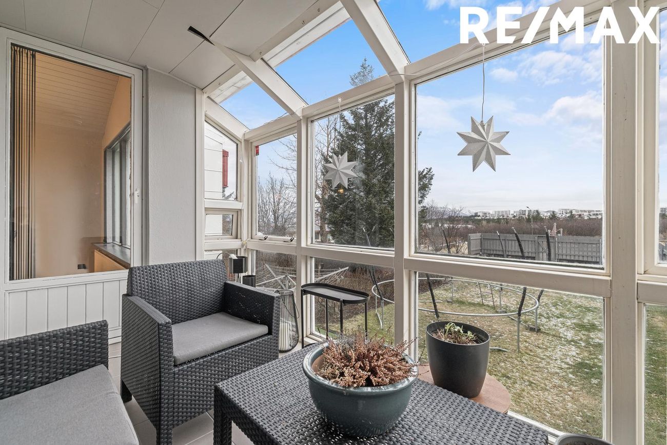 Yfirbyggðar svalir með útsýni til fjalla í norðri og vestri.